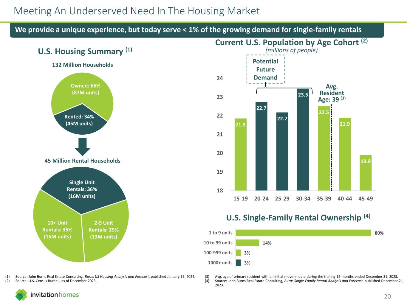 3% 3% 14% 80% 1000+ units 100-999 units 10 to 99 units 1 to 9 units Meeting An Underserved Need In The Housing Market We provide a unique experience, but today serve < 1% of the growing demand for single-family rentals U.S. Single-Family Rental Ownership (4) (1) Source: John Burns Real Estate Consulting, Burns US Housing Analysis and Forecast, published January 19, 2024. (2) Source: U.S. Census Bureau, as of December 2023. (3) Avg. age of primary resident with an initial move-in date during the trailing 12-months ended December 31, 2023. (4) Source: John Burns Real Estate Consulting, Burns Single-Family Rental Analysis and Forecast, published December 21, 2023. Current U.S. Population by Age Cohort (2) (millions of people) 21.9 22.7 22.2 23.5 22.5 21.9 19.9 18 19 20 21 22 23 24 15-19 20-24 25-29 30-34 35-39 40-44 45-49 Avg. Resident Age: 39 (3) Potential Future Demand Single Unit Rentals: 36% (16M units) 2-9 Unit Rentals: 29% (13M units) 10+ Unit Rentals: 35% (16M units) Owned: 66% (87M units) Rented: 34% (45M units) U.S. Housing Summary (1) 132 Million Households 45 Million Rental Households 20