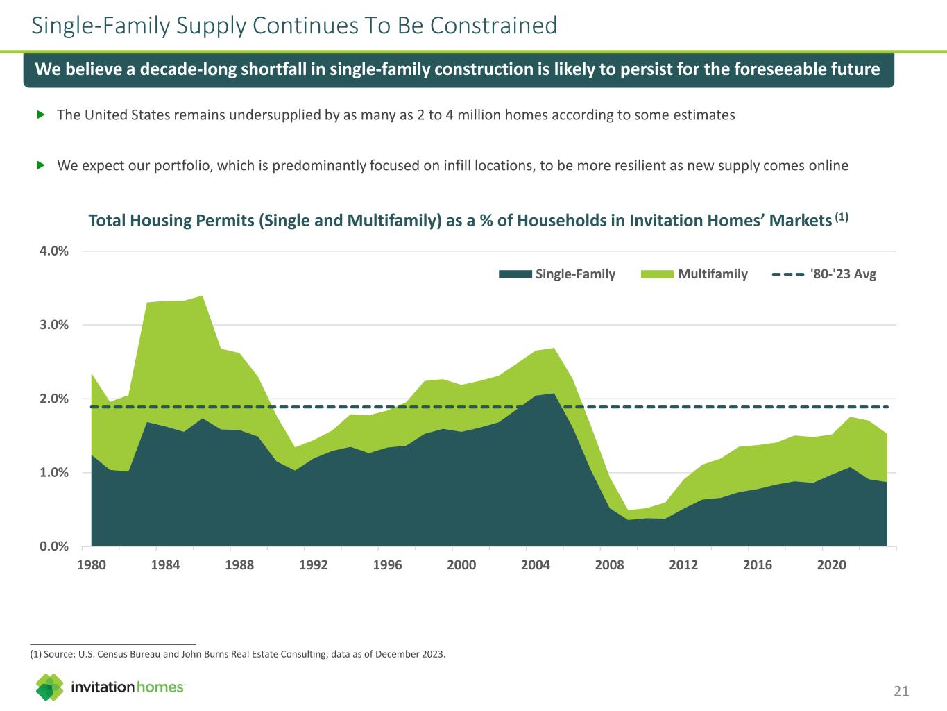 Single-Family Supply Continues To Be Constrained We believe a decade-long shortfall in single-family construction is likely to persist for the foreseeable future Total Housing Permits (Single and Multifamily) as a % of Households in Invitation Homes’ Markets (1) 0.0% 1.0% 2.0% 3.0% 4.0% 1980 1984 1988 1992 1996 2000 2004 2008 2012 2016 2020 Single-Family Multifamily '80-'23 Avg The United States remains undersupplied by as many as 2 to 4 million homes according to some estimates We expect our portfolio, which is predominantly focused on infill locations, to be more resilient as new supply comes online ________________________________________________ (1) Source: U.S. Census Bureau and John Burns Real Estate Consulting; data as of December 2023. 21