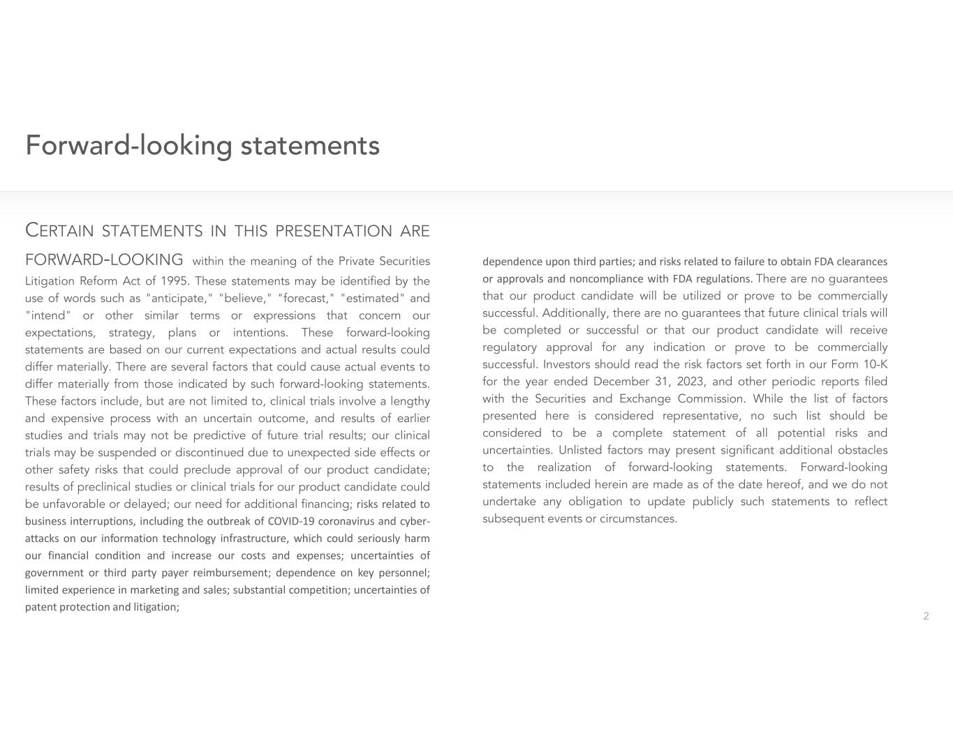due to unexpected side effects or other safety risks that could preclude approval of our product candidate; results of preclinical studies or clinical trials for our product candidate could be unfavorable or delayed; our need for additional financing; risks related to business interruptions, including the outbreak of COVID-19 coronavirus and cyber-attacks on our information technology infrastructure, which could seriously harm our financial condition and increase our costs and expenses; uncertainties of government or third party payer reimbursement; dependence on key personnel; limited experience in marketing and sales; substantial competition; uncertainties of patent protection and litigation; dependence upon third parties; and risks related to failure to obtain FDA clearances or approvals and noncompliance with FDA regulations. There are no guarantees that our product candidate will be utilized or prove to be commercially successful. Additionally, there are no guarantees that future clinical trials will be completed or successful or that our product candidate will receive regulatory approval for any indication or prove to be commercially successful. Investors should read the risk factors set forth in Cardiff Oncology's Form 10-K for the year ended December 31, 2023, and other periodic reports filed with the Securities and Exchange Commission. While the list of factors presented here is considered representative, no such list should be considered to be a complete statement of all potential risks and uncertainties. Unlisted factors may present significant additional obstacles to the realization of forward-looking statements. Forward-looking statements included herein are made as of the date hereof, and Cardiff Oncology does not undertake any obligation to update publicly such statements to reflect subsequent events or circumstances.
