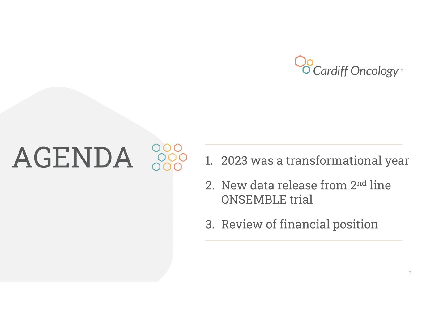 1. 2023 was a transformational year 2. New data release from 2nd line ONSEMBLE trial 3. Review of financial position AGENDA