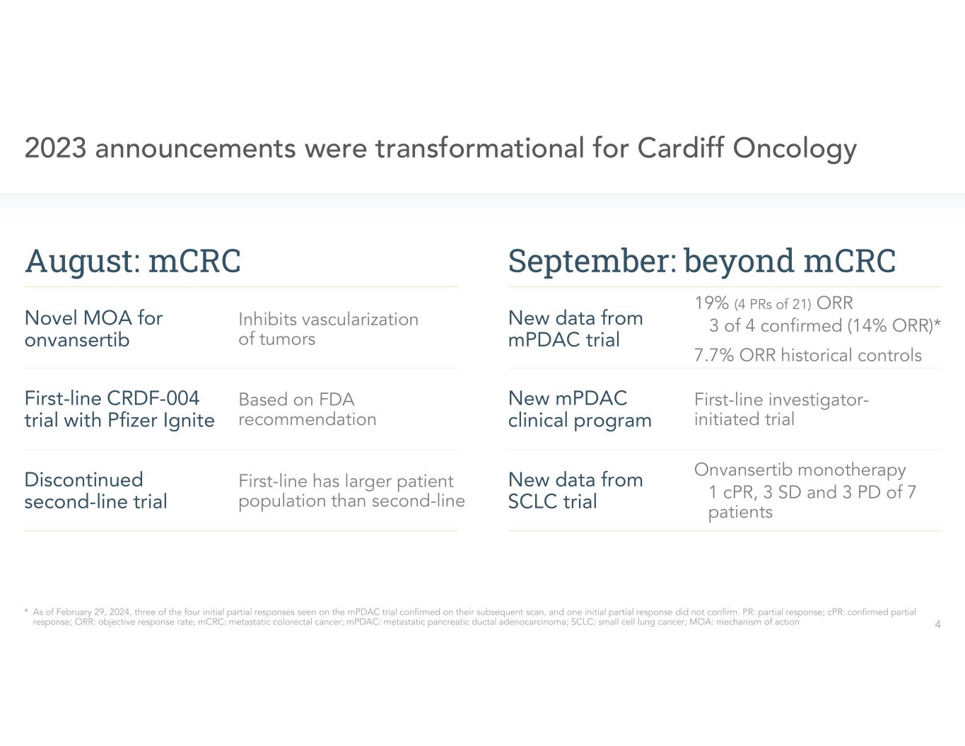 •Announced first patient dosed in its randomized first-line Phase 2 trial, CRDF-004, for patients with RAS-mutated metastatic colorectal cancer. The trial, whose clinical execution is being conducted by Pfizer Ignite, is designed to confirm the dose of onvansertib for a subsequent registrational trial, and generate safety and efficacy data for onvansertib when added to standard of care (SoC) vs. SoC alone. Interim topline results from CRDF-004 are expected in mid-2024. Contingent upon the results, Cardiff Oncology will initiate a Phase 3, randomized trial, CRDF-005, with registrational intent.
