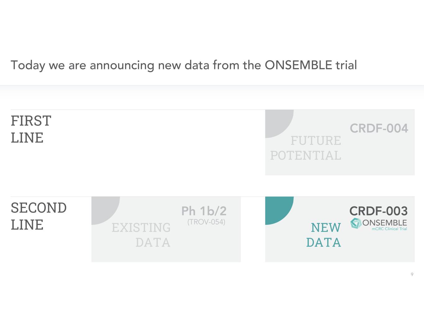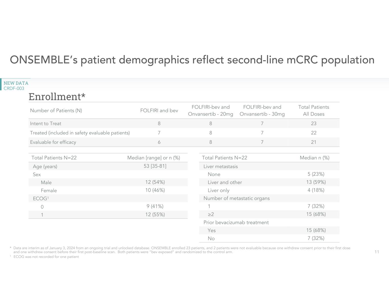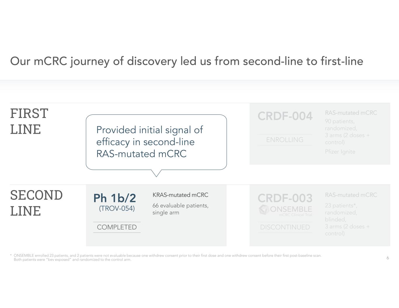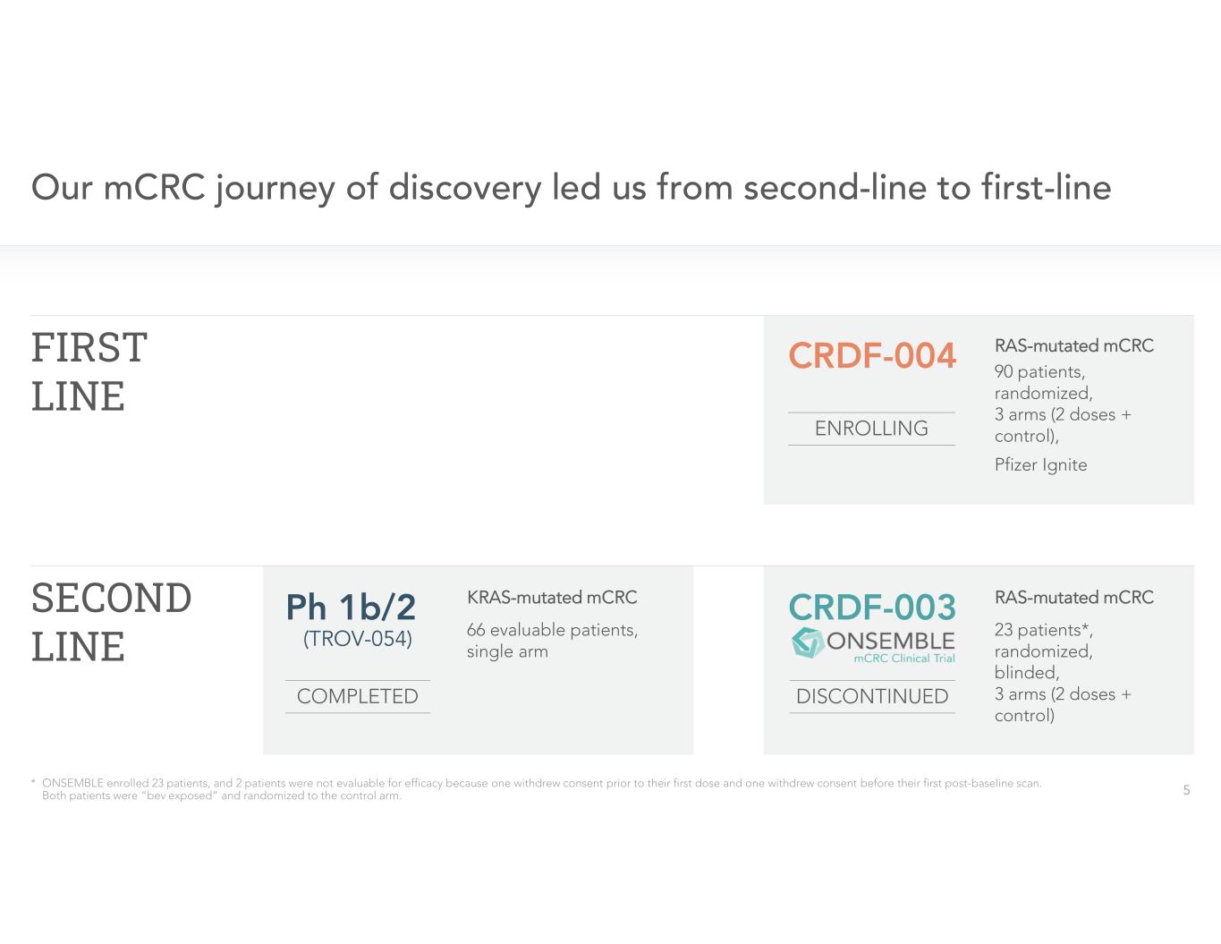- Company discontinued the ONSEMBLE trial in August 2023 to shift focus of clinical development program to first-line RAS-mutated mCRC in agreement with the FDA -
