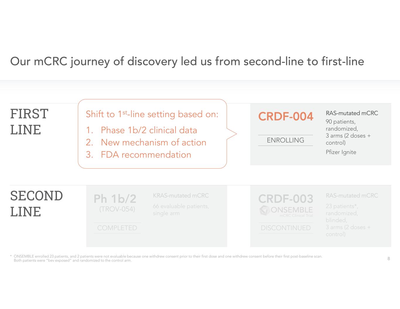 In August 2023, Cardiff Oncology discontinued enrollment in the second-line ONSEMBLE trial to focus on its new lead program in first-line RAS-mutated mCRC. This decision was driven by the fact that both trials essentially test the same clinical hypothesis, the importance of deploying the company's capital efficiently, and the FDA's suggestion that Cardiff Oncology consider focusing on the first-line RAS-mutated mCRC setting given the lack of any new therapies approved in this large cancer indication in the last 20 years.