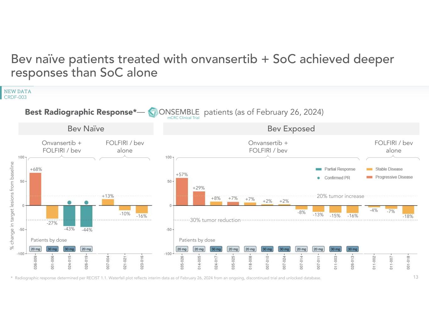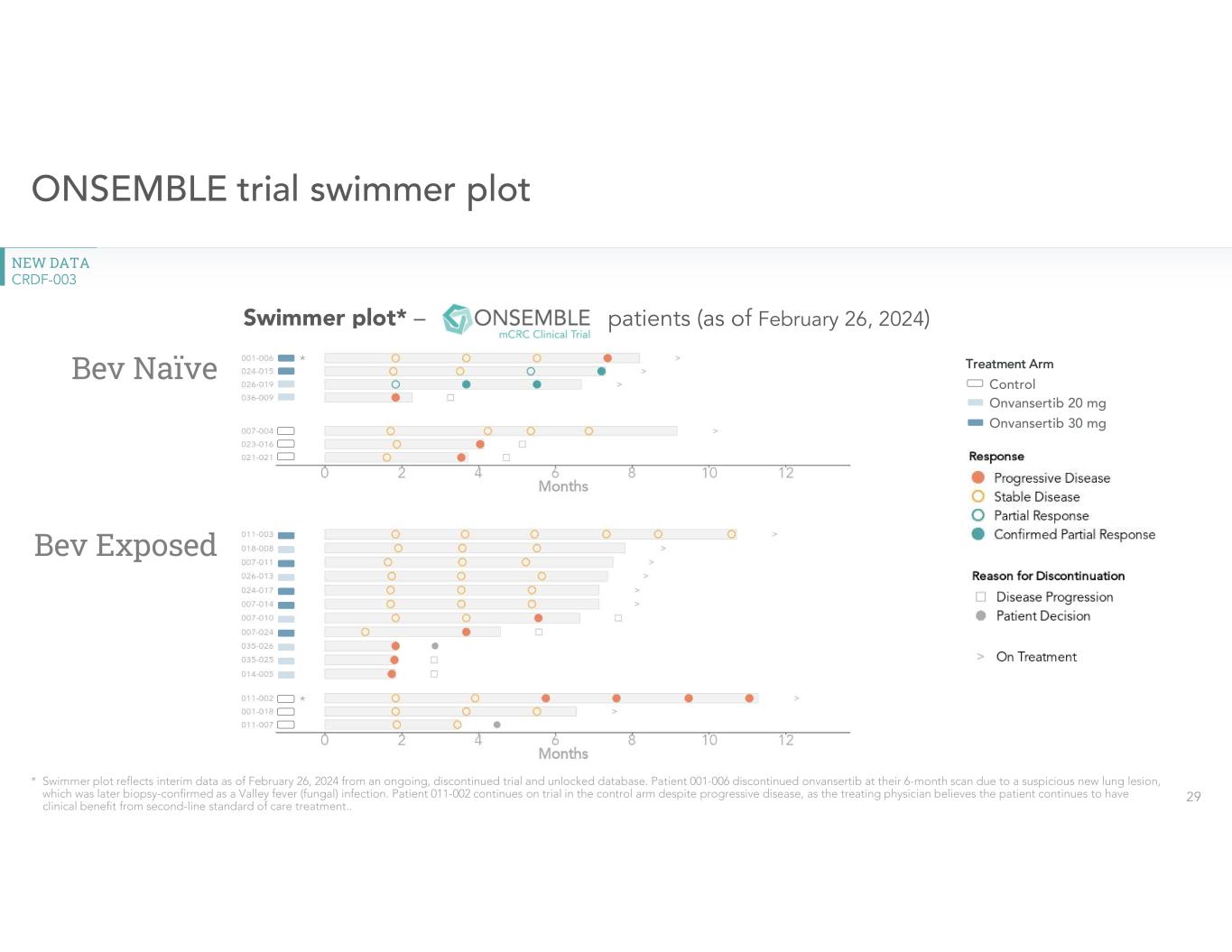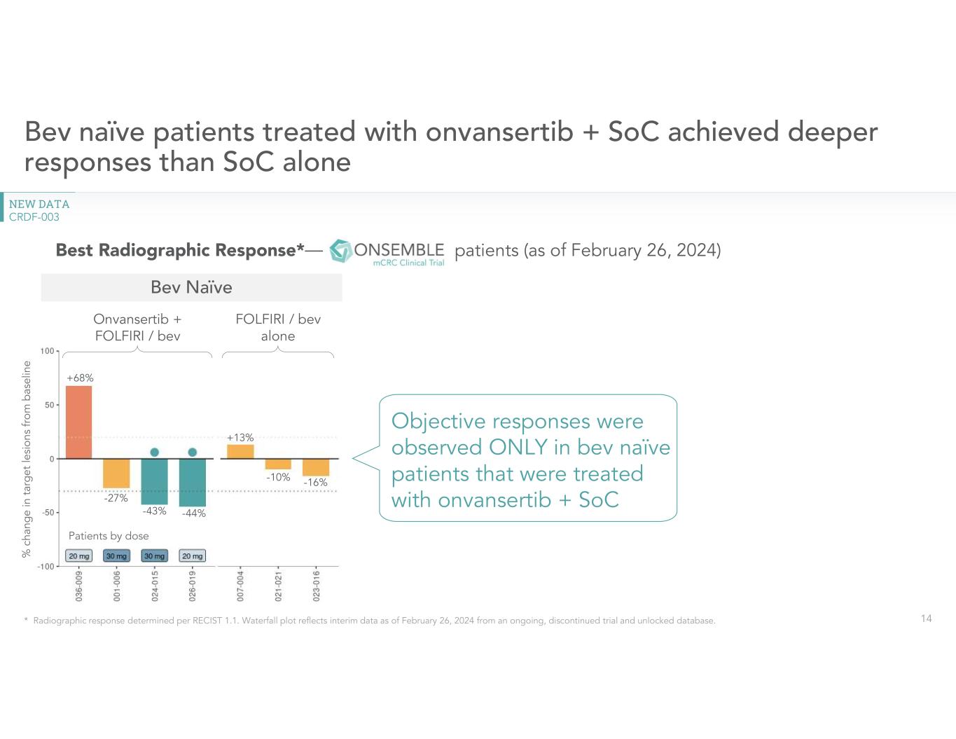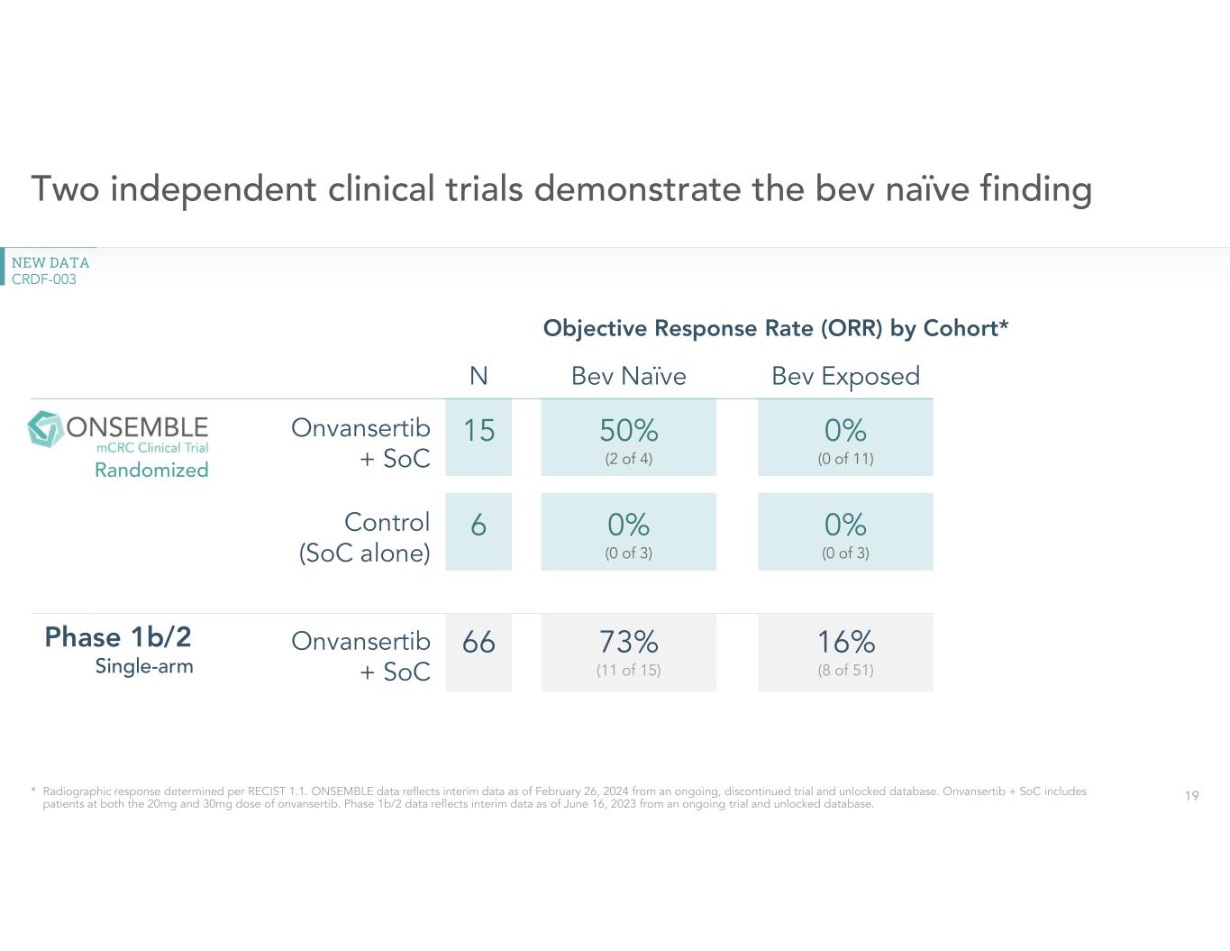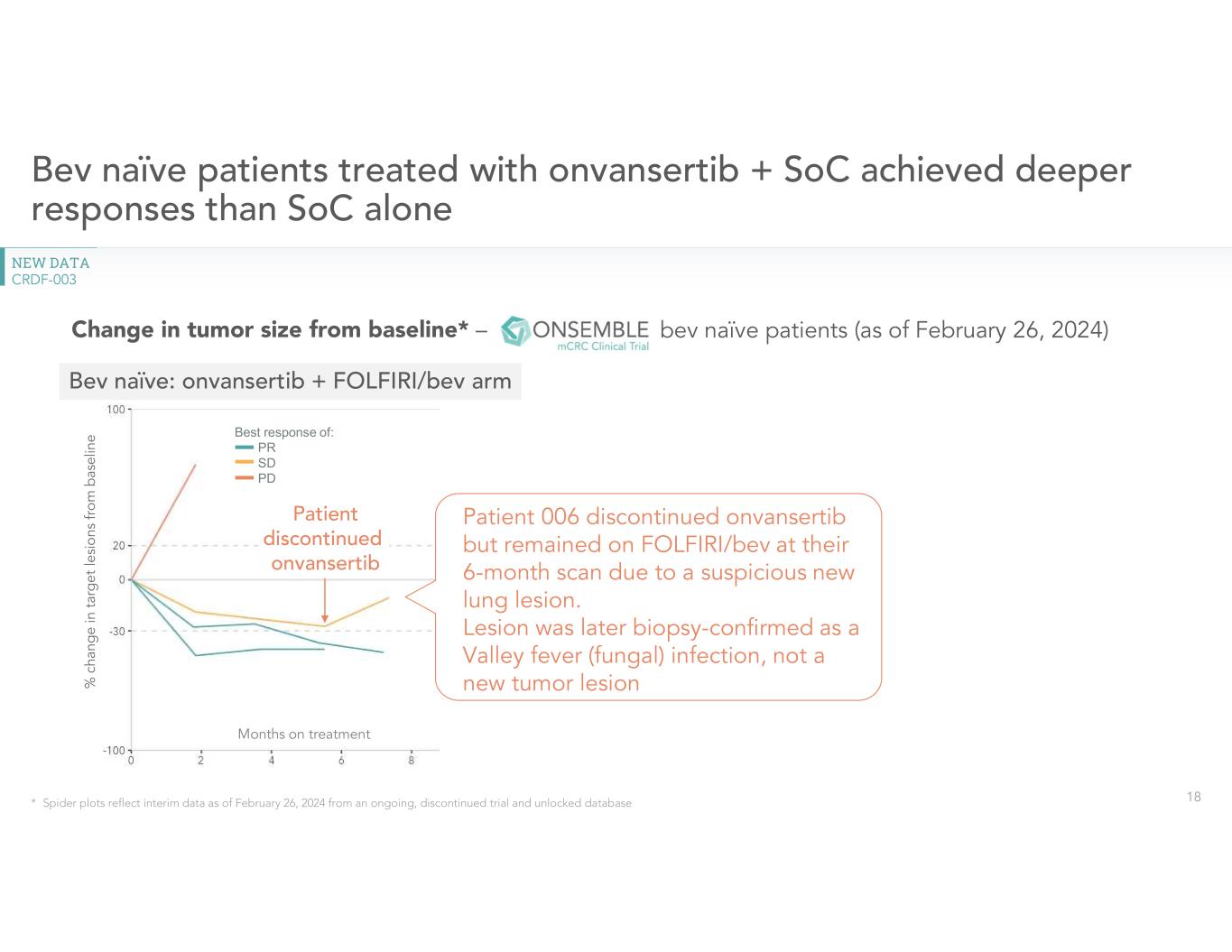 •Provided a clinical update on Phase 2 randomized second-line ONSEMBLE trial in mCRC. New clinical data from discontinued second-line randomized ONSEMBLE trial provides further evidence of onvansertib’s improvement of the efficacy for standard of care therapy in bev naïve patients. In the trial, patients who were bev naïve demonstrated an objective response rate (ORR) of 50% on onvansertib. No clinical responses were observed in patients who received standard of care with FOLFIRI/bev or patients who were previously exposed to bev. For additional information, please refer to the press release issued by the Company today which provided an update on the ONSEMBLE trial.