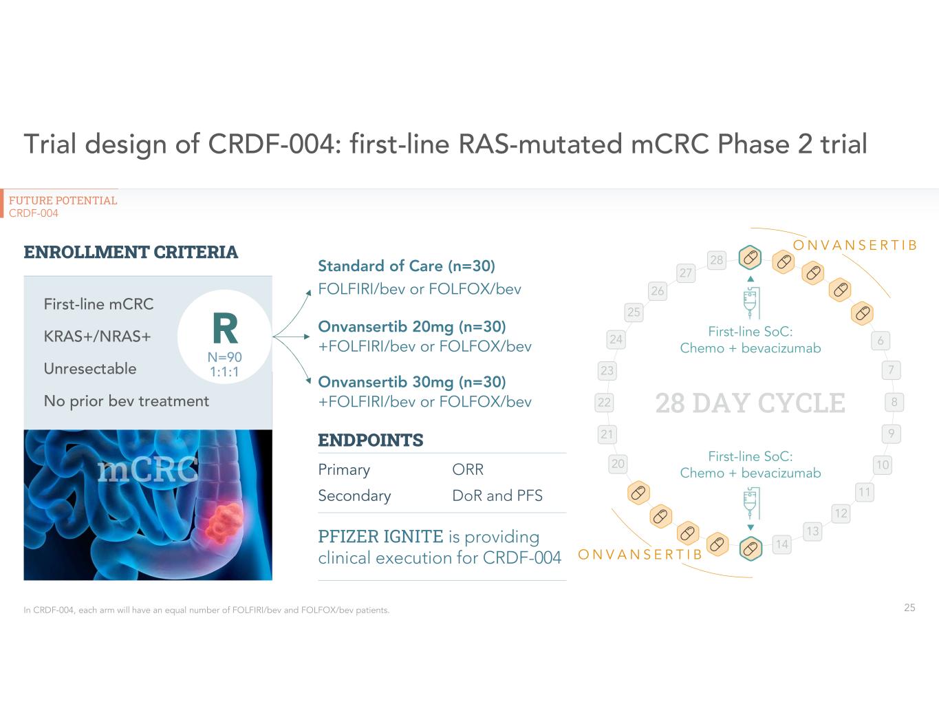 “We are pleased that the CRDF-004 trial is underway and look forward to providing clinical development support to advance onvansertib in RAS-mutated mCRC, which we believe has the potential to make an impact in patients with metastatic colorectal cancer,” said Adam Schayowitz, Ph.D., MBA, Head, Product Teams, Portfolio & Program Management at Pfizer Oncology, and member of Cardiff Oncology’s Scientific Advisory Board.