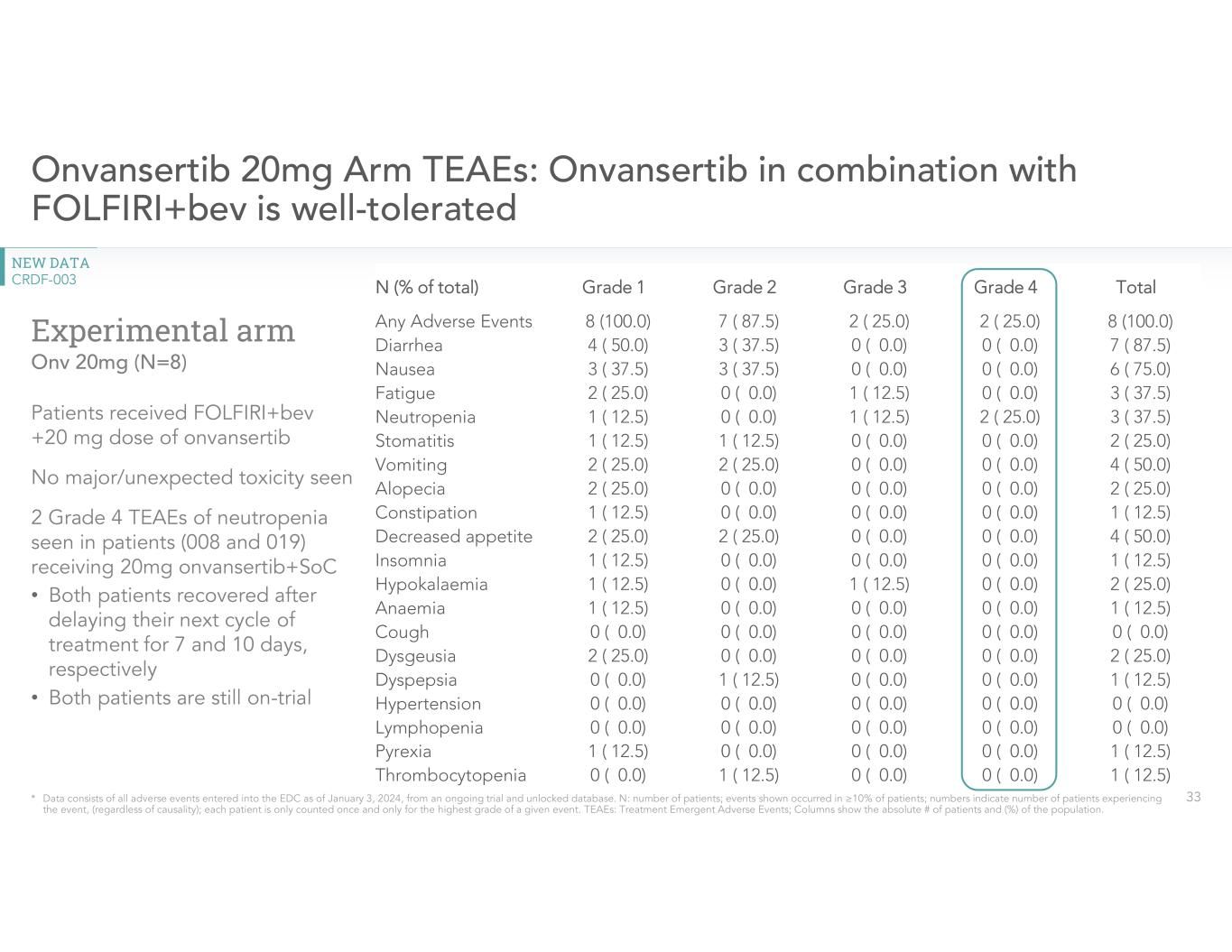 •Two Grade 4 TEAEs of neutropenia were seen in patients receiving 20 mg Onvansertib + SOC