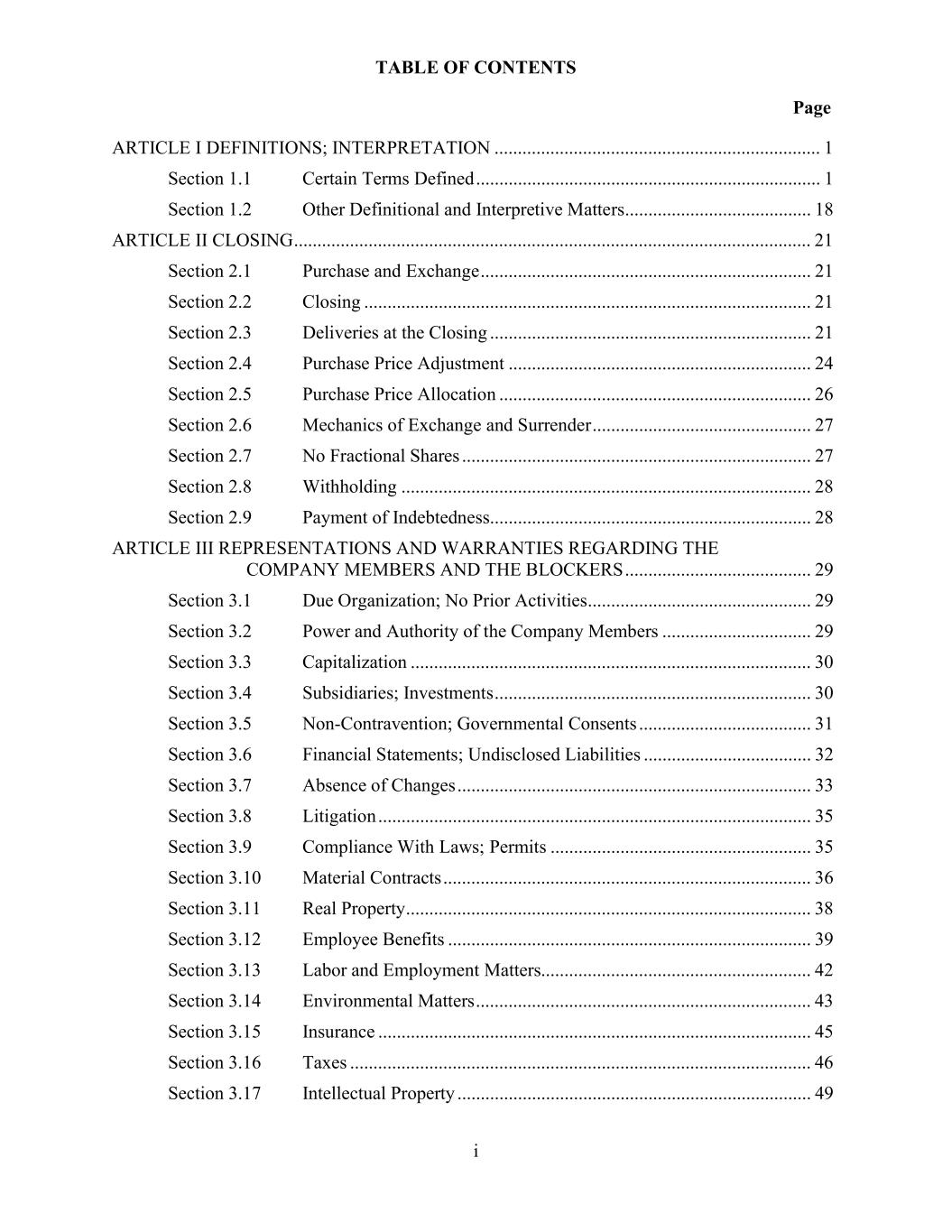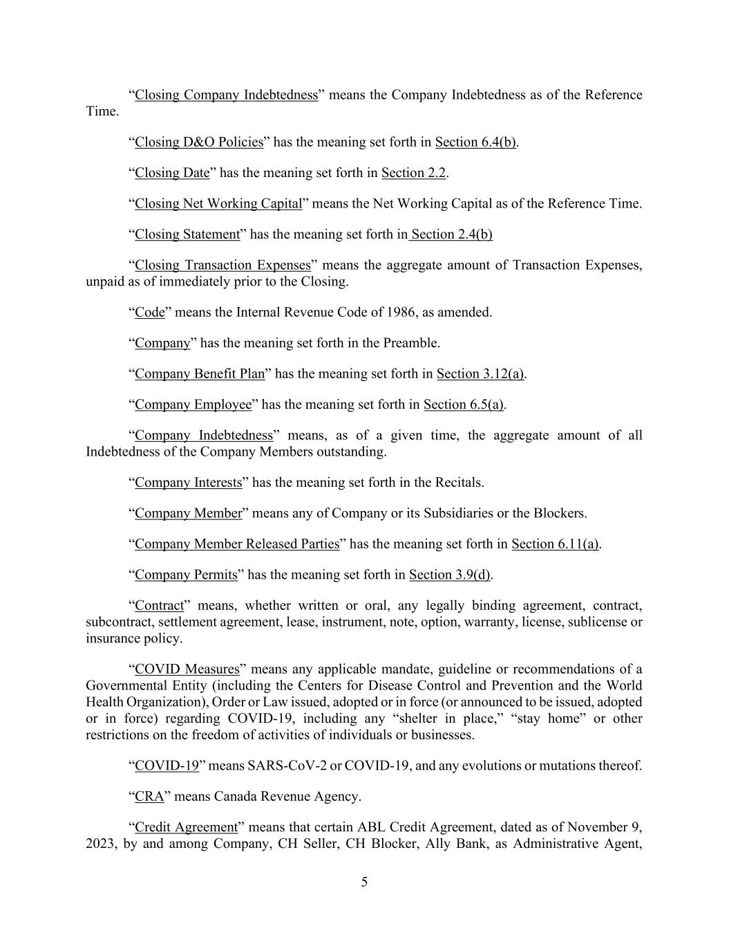 i AmericasActive:19586302.10 TABLE OF CONTENTS Page SECTION 1. DEFINITIONS; RULES OF CONSTRUCTION ............................................................... 1 1.1 Definitions .......................................................................................................................... 1 1.2 Accounting Terms ............................................................................................................. 36 1.3 Uniform Commercial Code; PPSA ................................................................................... 37 1.4 Certain Matters of Construction ........................................................................................ 37 1.5 Division ............................................................................................................................. 37 1.6 Currency Equivalents ........................................................................................................ 37 1.6.1. Calculations ......................................................................................................... 37 1.6.2. Judgments ............................................................................................................ 38 1.7 Limited Condition Transactions ........................................................................................ 38 SECTION 2. CREDIT FACILITIES ...................................................................................................... 40 2.1 Revolver Commitment ...................................................................................................... 40 2.1.1. Revolver Loans .................................................................................................... 40 2.1.2. Revolver Notes .................................................................................................... 40 2.1.3. Use of Proceeds ................................................................................................... 40 2.1.4. Voluntary Reduction or Termination of Revolver Commitments ........................ 40 2.1.5. Overadvances ....................................................................................................... 41 2.1.6. Protective Advances ............................................................................................. 41 2.1.7. Increase in Revolver Commitments ..................................................................... 41 2.2 [Reserved] ......................................................................................................................... 42 2.3 Letter of Credit Facility .................................................................................................... 42 2.3.1. Issuance of Letters of Credit ................................................................................ 42 2.3.2. Reimbursement; Participations ............................................................................ 43 2.3.3. Cash Collateral ..................................................................................................... 44 2.3.4. Resignation of Issuing Bank ................................................................................ 44 SECTION 3. INTEREST, FEES AND CHARGES................................................................................ 45 3.1 Interest .............................................................................................................................. 45 3.1.1. Rates and Payment of Interest ............................................................................. 45 3.1.2. Application of Term SOFR to Outstanding Loans ............................................... 45 3.1.3. Interest Periods .................................................................................................... 46 3.2 Fees ................................................................................................................................... 46