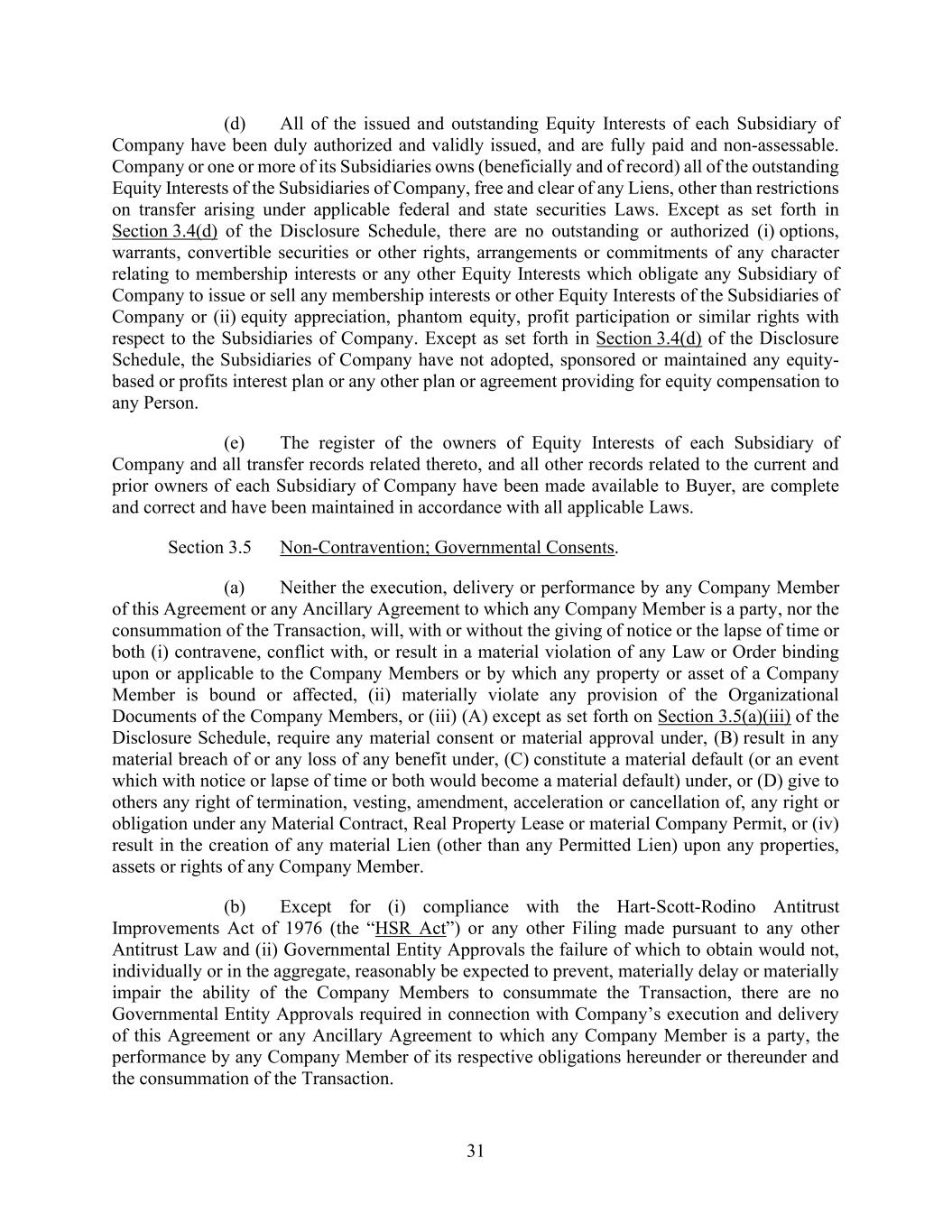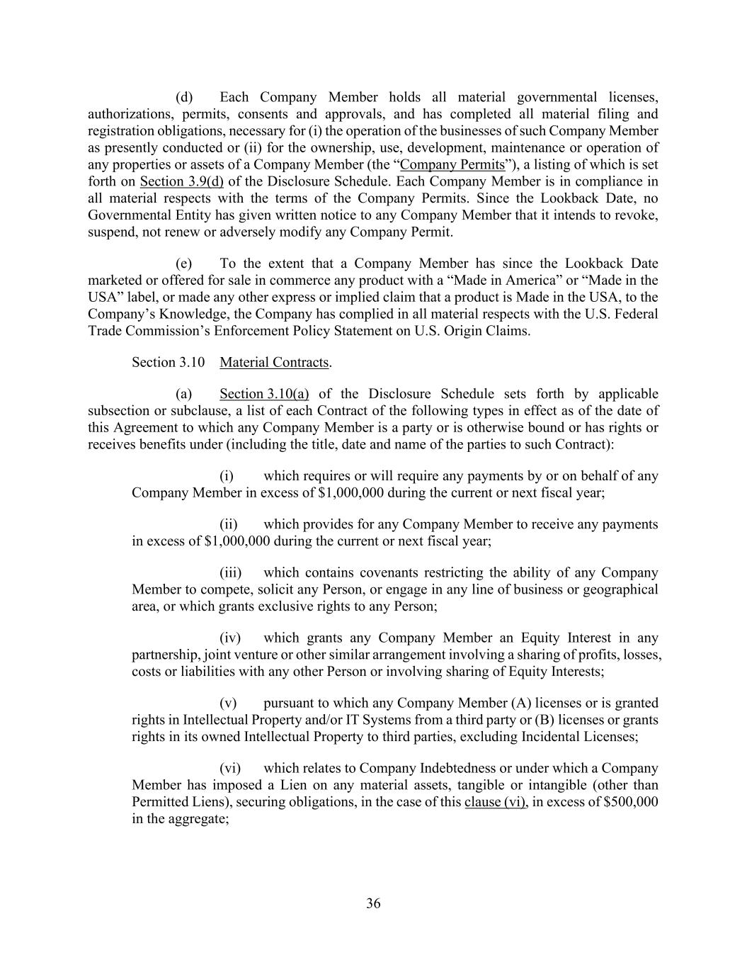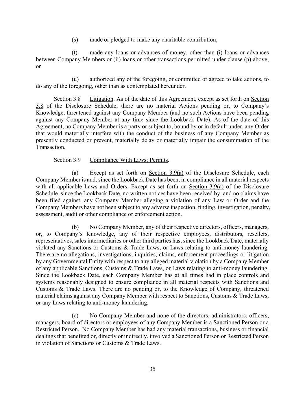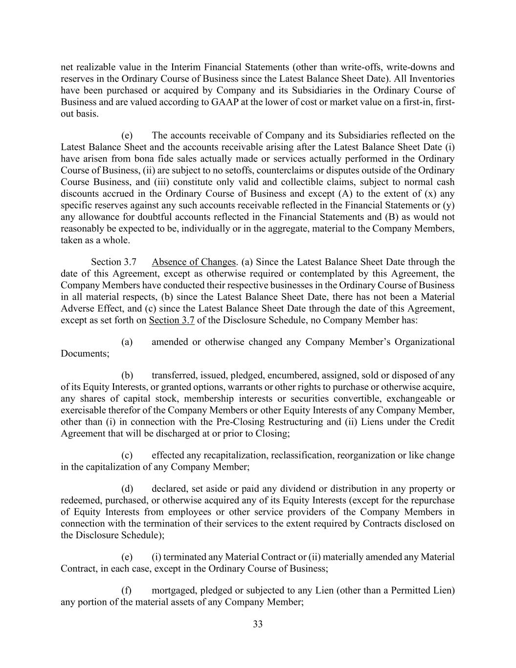 v AmericasActive:19586302.10 9.1.12. Governmental Approvals ..................................................................................... 72 9.1.13. Compliance with Laws ........................................................................................ 72 9.1.14. [Reserved] ............................................................................................................ 72 9.1.15. Burdensome Contracts ......................................................................................... 72 9.1.16. Litigation .............................................................................................................. 72 9.1.17. No Defaults .......................................................................................................... 72 9.1.18. ERISA .................................................................................................................. 72 9.1.19. [Reserved] ............................................................................................................ 73 9.1.20. [Reserved]. ........................................................................................................... 73 9.1.21. [Reserved] ............................................................................................................ 73 9.1.22. Not a Regulated Entity ......................................................................................... 73 9.1.23. Margin Stock ........................................................................................................ 74 9.1.24. Sanctions .............................................................................................................. 74 9.1.25. Anti-Corruption Laws; Anti-Terrorism Laws ...................................................... 74 9.1.26. Accuracy of Borrowing Base ............................................................................... 74 9.2 Complete Disclosure ......................................................................................................... 74 SECTION 10. COVENANTS AND CONTINUING AGREEMENTS ................................................... 74 10.1 Affirmative Covenants ...................................................................................................... 74 10.1.1. Inspections; Appraisals ........................................................................................ 74 10.1.2. Financial and Other Information .......................................................................... 75 10.1.3. Notices ................................................................................................................. 76 10.1.4. Landlord and Storage Agreements ....................................................................... 77 10.1.5. Compliance with Laws ........................................................................................ 77 10.1.6. Taxes .................................................................................................................... 77 10.1.7. Insurance .............................................................................................................. 77 10.1.8. Licenses ............................................................................................................... 77 10.1.9. Future Subsidiaries .............................................................................................. 77 10.1.10. Post-Closing Obligations ..................................................................................... 78 10.2 Negative Covenants .......................................................................................................... 78 10.2.1. Permitted Debt ..................................................................................................... 78 10.2.2. Permitted Liens .................................................................................................... 80 10.2.3. [Reserved] ............................................................................................................ 81 10.2.4. Distributions ........................................................................................................ 81 10.2.5. Investments .......................................................................................................... 81