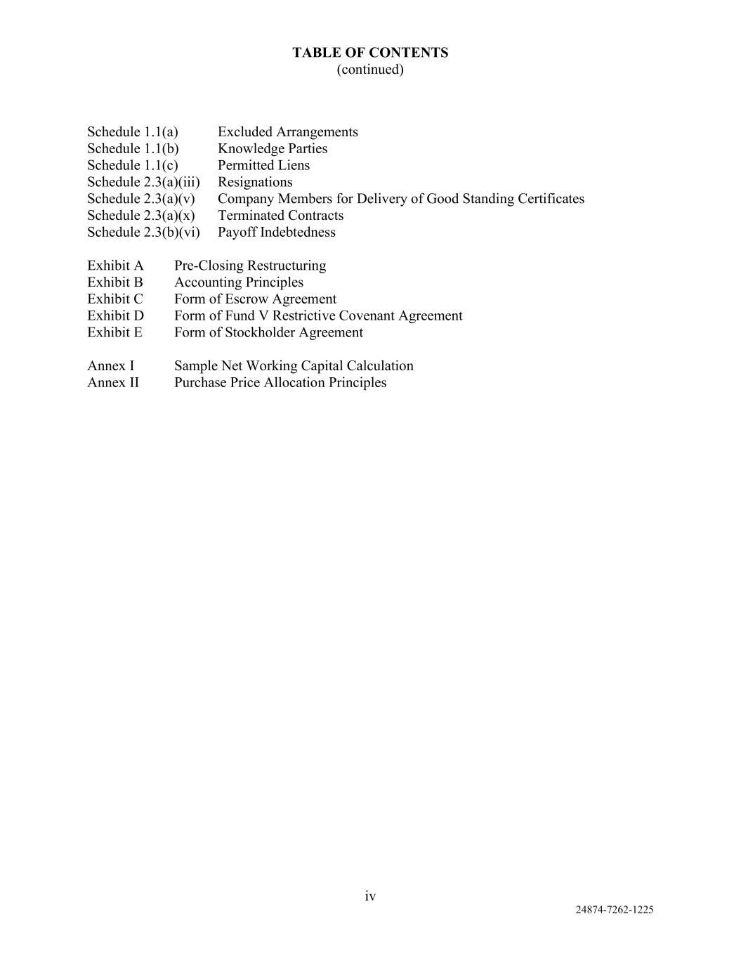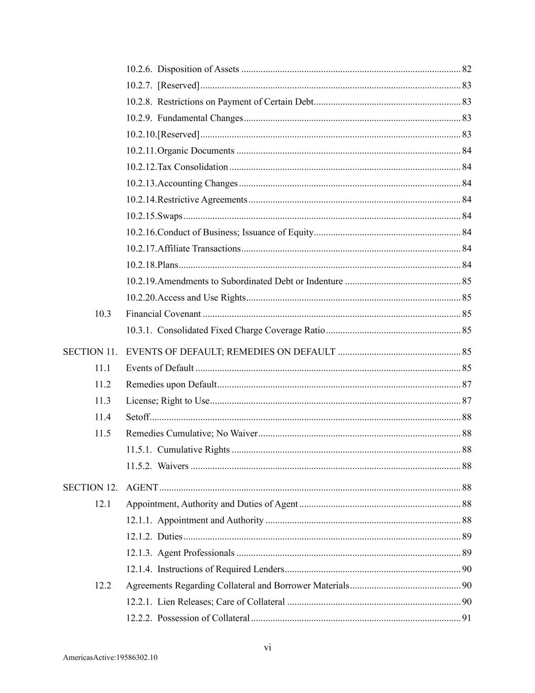 vi AmericasActive:19586302.10 10.2.6. Disposition of Assets ........................................................................................... 82 10.2.7. [Reserved] ............................................................................................................ 83 10.2.8. Restrictions on Payment of Certain Debt ............................................................. 83 10.2.9. Fundamental Changes .......................................................................................... 83 10.2.10. [Reserved] ............................................................................................................ 83 10.2.11. Organic Documents ............................................................................................. 84 10.2.12. Tax Consolidation ................................................................................................ 84 10.2.13. Accounting Changes ............................................................................................ 84 10.2.14. Restrictive Agreements ........................................................................................ 84 10.2.15. Swaps ................................................................................................................... 84 10.2.16. Conduct of Business; Issuance of Equity............................................................. 84 10.2.17. Affiliate Transactions ........................................................................................... 84 10.2.18. Plans ..................................................................................................................... 84 10.2.19. Amendments to Subordinated Debt or Indenture ................................................ 85 10.2.20. Access and Use Rights ......................................................................................... 85 10.3 Financial Covenant ........................................................................................................... 85 10.3.1. Consolidated Fixed Charge Coverage Ratio ........................................................ 85 SECTION 11. EVENTS OF DEFAULT; REMEDIES ON DEFAULT ................................................... 85 11.1 Events of Default .............................................................................................................. 85 11.2 Remedies upon Default ..................................................................................................... 87 11.3 License; Right to Use ........................................................................................................ 87 11.4 Setoff ................................................................................................................................. 88 11.5 Remedies Cumulative; No Waiver .................................................................................... 88 11.5.1. Cumulative Rights ............................................................................................... 88 11.5.2. Waivers ................................................................................................................ 88 SECTION 12. AGENT ............................................................................................................................. 88 12.1 Appointment, Authority and Duties of Agent ................................................................... 88 12.1.1. Appointment and Authority ................................................................................. 88 12.1.2. Duties ................................................................................................................... 89 12.1.3. Agent Professionals ............................................................................................. 89 12.1.4. Instructions of Required Lenders ......................................................................... 90 12.2 Agreements Regarding Collateral and Borrower Materials .............................................. 90 12.2.1. Lien Releases; Care of Collateral ........................................................................ 90 12.2.2. Possession of Collateral ....................................................................................... 91
