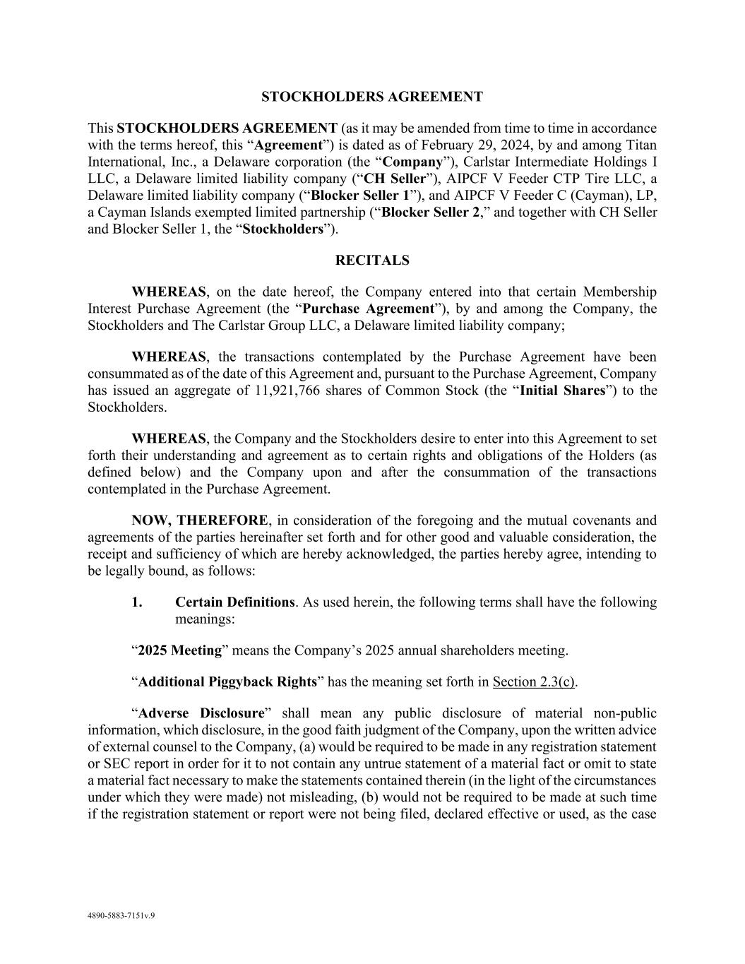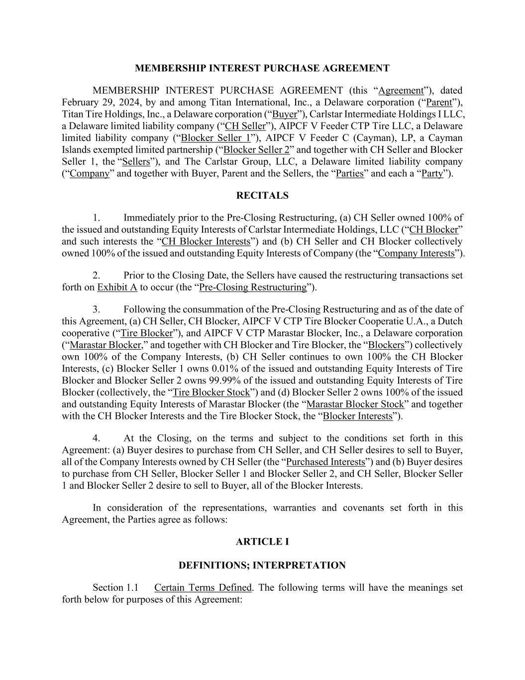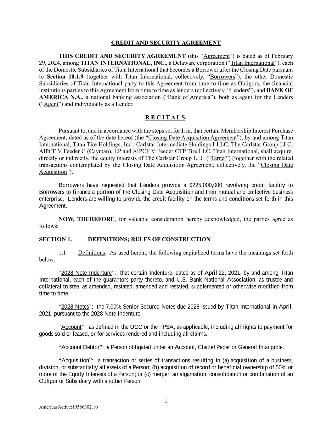1 AmericasActive:19586302.10 CREDIT AND SECURITY AGREEMENT THIS CREDIT AND SECURITY AGREEMENT (this “Agreement”) is dated as of February 29, 2024, among TITAN INTERNATIONAL, INC., a Delaware corporation (“Titan International”), each of the Domestic Subsidiaries of Titan International that becomes a Borrower after the Closing Date pursuant to Section 10.1.9 (together with Titan International, collectively, “Borrowers”), the other Domestic Subsidiaries of Titan International party to this Agreement from time to time as Obligors, the financial institutions parties to this Agreement from time to time as lenders (collectively, “Lenders”), and BANK OF AMERICA N.A., a national banking association (“Bank of America”), both as agent for the Lenders (“Agent”) and individually as a Lender. R E C I T A L S: Pursuant to, and in accordance with the steps set forth in, that certain Membership Interest Purchase Agreement, dated as of the date hereof (the “Closing Date Acquisition Agreement”), by and among Titan International, Titan Tire Holdings, Inc., Carlstar Intermediate Holdings I LLC, The Carlstar Group LLC, AIPCF V Feeder C (Cayman), LP and AIPCF V Feeder CTP Tire LLC, Titan International, shall acquire, directly or indirectly, the equity interests of The Carlstar Group LLC (“Target”) (together with the related transactions contemplated by the Closing Date Acquisition Agreement, collectively, the “Closing Date Acquisition”). Borrowers have requested that Lenders provide a $225,000,000 revolving credit facility to Borrowers to finance a portion of the Closing Date Acquisition and their mutual and collective business enterprise. Lenders are willing to provide the credit facility on the terms and conditions set forth in this Agreement. NOW, THEREFORE, for valuable consideration hereby acknowledged, the parties agree as follows: SECTION 1. DEFINITIONS; RULES OF CONSTRUCTION 1.1 Definitions. As used herein, the following capitalized terms have the meanings set forth below: “2028 Note Indenture”: that certain Indenture, dated as of April 22, 2021, by and among Titan International, each of the guarantors party thereto, and U.S. Bank National Association, as trustee and collateral trustee, as amended, restated, amended and restated, supplemented or otherwise modified from time to time. “2028 Notes”: the 7.00% Senior Secured Notes due 2028 issued by Titan International in April, 2021, pursuant to the 2028 Note Indenture. “Account”: as defined in the UCC or the PPSA, as applicable, including all rights to payment for goods sold or leased, or for services rendered and including all claims. “Account Debtor”: a Person obligated under an Account, Chattel Paper or General Intangible. “Acquisition”: a transaction or series of transactions resulting in (a) acquisition of a business, division, or substantially all assets of a Person; (b) acquisition of record or beneficial ownership of 50% or more of the Equity Interests of a Person; or (c) merger, amalgamation, consolidation or combination of an Obligor or Subsidiary with another Person.