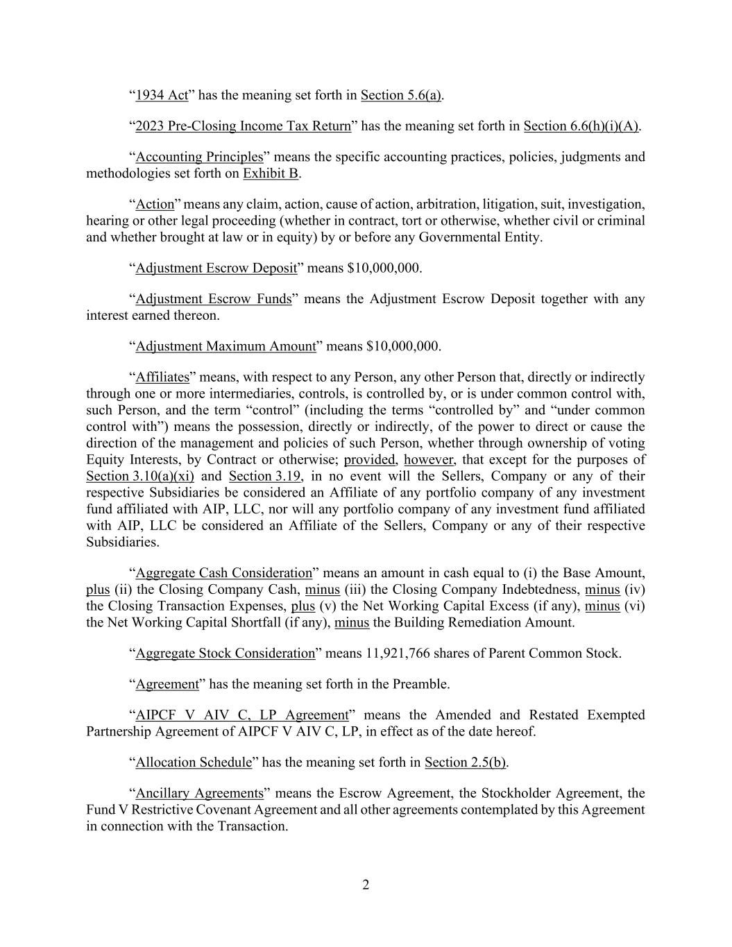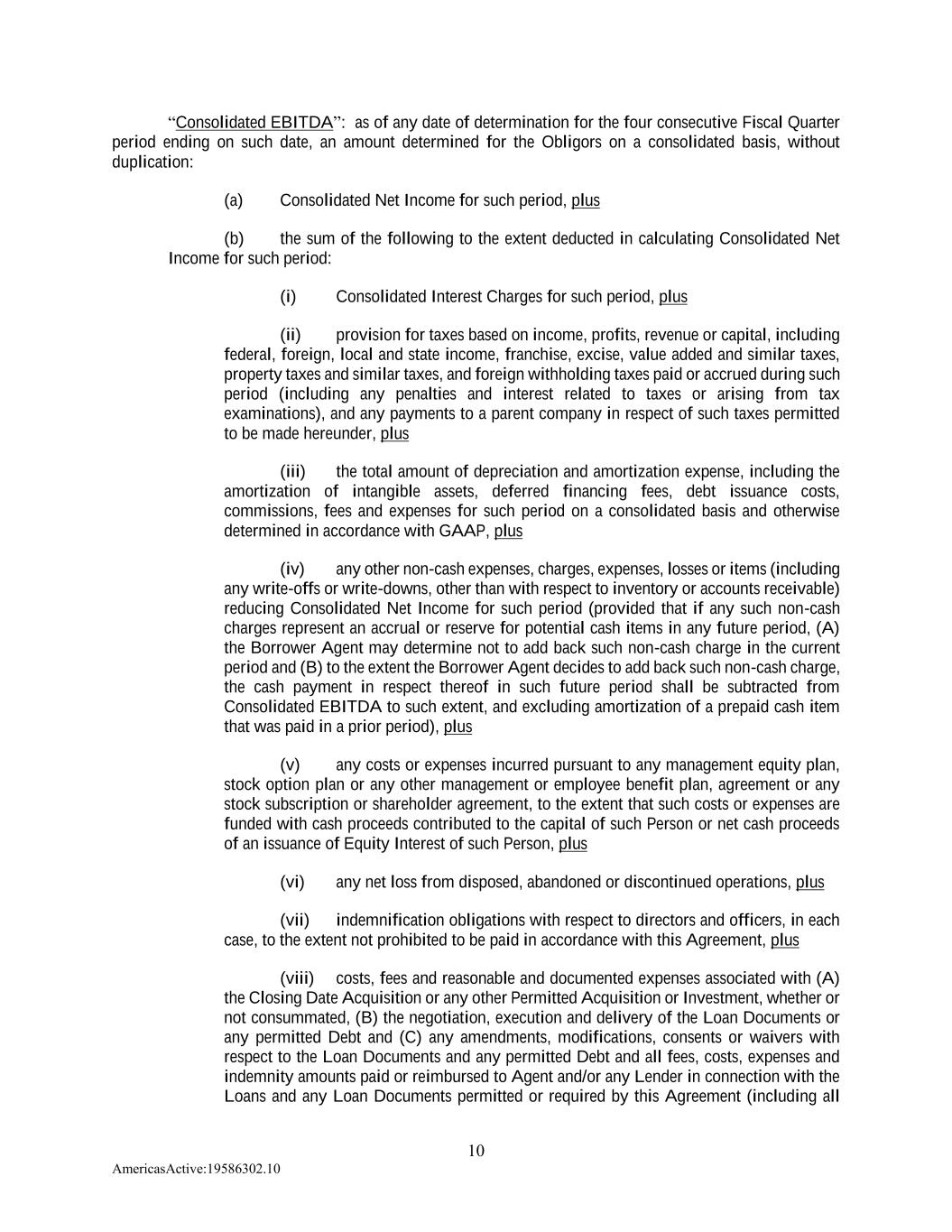 10 AmericasActive:19586302.10 “Consolidated EBITDA”: as of any date of determination for the four consecutive Fiscal Quarter period ending on such date, an amount determined for the Obligors on a consolidated basis, without duplication: (a) Consolidated Net Income for such period, plus (b) the sum of the following to the extent deducted in calculating Consolidated Net Income for such period: (i) Consolidated Interest Charges for such period, plus (ii) provision for taxes based on income, profits, revenue or capital, including federal, foreign, local and state income, franchise, excise, value added and similar taxes, property taxes and similar taxes, and foreign withholding taxes paid or accrued during such period (including any penalties and interest related to taxes or arising from tax examinations), and any payments to a parent company in respect of such taxes permitted to be made hereunder, plus (iii) the total amount of depreciation and amortization expense, including the amortization of intangible assets, deferred financing fees, debt issuance costs, commissions, fees and expenses for such period on a consolidated basis and otherwise determined in accordance with GAAP, plus (iv) any other non-cash expenses, charges, expenses, losses or items (including any write-offs or write-downs, other than with respect to inventory or accounts receivable) reducing Consolidated Net Income for such period (provided that if any such non-cash charges represent an accrual or reserve for potential cash items in any future period, (A) the Borrower Agent may determine not to add back such non-cash charge in the current period and (B) to the extent the Borrower Agent decides to add back such non-cash charge, the cash payment in respect thereof in such future period shall be subtracted from Consolidated EBITDA to such extent, and excluding amortization of a prepaid cash item that was paid in a prior period), plus (v) any costs or expenses incurred pursuant to any management equity plan, stock option plan or any other management or employee benefit plan, agreement or any stock subscription or shareholder agreement, to the extent that such costs or expenses are funded with cash proceeds contributed to the capital of such Person or net cash proceeds of an issuance of Equity Interest of such Person, plus (vi) any net loss from disposed, abandoned or discontinued operations, plus (vii) indemnification obligations with respect to directors and officers, in each case, to the extent not prohibited to be paid in accordance with this Agreement, plus (viii) costs, fees and reasonable and documented expenses associated with (A) the Closing Date Acquisition or any other Permitted Acquisition or Investment, whether or not consummated, (B) the negotiation, execution and delivery of the Loan Documents or any permitted Debt and (C) any amendments, modifications, consents or waivers with respect to the Loan Documents and any permitted Debt and all fees, costs, expenses and indemnity amounts paid or reimbursed to Agent and/or any Lender in connection with the Loans and any Loan Documents permitted or required by this Agreement (including all
