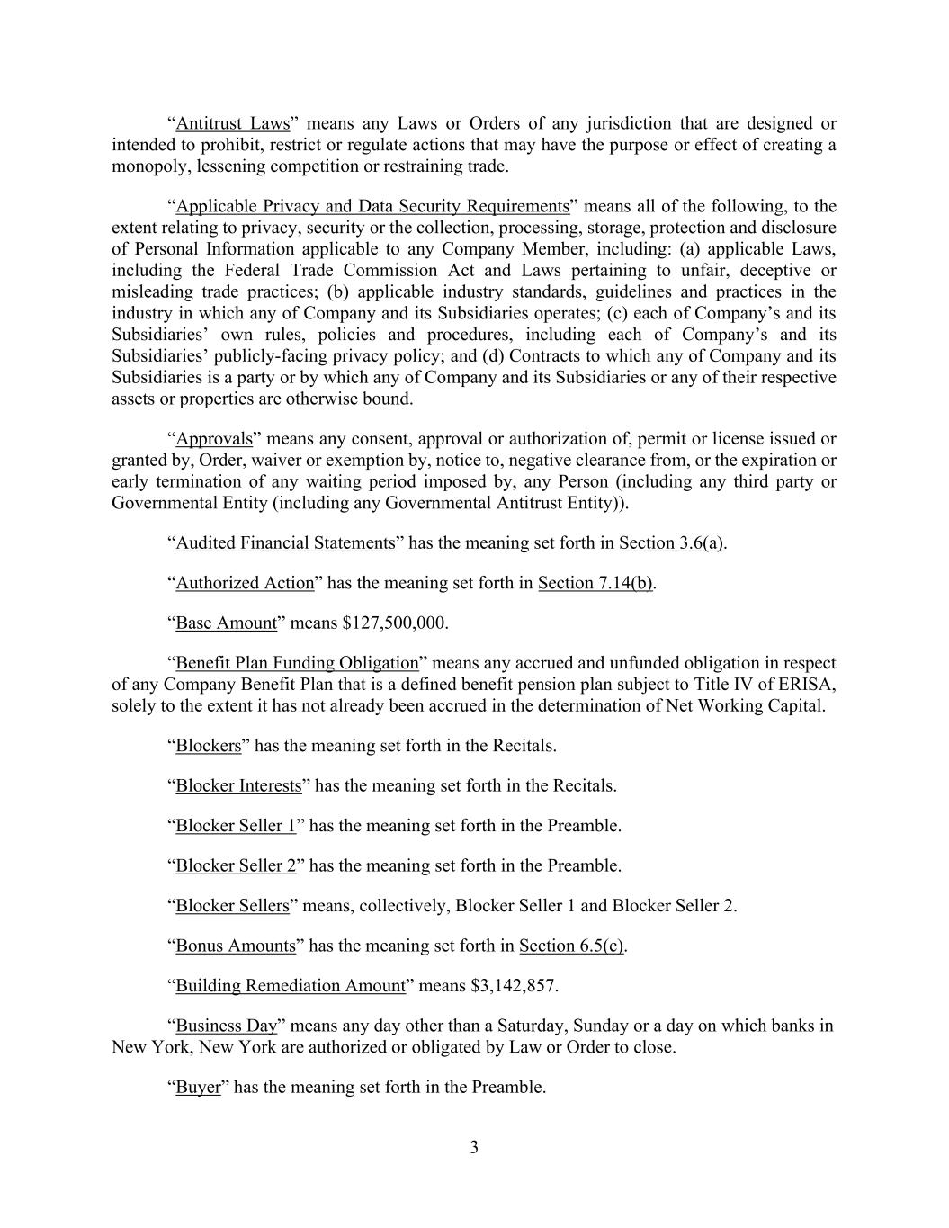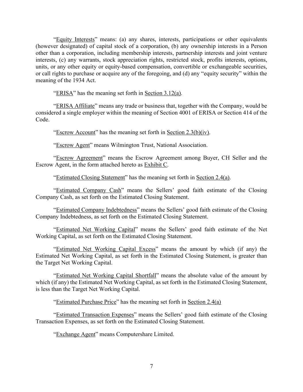 20 AmericasActive:19586302.10 “Environmental Notice”: a written notice from any Governmental Authority or other Person of any possible noncompliance with, investigation of a possible violation of, litigation relating to, or potential fine or liability under any Environmental Law, or with respect to any Environmental Release, environmental pollution or hazardous materials, including any complaint, summons, citation, order, claim, demand or request for correction, remediation or otherwise. “Environmental Release”: a release as defined in CERCLA or under any other Environmental Law. “Equity Interest”: the interest of any (a) shareholder in a corporation; (b) partner in a partnership (whether general, limited, limited liability or joint venture); (c) member in a limited liability company; or (d) other Person having any other form of equity security or ownership interest in any Person (other than a natural Person). “ERISA”: the Employee Retirement Income Security Act of 1974. “ERISA Affiliate”: any trade or business (whether or not incorporated) under common control with an Obligor within the meaning of Section 414(b) or (c) of the Code (and Sections 414(m) and (o) of the Code for purposes of provisions relating to Section 412 of the Code). “ERISA Event”: (a) a Reportable Event with respect to a Pension Plan or Multiemployer Plan; (b) a withdrawal by any Obligor or ERISA Affiliate from a Pension Plan subject to Section 4063 of ERISA during a plan year in which it was a substantial employer (as defined in Section 4001(a)(2) of ERISA) or a cessation of operations that is treated as such a withdrawal under Section 4062(e) of ERISA; (c) a complete or partial withdrawal by any Obligor or ERISA Affiliate from a Multiemployer Plan or notification that a Multiemployer Plan is in reorganization; (d) the filing of a notice of intent to terminate, the treatment of a Pension Plan amendment as a termination under Section 4041 or 4041A of ERISA, or the commencement of proceedings by the PBGC to terminate a Pension Plan or Multiemployer Plan; (e) the determination that any Pension Plan or Multiemployer Plan is considered an at risk plan or a plan in critical or endangered status under the Code, ERISA or the Pension Protection Act of 2006; (f) an event or condition which constitutes grounds under Section 4042 of ERISA for the termination of, or the appointment of a trustee to administer, any Pension Plan or Multiemployer Plan; or (g) the imposition of any liability under Title IV of ERISA, other than for PBGC premiums due but not delinquent under Section 4007 of ERISA, upon any Obligor or ERISA Affiliate. “EU Bail-In Legislation Schedule”: the EU Bail-In Legislation Schedule published by the Loan Market Association (or any successor Person), as in effect from time to time. “Event of Default”: as defined in Section 11. “Excluded Accounts”: (a) Deposit Accounts and Securities Accounts held exclusively (i) for payroll and payroll taxes, (ii) for employee benefit payments and expenses related to an Obligor’s employees, and (iii) to pay taxes, (b) zero balance disbursement accounts, (c) other Deposit Accounts and Securities Accounts maintained in the Ordinary Course of Business containing cash amounts that do not exceed at any time $2,500,000 for any such account and $5,000,000 (with the value of Canadian dollars converted to an equivalent value in Dollars at then existing Spot Rate for purposes of measuring compliance with such limitations) in the aggregate for all such accounts under this clause (c) and (d) in Agent’s sole discretion, any additional Deposit Account or Securities Account that is a disbursement account. “Excluded Property”: collectively (a) any Property of a CFC or CFCHC or any direct or indirect Foreign Subsidiary of a CFC; (b) motor vehicles or other assets subject to certificates of title or other registration statutes of the United States, any State, Canada (or any province or territory thereof) or other
