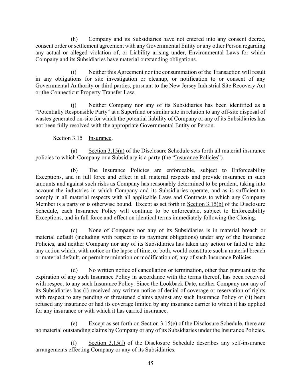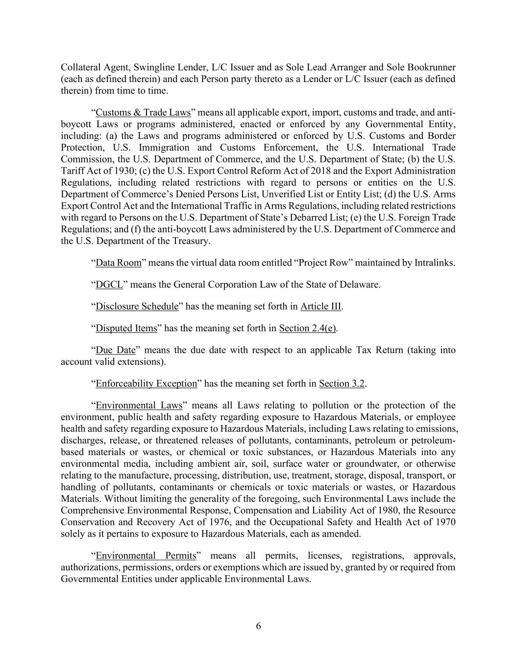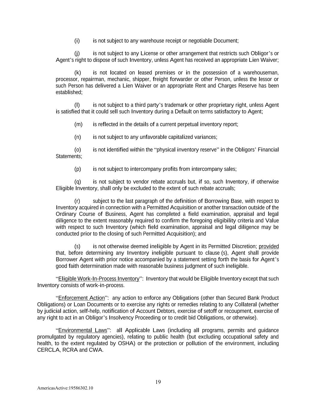 19 AmericasActive:19586302.10 (i) is not subject to any warehouse receipt or negotiable Document; (j) is not subject to any License or other arrangement that restricts such Obligor’s or Agent’s right to dispose of such Inventory, unless Agent has received an appropriate Lien Waiver; (k) is not located on leased premises or in the possession of a warehouseman, processor, repairman, mechanic, shipper, freight forwarder or other Person, unless the lessor or such Person has delivered a Lien Waiver or an appropriate Rent and Charges Reserve has been established; (l) is not subject to a third party’s trademark or other proprietary right, unless Agent is satisfied that it could sell such Inventory during a Default on terms satisfactory to Agent; (m) is reflected in the details of a current perpetual inventory report; (n) is not subject to any unfavorable capitalized variances; (o) is not identified within the “physical inventory reserve” in the Obligors’ Financial Statements; (p) is not subject to intercompany profits from intercompany sales; (q) is not subject to vendor rebate accruals but, if so, such Inventory, if otherwise Eligible Inventory, shall only be excluded to the extent of such rebate accruals; (r) subject to the last paragraph of the definition of Borrowing Base, with respect to Inventory acquired in connection with a Permitted Acquisition or another transaction outside of the Ordinary Course of Business, Agent has completed a field examination, appraisal and legal diligence to the extent reasonably required to confirm the foregoing eligibility criteria and Value with respect to such Inventory (which field examination, appraisal and legal diligence may be conducted prior to the closing of such Permitted Acquisition); and (s) is not otherwise deemed ineligible by Agent in its Permitted Discretion; provided that, before determining any Inventory ineligible pursuant to clause (s), Agent shall provide Borrower Agent with prior notice accompanied by a statement setting forth the basis for Agent’s good faith determination made with reasonable business judgment of such ineligible. “Eligible Work-In-Process Inventory”: Inventory that would be Eligible Inventory except that such Inventory consists of work-in-process. “Enforcement Action”: any action to enforce any Obligations (other than Secured Bank Product Obligations) or Loan Documents or to exercise any rights or remedies relating to any Collateral (whether by judicial action, self-help, notification of Account Debtors, exercise of setoff or recoupment, exercise of any right to act in an Obligor’s Insolvency Proceeding or to credit bid Obligations, or otherwise). “Environmental Laws”: all Applicable Laws (including all programs, permits and guidance promulgated by regulatory agencies), relating to public health (but excluding occupational safety and health, to the extent regulated by OSHA) or the protection or pollution of the environment, including CERCLA, RCRA and CWA.