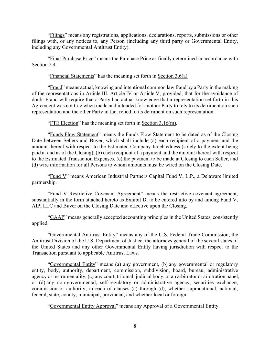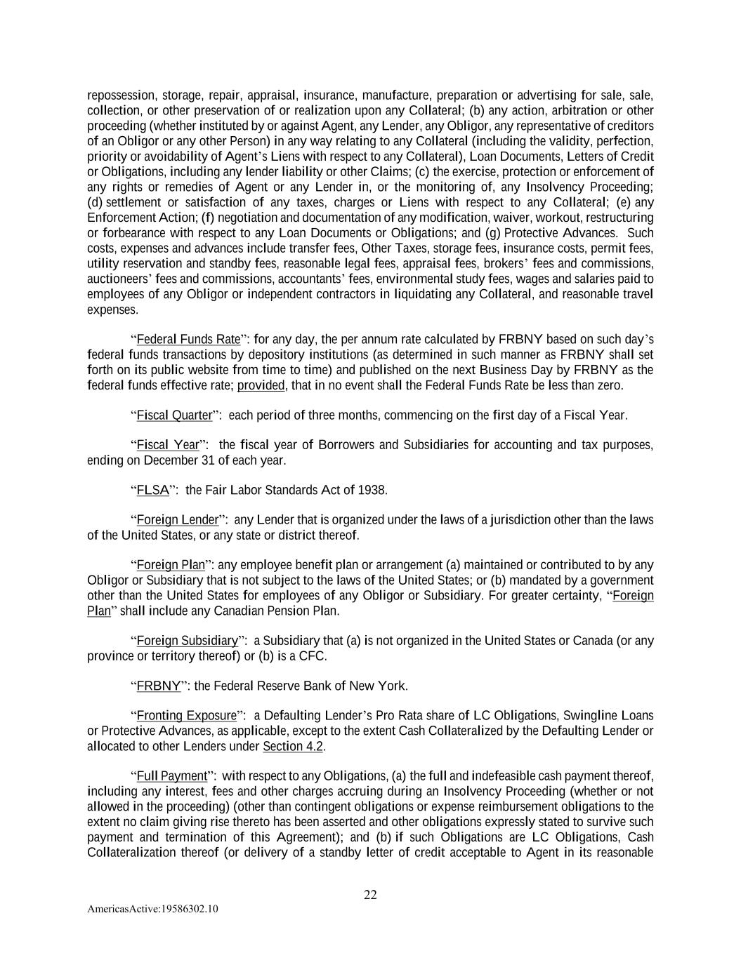 22 AmericasActive:19586302.10 repossession, storage, repair, appraisal, insurance, manufacture, preparation or advertising for sale, sale, collection, or other preservation of or realization upon any Collateral; (b) any action, arbitration or other proceeding (whether instituted by or against Agent, any Lender, any Obligor, any representative of creditors of an Obligor or any other Person) in any way relating to any Collateral (including the validity, perfection, priority or avoidability of Agent’s Liens with respect to any Collateral), Loan Documents, Letters of Credit or Obligations, including any lender liability or other Claims; (c) the exercise, protection or enforcement of any rights or remedies of Agent or any Lender in, or the monitoring of, any Insolvency Proceeding; (d) settlement or satisfaction of any taxes, charges or Liens with respect to any Collateral; (e) any Enforcement Action; (f) negotiation and documentation of any modification, waiver, workout, restructuring or forbearance with respect to any Loan Documents or Obligations; and (g) Protective Advances. Such costs, expenses and advances include transfer fees, Other Taxes, storage fees, insurance costs, permit fees, utility reservation and standby fees, reasonable legal fees, appraisal fees, brokers’ fees and commissions, auctioneers’ fees and commissions, accountants’ fees, environmental study fees, wages and salaries paid to employees of any Obligor or independent contractors in liquidating any Collateral, and reasonable travel expenses. “Federal Funds Rate”: for any day, the per annum rate calculated by FRBNY based on such day’s federal funds transactions by depository institutions (as determined in such manner as FRBNY shall set forth on its public website from time to time) and published on the next Business Day by FRBNY as the federal funds effective rate; provided, that in no event shall the Federal Funds Rate be less than zero. “Fiscal Quarter”: each period of three months, commencing on the first day of a Fiscal Year. “Fiscal Year”: the fiscal year of Borrowers and Subsidiaries for accounting and tax purposes, ending on December 31 of each year. “FLSA”: the Fair Labor Standards Act of 1938. “Foreign Lender”: any Lender that is organized under the laws of a jurisdiction other than the laws of the United States, or any state or district thereof. “Foreign Plan”: any employee benefit plan or arrangement (a) maintained or contributed to by any Obligor or Subsidiary that is not subject to the laws of the United States; or (b) mandated by a government other than the United States for employees of any Obligor or Subsidiary. For greater certainty, “Foreign Plan” shall include any Canadian Pension Plan. “Foreign Subsidiary”: a Subsidiary that (a) is not organized in the United States or Canada (or any province or territory thereof) or (b) is a CFC. “FRBNY”: the Federal Reserve Bank of New York. “Fronting Exposure”: a Defaulting Lender’s Pro Rata share of LC Obligations, Swingline Loans or Protective Advances, as applicable, except to the extent Cash Collateralized by the Defaulting Lender or allocated to other Lenders under Section 4.2. “Full Payment”: with respect to any Obligations, (a) the full and indefeasible cash payment thereof, including any interest, fees and other charges accruing during an Insolvency Proceeding (whether or not allowed in the proceeding) (other than contingent obligations or expense reimbursement obligations to the extent no claim giving rise thereto has been asserted and other obligations expressly stated to survive such payment and termination of this Agreement); and (b) if such Obligations are LC Obligations, Cash Collateralization thereof (or delivery of a standby letter of credit acceptable to Agent in its reasonable