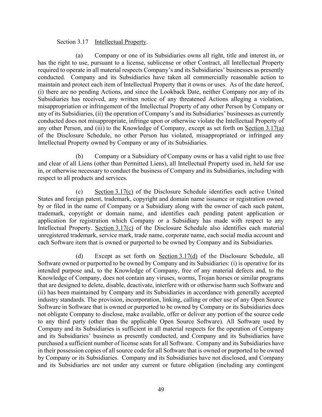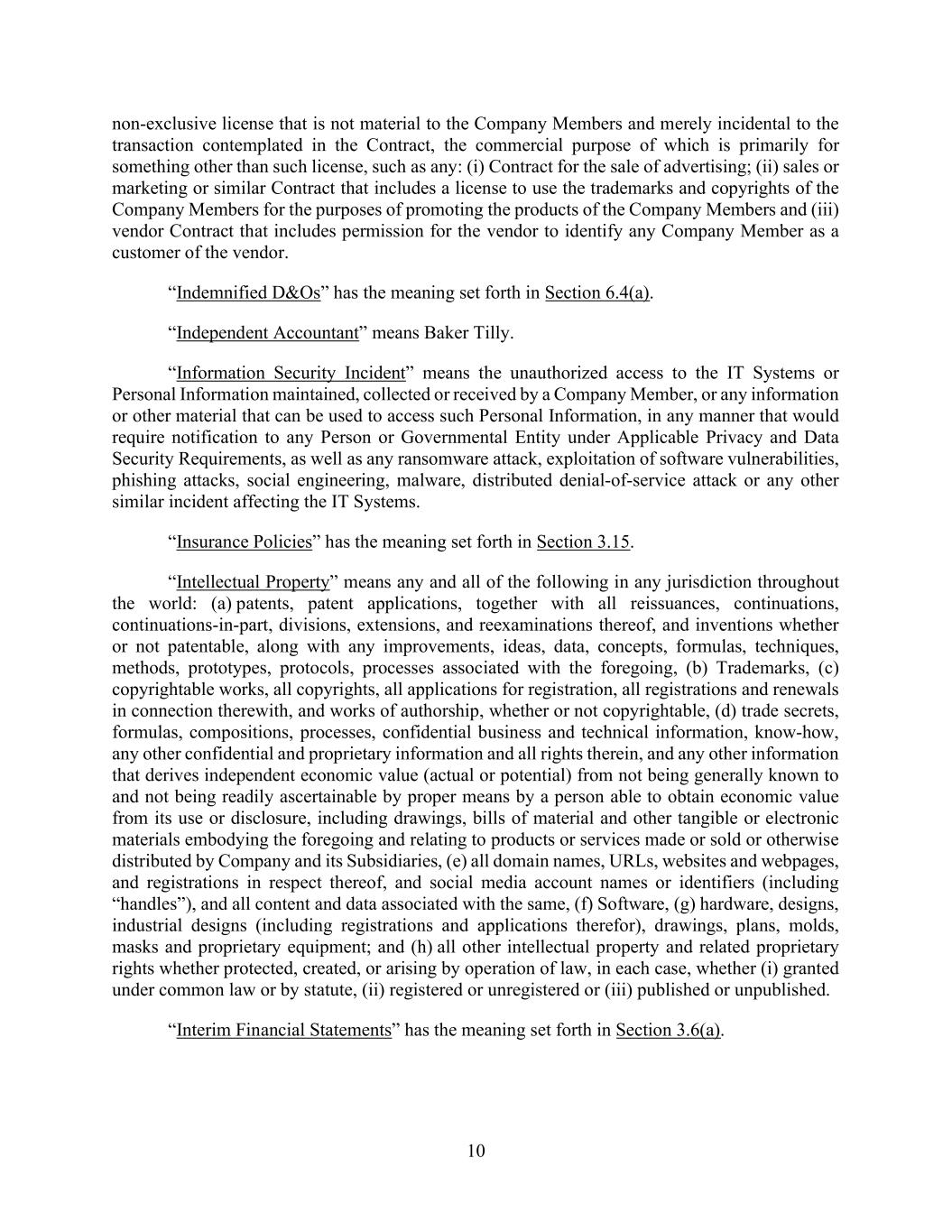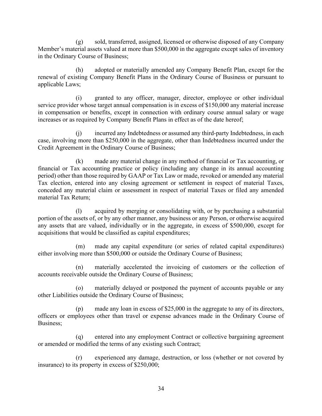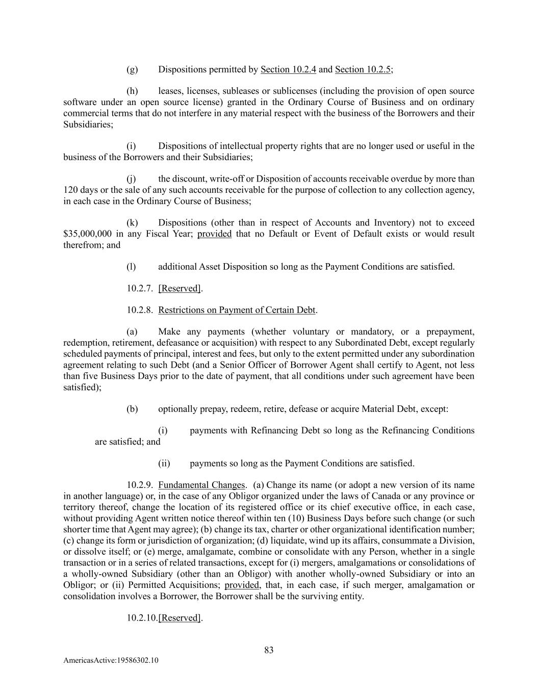 83 AmericasActive:19586302.10 (g) Dispositions permitted by Section 10.2.4 and Section 10.2.5; (h) leases, licenses, subleases or sublicenses (including the provision of open source software under an open source license) granted in the Ordinary Course of Business and on ordinary commercial terms that do not interfere in any material respect with the business of the Borrowers and their Subsidiaries; (i) Dispositions of intellectual property rights that are no longer used or useful in the business of the Borrowers and their Subsidiaries; (j) the discount, write-off or Disposition of accounts receivable overdue by more than 120 days or the sale of any such accounts receivable for the purpose of collection to any collection agency, in each case in the Ordinary Course of Business; (k) Dispositions (other than in respect of Accounts and Inventory) not to exceed $35,000,000 in any Fiscal Year; provided that no Default or Event of Default exists or would result therefrom; and (l) additional Asset Disposition so long as the Payment Conditions are satisfied. 10.2.7. [Reserved]. 10.2.8. Restrictions on Payment of Certain Debt. (a) Make any payments (whether voluntary or mandatory, or a prepayment, redemption, retirement, defeasance or acquisition) with respect to any Subordinated Debt, except regularly scheduled payments of principal, interest and fees, but only to the extent permitted under any subordination agreement relating to such Debt (and a Senior Officer of Borrower Agent shall certify to Agent, not less than five Business Days prior to the date of payment, that all conditions under such agreement have been satisfied); (b) optionally prepay, redeem, retire, defease or acquire Material Debt, except: (i) payments with Refinancing Debt so long as the Refinancing Conditions are satisfied; and (ii) payments so long as the Payment Conditions are satisfied. 10.2.9. Fundamental Changes. (a) Change its name (or adopt a new version of its name in another language) or, in the case of any Obligor organized under the laws of Canada or any province or territory thereof, change the location of its registered office or its chief executive office, in each case, without providing Agent written notice thereof within ten (10) Business Days before such change (or such shorter time that Agent may agree); (b) change its tax, charter or other organizational identification number; (c) change its form or jurisdiction of organization; (d) liquidate, wind up its affairs, consummate a Division, or dissolve itself; or (e) merge, amalgamate, combine or consolidate with any Person, whether in a single transaction or in a series of related transactions, except for (i) mergers, amalgamations or consolidations of a wholly-owned Subsidiary (other than an Obligor) with another wholly-owned Subsidiary or into an Obligor; or (ii) Permitted Acquisitions; provided, that, in each case, if such merger, amalgamation or consolidation involves a Borrower, the Borrower shall be the surviving entity. 10.2.10. [Reserved].