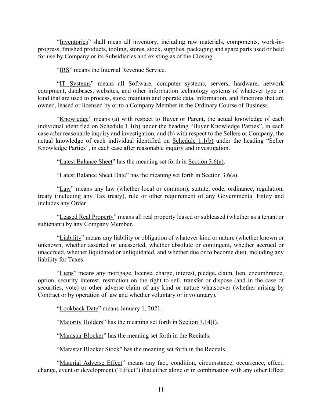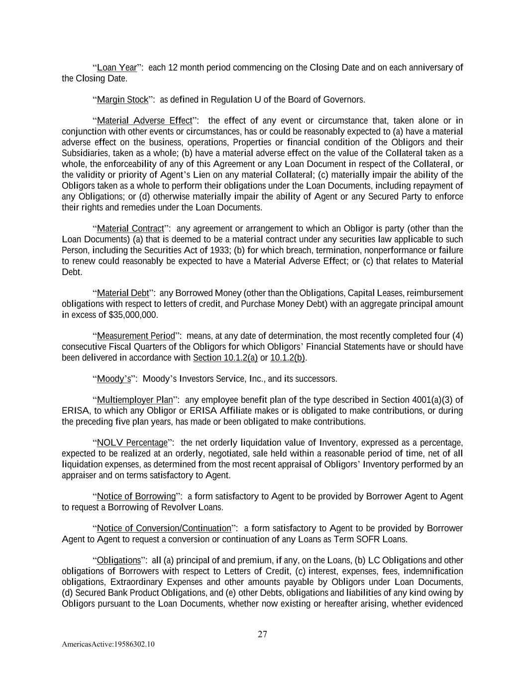 27 AmericasActive:19586302.10 “Loan Year”: each 12 month period commencing on the Closing Date and on each anniversary of the Closing Date. “Margin Stock”: as defined in Regulation U of the Board of Governors. “Material Adverse Effect”: the effect of any event or circumstance that, taken alone or in conjunction with other events or circumstances, has or could be reasonably expected to (a) have a material adverse effect on the business, operations, Properties or financial condition of the Obligors and their Subsidiaries, taken as a whole; (b) have a material adverse effect on the value of the Collateral taken as a whole, the enforceability of any of this Agreement or any Loan Document in respect of the Collateral, or the validity or priority of Agent’s Lien on any material Collateral; (c) materially impair the ability of the Obligors taken as a whole to perform their obligations under the Loan Documents, including repayment of any Obligations; or (d) otherwise materially impair the ability of Agent or any Secured Party to enforce their rights and remedies under the Loan Documents. “Material Contract”: any agreement or arrangement to which an Obligor is party (other than the Loan Documents) (a) that is deemed to be a material contract under any securities law applicable to such Person, including the Securities Act of 1933; (b) for which breach, termination, nonperformance or failure to renew could reasonably be expected to have a Material Adverse Effect; or (c) that relates to Material Debt. “Material Debt”: any Borrowed Money (other than the Obligations, Capital Leases, reimbursement obligations with respect to letters of credit, and Purchase Money Debt) with an aggregate principal amount in excess of $35,000,000. “Measurement Period”: means, at any date of determination, the most recently completed four (4) consecutive Fiscal Quarters of the Obligors for which Obligors’ Financial Statements have or should have been delivered in accordance with Section 10.1.2(a) or 10.1.2(b). “Moody’s”: Moody’s Investors Service, Inc., and its successors. “Multiemployer Plan”: any employee benefit plan of the type described in Section 4001(a)(3) of ERISA, to which any Obligor or ERISA Affiliate makes or is obligated to make contributions, or during the preceding five plan years, has made or been obligated to make contributions. “NOLV Percentage”: the net orderly liquidation value of Inventory, expressed as a percentage, expected to be realized at an orderly, negotiated, sale held within a reasonable period of time, net of all liquidation expenses, as determined from the most recent appraisal of Obligors’ Inventory performed by an appraiser and on terms satisfactory to Agent. “Notice of Borrowing”: a form satisfactory to Agent to be provided by Borrower Agent to Agent to request a Borrowing of Revolver Loans. “Notice of Conversion/Continuation”: a form satisfactory to Agent to be provided by Borrower Agent to Agent to request a conversion or continuation of any Loans as Term SOFR Loans. “Obligations”: all (a) principal of and premium, if any, on the Loans, (b) LC Obligations and other obligations of Borrowers with respect to Letters of Credit, (c) interest, expenses, fees, indemnification obligations, Extraordinary Expenses and other amounts payable by Obligors under Loan Documents, (d) Secured Bank Product Obligations, and (e) other Debts, obligations and liabilities of any kind owing by Obligors pursuant to the Loan Documents, whether now existing or hereafter arising, whether evidenced