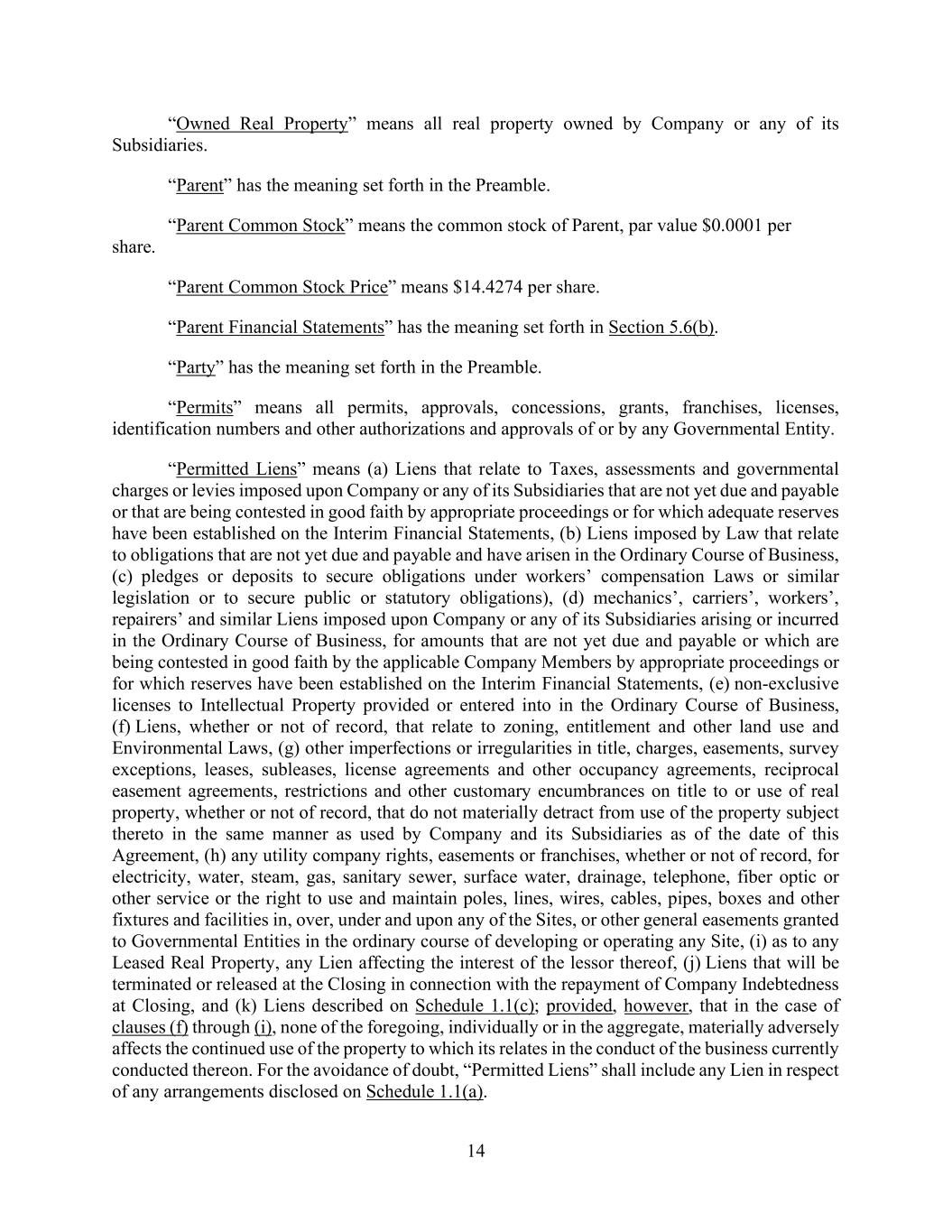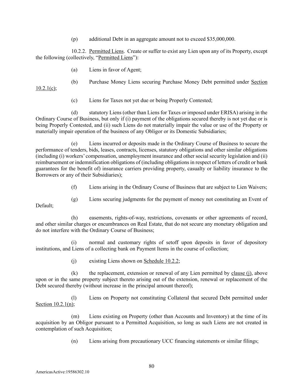 80 AmericasActive:19586302.10 (p) additional Debt in an aggregate amount not to exceed $35,000,000. 10.2.2. Permitted Liens. Create or suffer to exist any Lien upon any of its Property, except the following (collectively, “Permitted Liens”): (a) Liens in favor of Agent; (b) Purchase Money Liens securing Purchase Money Debt permitted under Section 10.2.1(c); (c) Liens for Taxes not yet due or being Properly Contested; (d) statutory Liens (other than Liens for Taxes or imposed under ERISA) arising in the Ordinary Course of Business, but only if (i) payment of the obligations secured thereby is not yet due or is being Properly Contested, and (ii) such Liens do not materially impair the value or use of the Property or materially impair operation of the business of any Obligor or its Domestic Subsidiaries; (e) Liens incurred or deposits made in the Ordinary Course of Business to secure the performance of tenders, bids, leases, contracts, licenses, statutory obligations and other similar obligations (including (i) workers’ compensation, unemployment insurance and other social security legislation and (ii) reimbursement or indemnification obligations of (including obligations in respect of letters of credit or bank guarantees for the benefit of) insurance carriers providing property, casualty or liability insurance to the Borrowers or any of their Subsidiaries); (f) Liens arising in the Ordinary Course of Business that are subject to Lien Waivers; (g) Liens securing judgments for the payment of money not constituting an Event of Default; (h) easements, rights-of-way, restrictions, covenants or other agreements of record, and other similar charges or encumbrances on Real Estate, that do not secure any monetary obligation and do not interfere with the Ordinary Course of Business; (i) normal and customary rights of setoff upon deposits in favor of depository institutions, and Liens of a collecting bank on Payment Items in the course of collection; (j) existing Liens shown on Schedule 10.2.2; (k) the replacement, extension or renewal of any Lien permitted by clause (j), above upon or in the same property subject thereto arising out of the extension, renewal or replacement of the Debt secured thereby (without increase in the principal amount thereof); (l) Liens on Property not constituting Collateral that secured Debt permitted under Section 10.2.1(n); (m) Liens existing on Property (other than Accounts and Inventory) at the time of its acquisition by an Obligor pursuant to a Permitted Acquisition, so long as such Liens are not created in contemplation of such Acquisition; (n) Liens arising from precautionary UCC financing statements or similar filings;