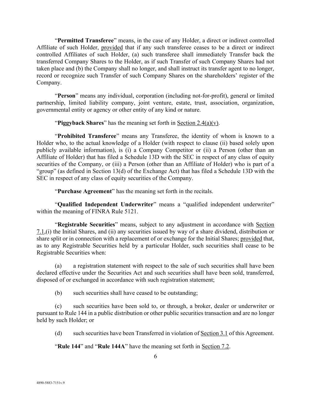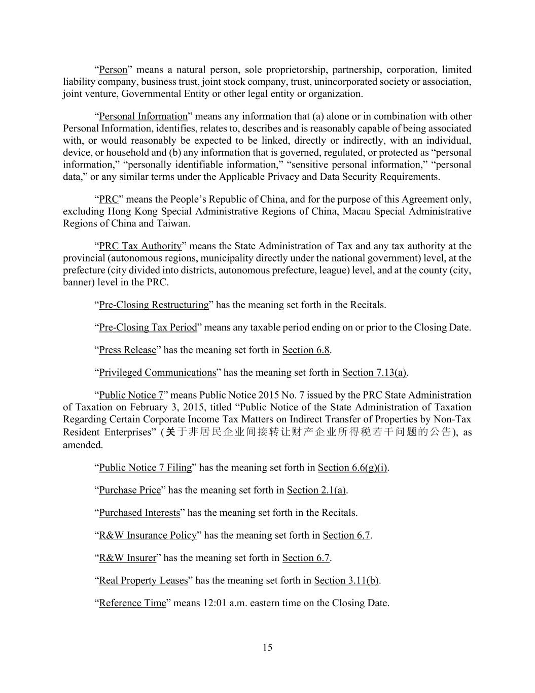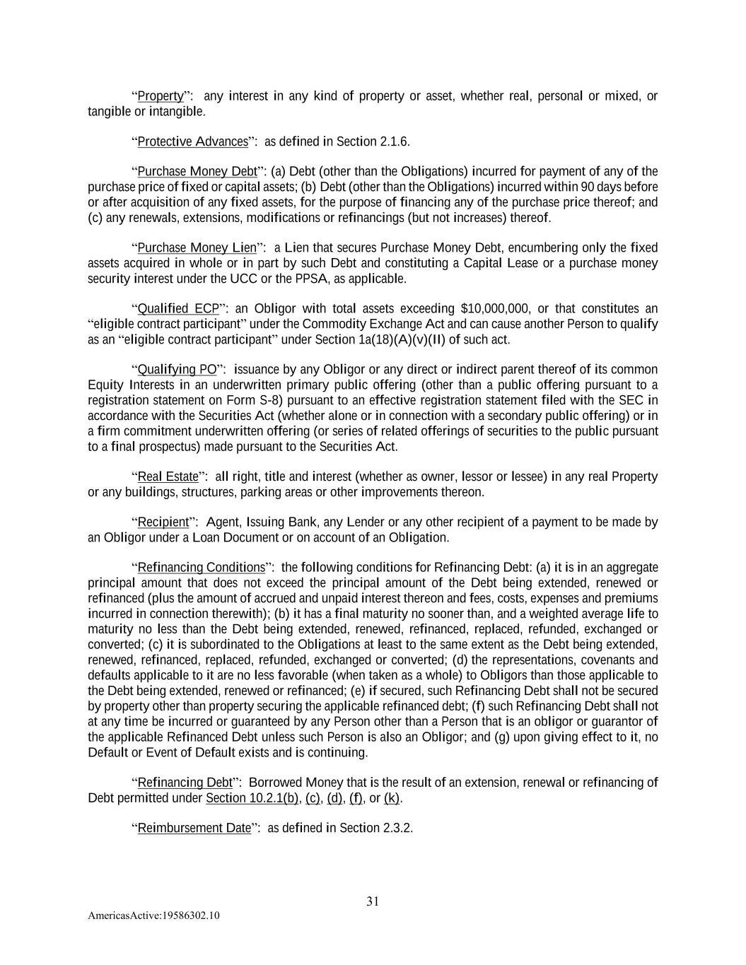 31 AmericasActive:19586302.10 “Property”: any interest in any kind of property or asset, whether real, personal or mixed, or tangible or intangible. “Protective Advances”: as defined in Section 2.1.6. “Purchase Money Debt”: (a) Debt (other than the Obligations) incurred for payment of any of the purchase price of fixed or capital assets; (b) Debt (other than the Obligations) incurred within 90 days before or after acquisition of any fixed assets, for the purpose of financing any of the purchase price thereof; and (c) any renewals, extensions, modifications or refinancings (but not increases) thereof. “Purchase Money Lien”: a Lien that secures Purchase Money Debt, encumbering only the fixed assets acquired in whole or in part by such Debt and constituting a Capital Lease or a purchase money security interest under the UCC or the PPSA, as applicable. “Qualified ECP”: an Obligor with total assets exceeding $10,000,000, or that constitutes an “eligible contract participant” under the Commodity Exchange Act and can cause another Person to qualify as an “eligible contract participant” under Section 1a(18)(A)(v)(II) of such act. “Qualifying PO”: issuance by any Obligor or any direct or indirect parent thereof of its common Equity Interests in an underwritten primary public offering (other than a public offering pursuant to a registration statement on Form S-8) pursuant to an effective registration statement filed with the SEC in accordance with the Securities Act (whether alone or in connection with a secondary public offering) or in a firm commitment underwritten offering (or series of related offerings of securities to the public pursuant to a final prospectus) made pursuant to the Securities Act. “Real Estate”: all right, title and interest (whether as owner, lessor or lessee) in any real Property or any buildings, structures, parking areas or other improvements thereon. “Recipient”: Agent, Issuing Bank, any Lender or any other recipient of a payment to be made by an Obligor under a Loan Document or on account of an Obligation. “Refinancing Conditions”: the following conditions for Refinancing Debt: (a) it is in an aggregate principal amount that does not exceed the principal amount of the Debt being extended, renewed or refinanced (plus the amount of accrued and unpaid interest thereon and fees, costs, expenses and premiums incurred in connection therewith); (b) it has a final maturity no sooner than, and a weighted average life to maturity no less than the Debt being extended, renewed, refinanced, replaced, refunded, exchanged or converted; (c) it is subordinated to the Obligations at least to the same extent as the Debt being extended, renewed, refinanced, replaced, refunded, exchanged or converted; (d) the representations, covenants and defaults applicable to it are no less favorable (when taken as a whole) to Obligors than those applicable to the Debt being extended, renewed or refinanced; (e) if secured, such Refinancing Debt shall not be secured by property other than property securing the applicable refinanced debt; (f) such Refinancing Debt shall not at any time be incurred or guaranteed by any Person other than a Person that is an obligor or guarantor of the applicable Refinanced Debt unless such Person is also an Obligor; and (g) upon giving effect to it, no Default or Event of Default exists and is continuing. “Refinancing Debt”: Borrowed Money that is the result of an extension, renewal or refinancing of Debt permitted under Section 10.2.1(b), (c), (d), (f), or (k). “Reimbursement Date”: as defined in Section 2.3.2.
