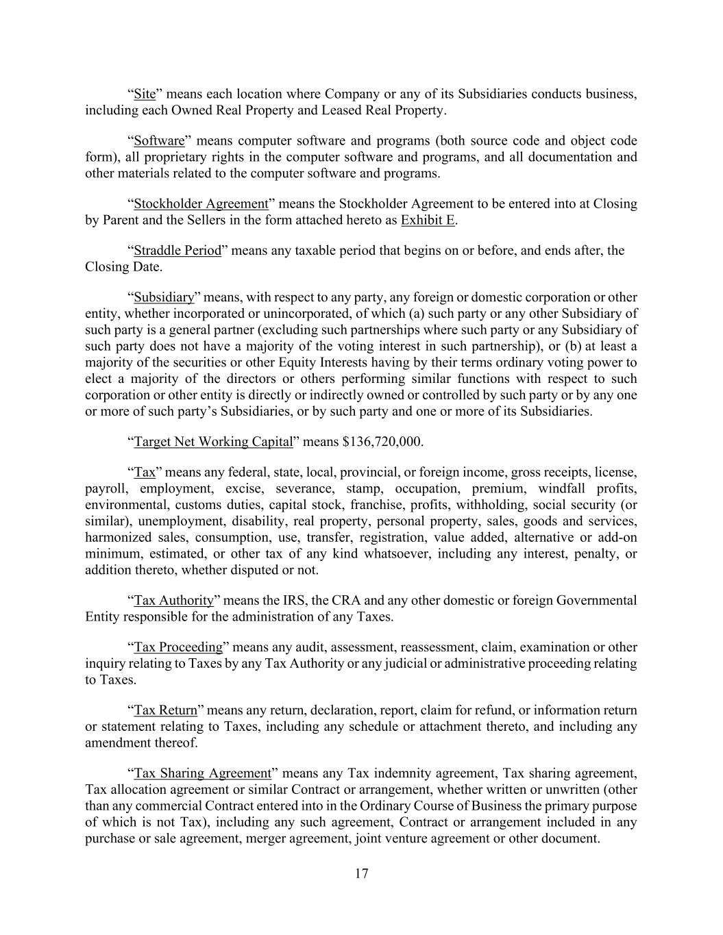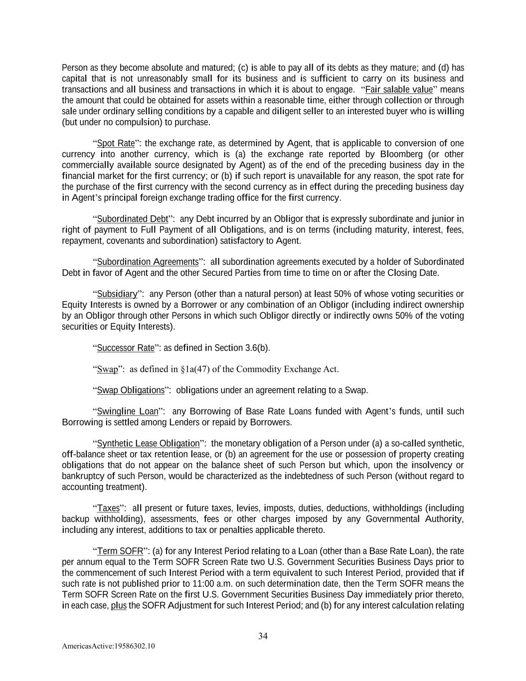 34 AmericasActive:19586302.10 Person as they become absolute and matured; (c) is able to pay all of its debts as they mature; and (d) has capital that is not unreasonably small for its business and is sufficient to carry on its business and transactions and all business and transactions in which it is about to engage. “Fair salable value” means the amount that could be obtained for assets within a reasonable time, either through collection or through sale under ordinary selling conditions by a capable and diligent seller to an interested buyer who is willing (but under no compulsion) to purchase. “Spot Rate”: the exchange rate, as determined by Agent, that is applicable to conversion of one currency into another currency, which is (a) the exchange rate reported by Bloomberg (or other commercially available source designated by Agent) as of the end of the preceding business day in the financial market for the first currency; or (b) if such report is unavailable for any reason, the spot rate for the purchase of the first currency with the second currency as in effect during the preceding business day in Agent’s principal foreign exchange trading office for the first currency. “Subordinated Debt”: any Debt incurred by an Obligor that is expressly subordinate and junior in right of payment to Full Payment of all Obligations, and is on terms (including maturity, interest, fees, repayment, covenants and subordination) satisfactory to Agent. “Subordination Agreements”: all subordination agreements executed by a holder of Subordinated Debt in favor of Agent and the other Secured Parties from time to time on or after the Closing Date. “Subsidiary”: any Person (other than a natural person) at least 50% of whose voting securities or Equity Interests is owned by a Borrower or any combination of an Obligor (including indirect ownership by an Obligor through other Persons in which such Obligor directly or indirectly owns 50% of the voting securities or Equity Interests). “Successor Rate”: as defined in Section 3.6(b). “Swap”: as defined in §1a(47) of the Commodity Exchange Act. “Swap Obligations”: obligations under an agreement relating to a Swap. “Swingline Loan”: any Borrowing of Base Rate Loans funded with Agent’s funds, until such Borrowing is settled among Lenders or repaid by Borrowers. “Synthetic Lease Obligation”: the monetary obligation of a Person under (a) a so-called synthetic, off-balance sheet or tax retention lease, or (b) an agreement for the use or possession of property creating obligations that do not appear on the balance sheet of such Person but which, upon the insolvency or bankruptcy of such Person, would be characterized as the indebtedness of such Person (without regard to accounting treatment). “Taxes”: all present or future taxes, levies, imposts, duties, deductions, withholdings (including backup withholding), assessments, fees or other charges imposed by any Governmental Authority, including any interest, additions to tax or penalties applicable thereto. “Term SOFR”: (a) for any Interest Period relating to a Loan (other than a Base Rate Loan), the rate per annum equal to the Term SOFR Screen Rate two U.S. Government Securities Business Days prior to the commencement of such Interest Period with a term equivalent to such Interest Period, provided that if such rate is not published prior to 11:00 a.m. on such determination date, then the Term SOFR means the Term SOFR Screen Rate on the first U.S. Government Securities Business Day immediately prior thereto, in each case, plus the SOFR Adjustment for such Interest Period; and (b) for any interest calculation relating