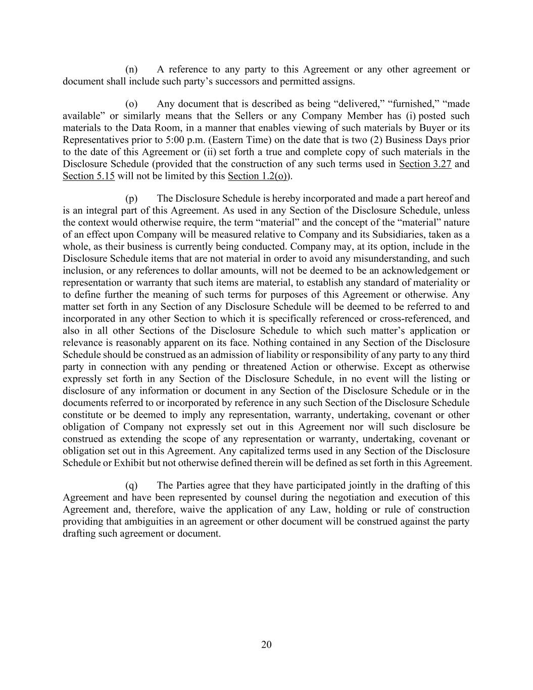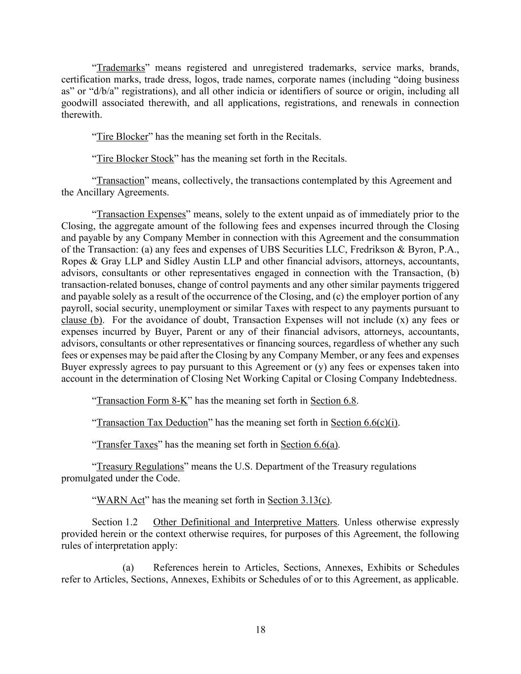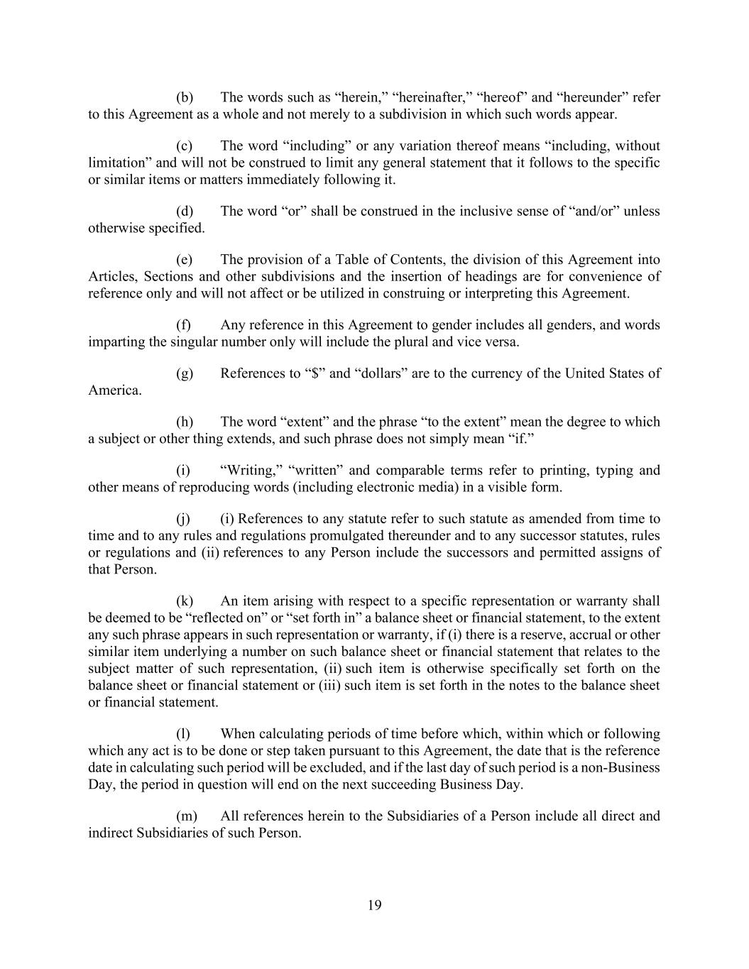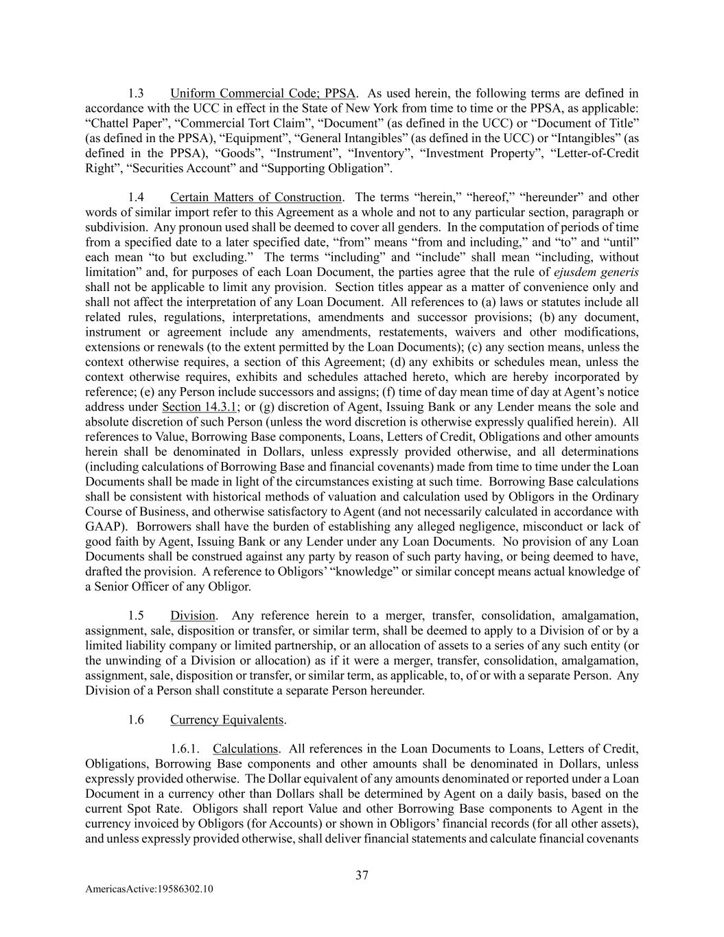 37 AmericasActive:19586302.10 1.3 Uniform Commercial Code; PPSA. As used herein, the following terms are defined in accordance with the UCC in effect in the State of New York from time to time or the PPSA, as applicable: “Chattel Paper”, “Commercial Tort Claim”, “Document” (as defined in the UCC) or “Document of Title” (as defined in the PPSA), “Equipment”, “General Intangibles” (as defined in the UCC) or “Intangibles” (as defined in the PPSA), “Goods”, “Instrument”, “Inventory”, “Investment Property”, “Letter-of-Credit Right”, “Securities Account” and “Supporting Obligation”. 1.4 Certain Matters of Construction. The terms “herein,” “hereof,” “hereunder” and other words of similar import refer to this Agreement as a whole and not to any particular section, paragraph or subdivision. Any pronoun used shall be deemed to cover all genders. In the computation of periods of time from a specified date to a later specified date, “from” means “from and including,” and “to” and “until” each mean “to but excluding.” The terms “including” and “include” shall mean “including, without limitation” and, for purposes of each Loan Document, the parties agree that the rule of ejusdem generis shall not be applicable to limit any provision. Section titles appear as a matter of convenience only and shall not affect the interpretation of any Loan Document. All references to (a) laws or statutes include all related rules, regulations, interpretations, amendments and successor provisions; (b) any document, instrument or agreement include any amendments, restatements, waivers and other modifications, extensions or renewals (to the extent permitted by the Loan Documents); (c) any section means, unless the context otherwise requires, a section of this Agreement; (d) any exhibits or schedules mean, unless the context otherwise requires, exhibits and schedules attached hereto, which are hereby incorporated by reference; (e) any Person include successors and assigns; (f) time of day mean time of day at Agent’s notice address under Section 14.3.1; or (g) discretion of Agent, Issuing Bank or any Lender means the sole and absolute discretion of such Person (unless the word discretion is otherwise expressly qualified herein). All references to Value, Borrowing Base components, Loans, Letters of Credit, Obligations and other amounts herein shall be denominated in Dollars, unless expressly provided otherwise, and all determinations (including calculations of Borrowing Base and financial covenants) made from time to time under the Loan Documents shall be made in light of the circumstances existing at such time. Borrowing Base calculations shall be consistent with historical methods of valuation and calculation used by Obligors in the Ordinary Course of Business, and otherwise satisfactory to Agent (and not necessarily calculated in accordance with GAAP). Borrowers shall have the burden of establishing any alleged negligence, misconduct or lack of good faith by Agent, Issuing Bank or any Lender under any Loan Documents. No provision of any Loan Documents shall be construed against any party by reason of such party having, or being deemed to have, drafted the provision. A reference to Obligors’ “knowledge” or similar concept means actual knowledge of a Senior Officer of any Obligor. 1.5 Division. Any reference herein to a merger, transfer, consolidation, amalgamation, assignment, sale, disposition or transfer, or similar term, shall be deemed to apply to a Division of or by a limited liability company or limited partnership, or an allocation of assets to a series of any such entity (or the unwinding of a Division or allocation) as if it were a merger, transfer, consolidation, amalgamation, assignment, sale, disposition or transfer, or similar term, as applicable, to, of or with a separate Person. Any Division of a Person shall constitute a separate Person hereunder. 1.6 Currency Equivalents. 1.6.1. Calculations. All references in the Loan Documents to Loans, Letters of Credit, Obligations, Borrowing Base components and other amounts shall be denominated in Dollars, unless expressly provided otherwise. The Dollar equivalent of any amounts denominated or reported under a Loan Document in a currency other than Dollars shall be determined by Agent on a daily basis, based on the current Spot Rate. Obligors shall report Value and other Borrowing Base components to Agent in the currency invoiced by Obligors (for Accounts) or shown in Obligors’ financial records (for all other assets), and unless expressly provided otherwise, shall deliver financial statements and calculate financial covenants