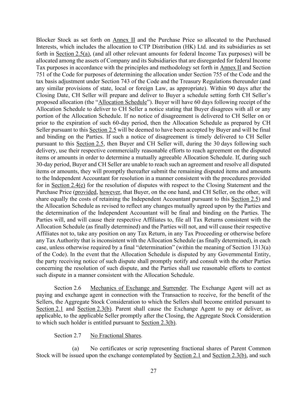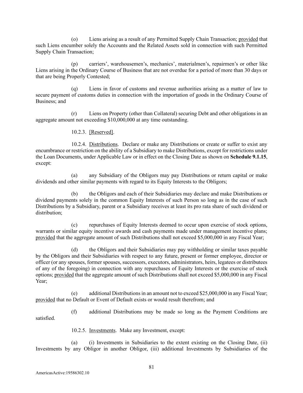 81 AmericasActive:19586302.10 (o) Liens arising as a result of any Permitted Supply Chain Transaction; provided that such Liens encumber solely the Accounts and the Related Assets sold in connection with such Permitted Supply Chain Transaction; (p) carriers’, warehousemen’s, mechanics’, materialmen’s, repairmen’s or other like Liens arising in the Ordinary Course of Business that are not overdue for a period of more than 30 days or that are being Properly Contested; (q) Liens in favor of customs and revenue authorities arising as a matter of law to secure payment of customs duties in connection with the importation of goods in the Ordinary Course of Business; and (r) Liens on Property (other than Collateral) securing Debt and other obligations in an aggregate amount not exceeding $10,000,000 at any time outstanding. 10.2.3. [Reserved]. 10.2.4. Distributions. Declare or make any Distributions or create or suffer to exist any encumbrance or restriction on the ability of a Subsidiary to make Distributions, except for restrictions under the Loan Documents, under Applicable Law or in effect on the Closing Date as shown on Schedule 9.1.15, except: (a) any Subsidiary of the Obligors may pay Distributions or return capital or make dividends and other similar payments with regard to its Equity Interests to the Obligors; (b) the Obligors and each of their Subsidiaries may declare and make Distributions or dividend payments solely in the common Equity Interests of such Person so long as in the case of such Distributions by a Subsidiary, parent or a Subsidiary receives at least its pro rata share of such dividend or distribution; (c) repurchases of Equity Interests deemed to occur upon exercise of stock options, warrants or similar equity incentive awards and cash payments made under management incentive plans; provided that the aggregate amount of such Distributions shall not exceed $5,000,000 in any Fiscal Year; (d) the Obligors and their Subsidiaries may pay withholding or similar taxes payable by the Obligors and their Subsidiaries with respect to any future, present or former employee, director or officer (or any spouses, former spouses, successors, executors, administrators, heirs, legatees or distributees of any of the foregoing) in connection with any repurchases of Equity Interests or the exercise of stock options; provided that the aggregate amount of such Distributions shall not exceed $5,000,000 in any Fiscal Year; (e) additional Distributions in an amount not to exceed $25,000,000 in any Fiscal Year; provided that no Default or Event of Default exists or would result therefrom; and (f) additional Distributions may be made so long as the Payment Conditions are satisfied. 10.2.5. Investments. Make any Investment, except: (a) (i) Investments in Subsidiaries to the extent existing on the Closing Date, (ii) Investments by any Obligor in another Obligor, (iii) additional Investments by Subsidiaries of the