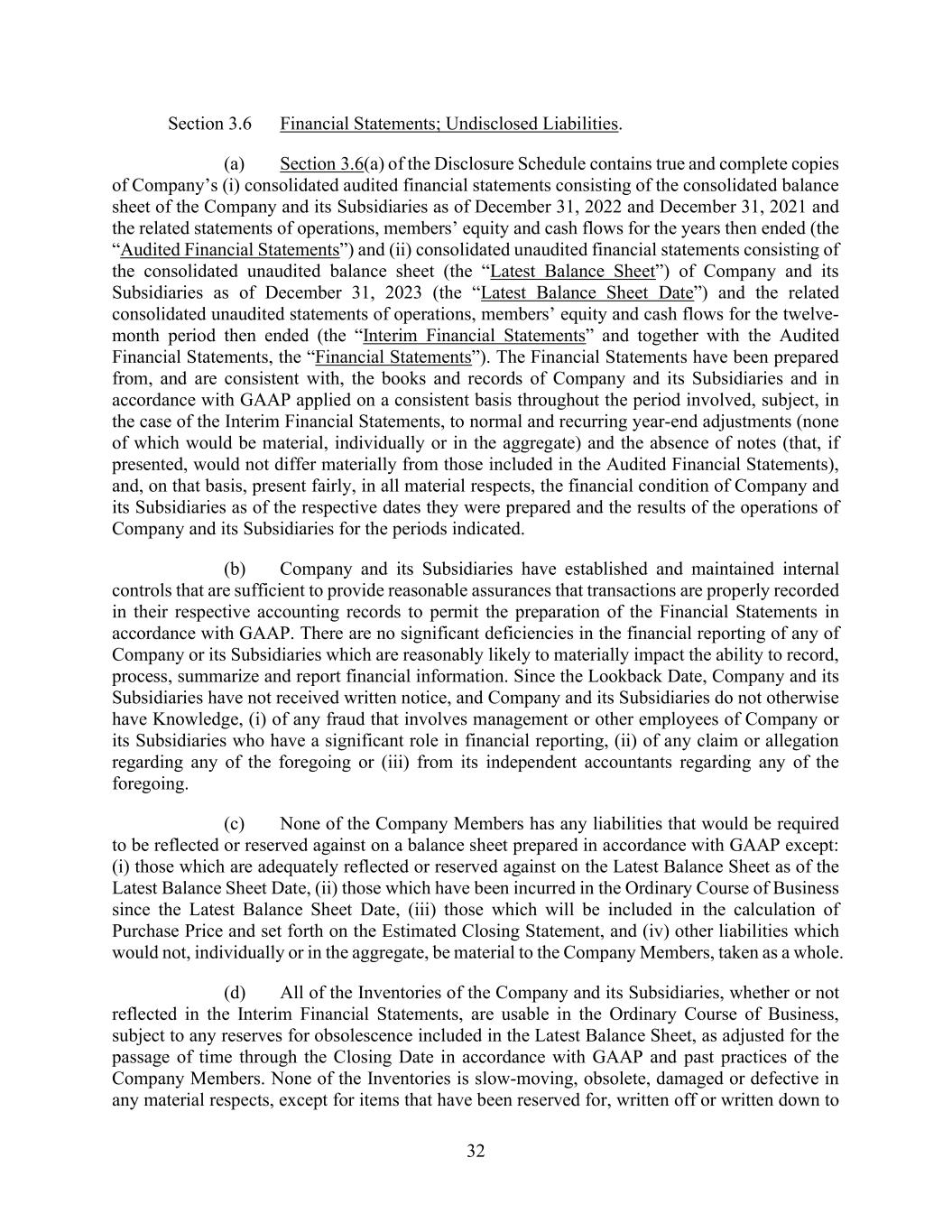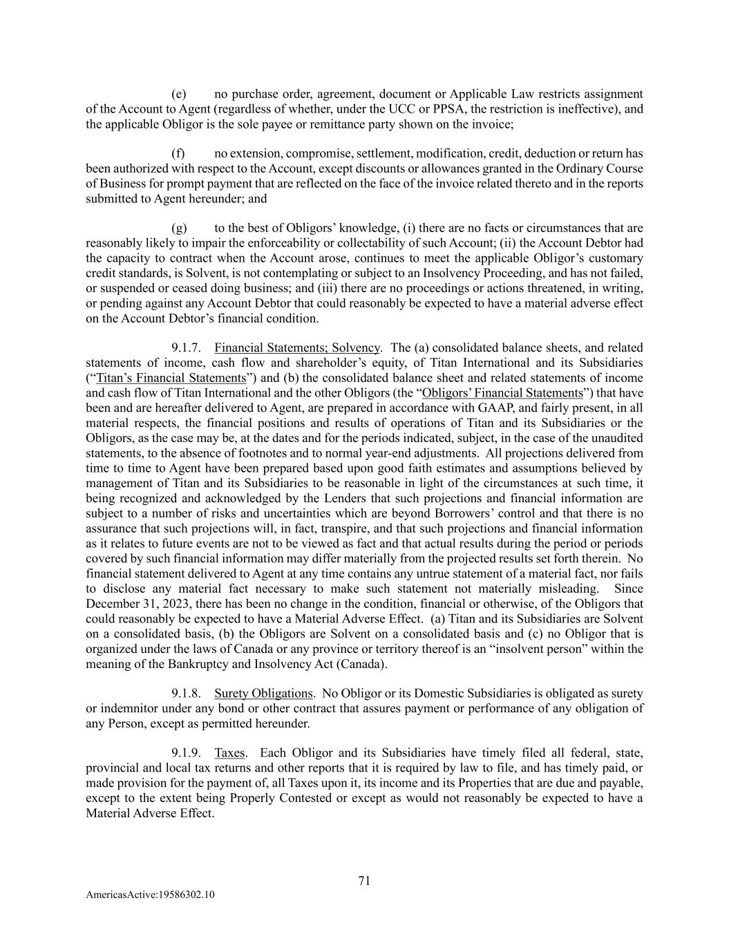 71 AmericasActive:19586302.10 (e) no purchase order, agreement, document or Applicable Law restricts assignment of the Account to Agent (regardless of whether, under the UCC or PPSA, the restriction is ineffective), and the applicable Obligor is the sole payee or remittance party shown on the invoice; (f) no extension, compromise, settlement, modification, credit, deduction or return has been authorized with respect to the Account, except discounts or allowances granted in the Ordinary Course of Business for prompt payment that are reflected on the face of the invoice related thereto and in the reports submitted to Agent hereunder; and (g) to the best of Obligors’ knowledge, (i) there are no facts or circumstances that are reasonably likely to impair the enforceability or collectability of such Account; (ii) the Account Debtor had the capacity to contract when the Account arose, continues to meet the applicable Obligor’s customary credit standards, is Solvent, is not contemplating or subject to an Insolvency Proceeding, and has not failed, or suspended or ceased doing business; and (iii) there are no proceedings or actions threatened, in writing, or pending against any Account Debtor that could reasonably be expected to have a material adverse effect on the Account Debtor’s financial condition. 9.1.7. Financial Statements; Solvency. The (a) consolidated balance sheets, and related statements of income, cash flow and shareholder’s equity, of Titan International and its Subsidiaries (“Titan’s Financial Statements”) and (b) the consolidated balance sheet and related statements of income and cash flow of Titan International and the other Obligors (the “Obligors’ Financial Statements”) that have been and are hereafter delivered to Agent, are prepared in accordance with GAAP, and fairly present, in all material respects, the financial positions and results of operations of Titan and its Subsidiaries or the Obligors, as the case may be, at the dates and for the periods indicated, subject, in the case of the unaudited statements, to the absence of footnotes and to normal year-end adjustments. All projections delivered from time to time to Agent have been prepared based upon good faith estimates and assumptions believed by management of Titan and its Subsidiaries to be reasonable in light of the circumstances at such time, it being recognized and acknowledged by the Lenders that such projections and financial information are subject to a number of risks and uncertainties which are beyond Borrowers’ control and that there is no assurance that such projections will, in fact, transpire, and that such projections and financial information as it relates to future events are not to be viewed as fact and that actual results during the period or periods covered by such financial information may differ materially from the projected results set forth therein. No financial statement delivered to Agent at any time contains any untrue statement of a material fact, nor fails to disclose any material fact necessary to make such statement not materially misleading. Since December 31, 2023, there has been no change in the condition, financial or otherwise, of the Obligors that could reasonably be expected to have a Material Adverse Effect. (a) Titan and its Subsidiaries are Solvent on a consolidated basis, (b) the Obligors are Solvent on a consolidated basis and (c) no Obligor that is organized under the laws of Canada or any province or territory thereof is an “insolvent person” within the meaning of the Bankruptcy and Insolvency Act (Canada). 9.1.8. Surety Obligations. No Obligor or its Domestic Subsidiaries is obligated as surety or indemnitor under any bond or other contract that assures payment or performance of any obligation of any Person, except as permitted hereunder. 9.1.9. Taxes. Each Obligor and its Subsidiaries have timely filed all federal, state, provincial and local tax returns and other reports that it is required by law to file, and has timely paid, or made provision for the payment of, all Taxes upon it, its income and its Properties that are due and payable, except to the extent being Properly Contested or except as would not reasonably be expected to have a Material Adverse Effect.