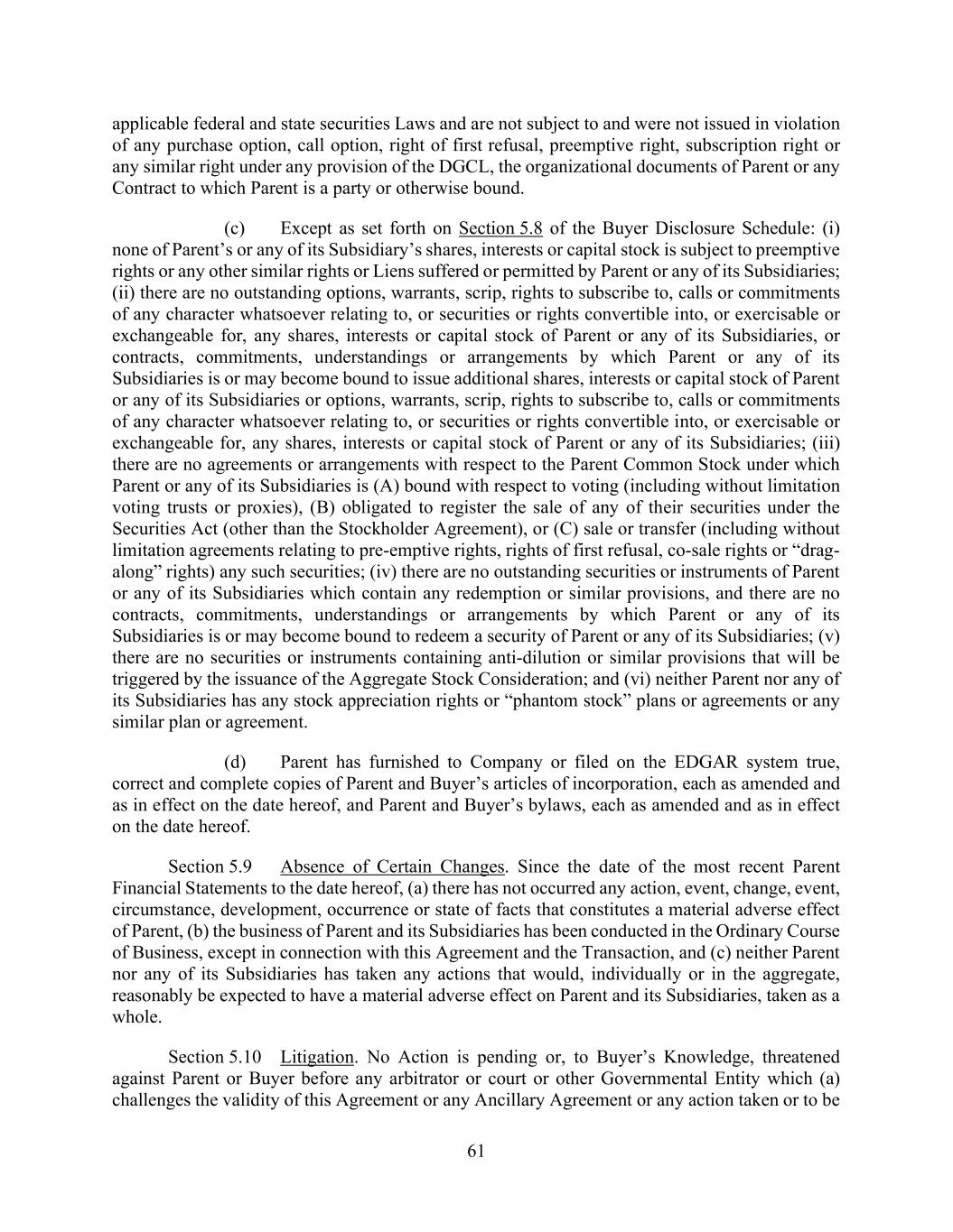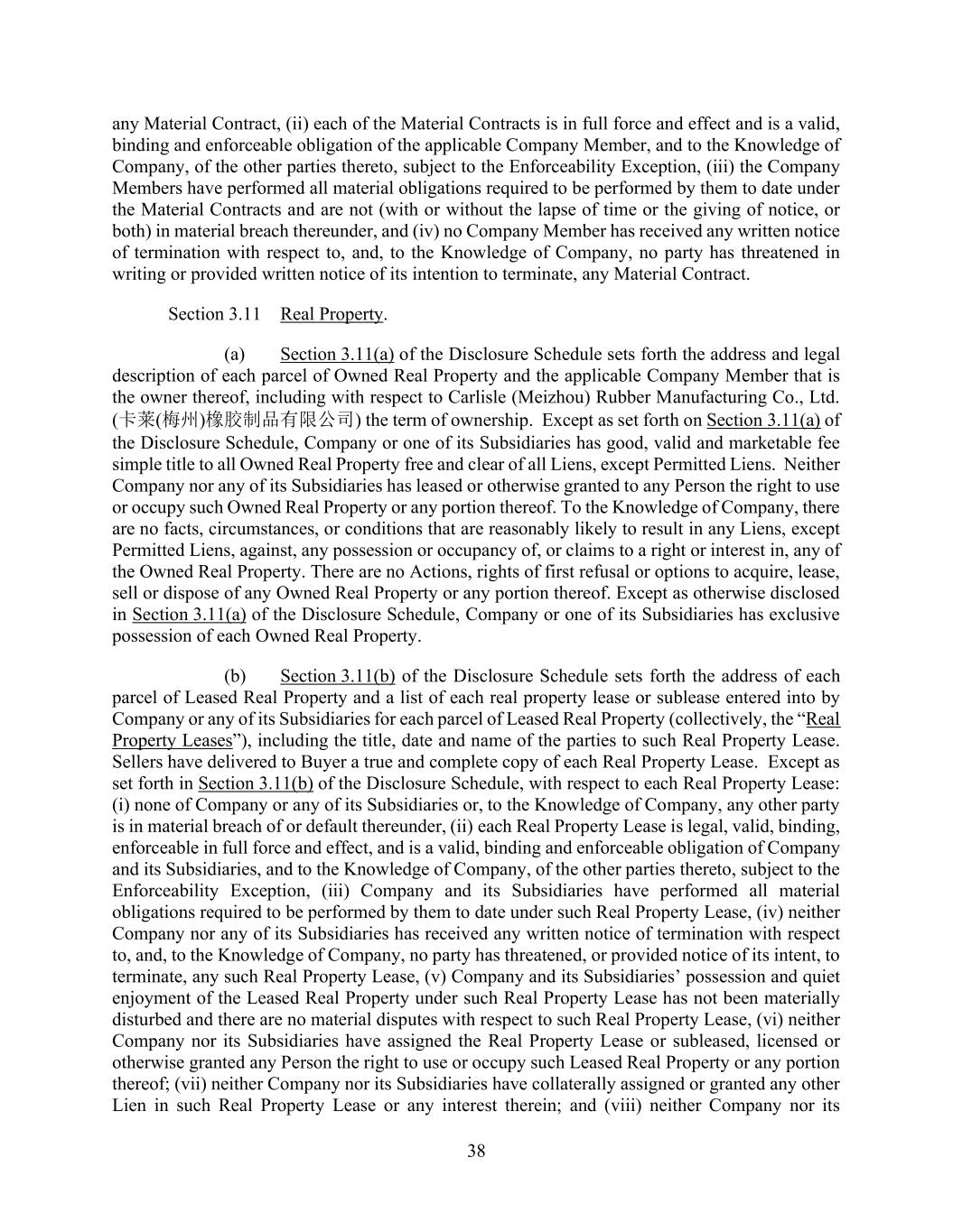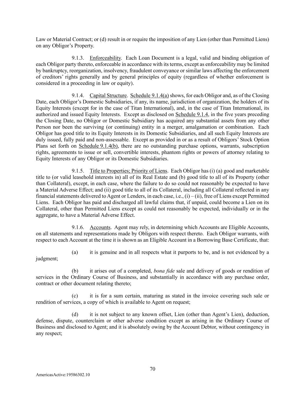 70 AmericasActive:19586302.10 Law or Material Contract; or (d) result in or require the imposition of any Lien (other than Permitted Liens) on any Obligor’s Property. 9.1.3. Enforceability. Each Loan Document is a legal, valid and binding obligation of each Obligor party thereto, enforceable in accordance with its terms, except as enforceability may be limited by bankruptcy, reorganization, insolvency, fraudulent conveyance or similar laws affecting the enforcement of creditors’ rights generally and by general principles of equity (regardless of whether enforcement is considered in a proceeding in law or equity). 9.1.4. Capital Structure. Schedule 9.1.4(a) shows, for each Obligor and, as of the Closing Date, each Obligor’s Domestic Subsidiaries, if any, its name, jurisdiction of organization, the holders of its Equity Interests (except for in the case of Titan International), and, in the case of Titan International, its authorized and issued Equity Interests. Except as disclosed on Schedule 9.1.4, in the five years preceding the Closing Date, no Obligor or Domestic Subsidiary has acquired any substantial assets from any other Person nor been the surviving (or continuing) entity in a merger, amalgamation or combination. Each Obligor has good title to its Equity Interests in its Domestic Subsidiaries, and all such Equity Interests are duly issued, fully paid and non-assessable. Except as provided in or as a result of Obligors’ Stock Option Plans set forth on Schedule 9.1.4(b), there are no outstanding purchase options, warrants, subscription rights, agreements to issue or sell, convertible interests, phantom rights or powers of attorney relating to Equity Interests of any Obligor or its Domestic Subsidiaries. 9.1.5. Title to Properties; Priority of Liens. Each Obligor has (i) (a) good and marketable title to (or valid leasehold interests in) all of its Real Estate and (b) good title to all of its Property (other than Collateral), except, in each case, where the failure to do so could not reasonably be expected to have a Material Adverse Effect; and (ii) good title to all of its Collateral, including all Collateral reflected in any financial statements delivered to Agent or Lenders, in each case, i.e., (i) – (ii), free of Liens except Permitted Liens. Each Obligor has paid and discharged all lawful claims that, if unpaid, could become a Lien on its Collateral, other than Permitted Liens except as could not reasonably be expected, individually or in the aggregate, to have a Material Adverse Effect. 9.1.6. Accounts. Agent may rely, in determining which Accounts are Eligible Accounts, on all statements and representations made by Obligors with respect thereto. Each Obligor warrants, with respect to each Account at the time it is shown as an Eligible Account in a Borrowing Base Certificate, that: (a) it is genuine and in all respects what it purports to be, and is not evidenced by a judgment; (b) it arises out of a completed, bona fide sale and delivery of goods or rendition of services in the Ordinary Course of Business, and substantially in accordance with any purchase order, contract or other document relating thereto; (c) it is for a sum certain, maturing as stated in the invoice covering such sale or rendition of services, a copy of which is available to Agent on request; (d) it is not subject to any known offset, Lien (other than Agent’s Lien), deduction, defense, dispute, counterclaim or other adverse condition except as arising in the Ordinary Course of Business and disclosed to Agent; and it is absolutely owing by the Account Debtor, without contingency in any respect;