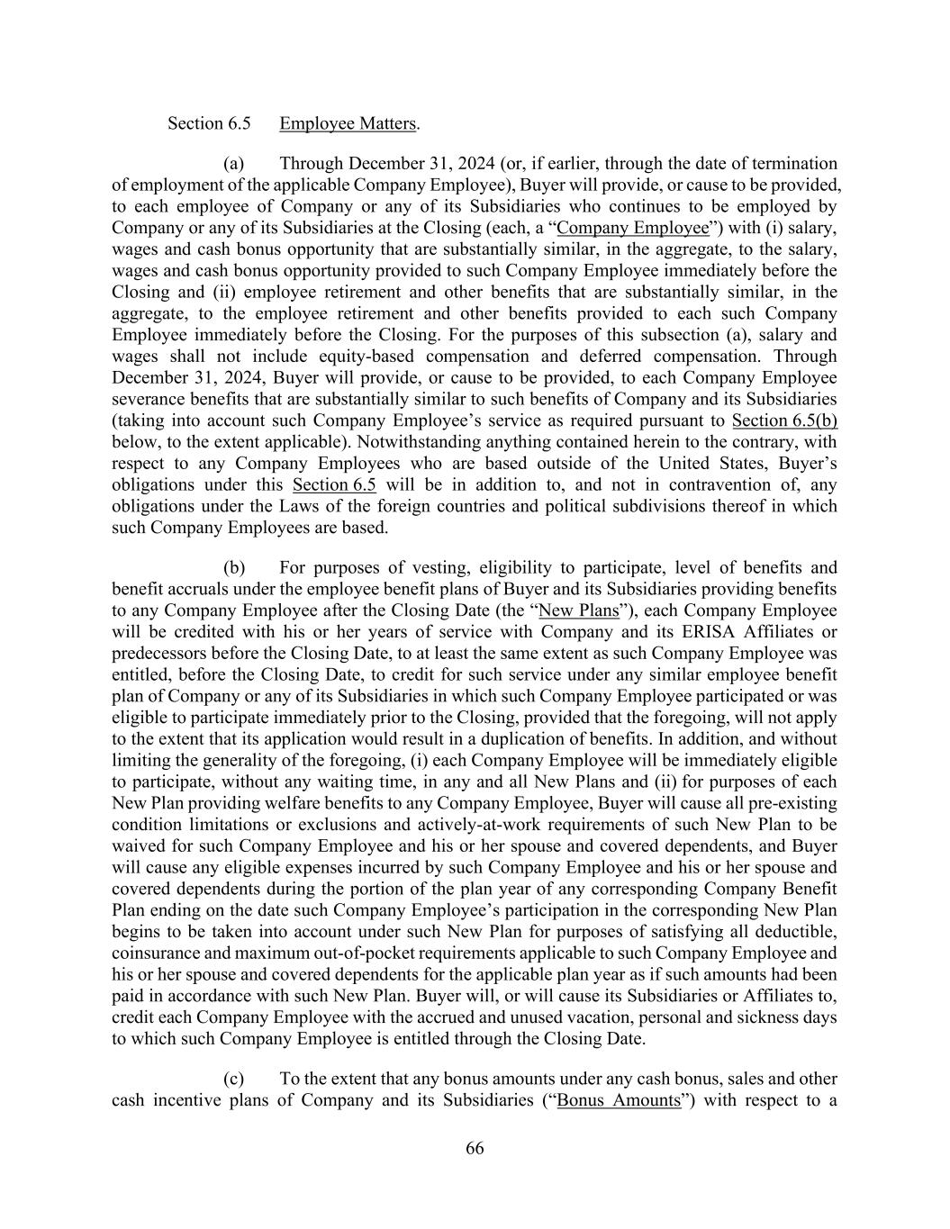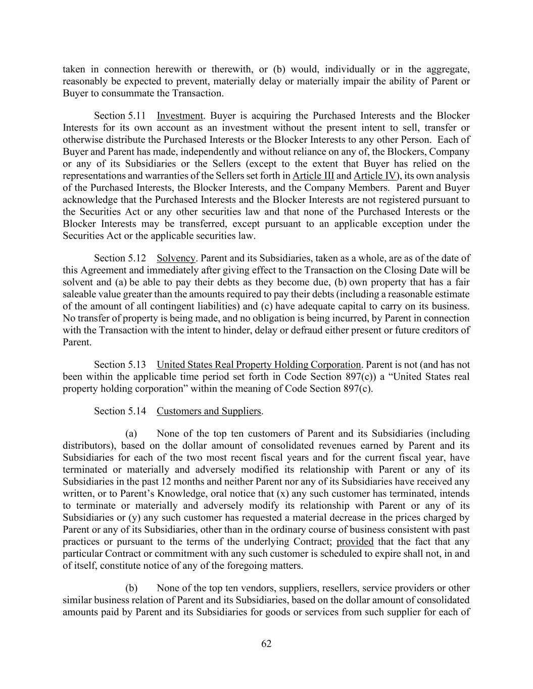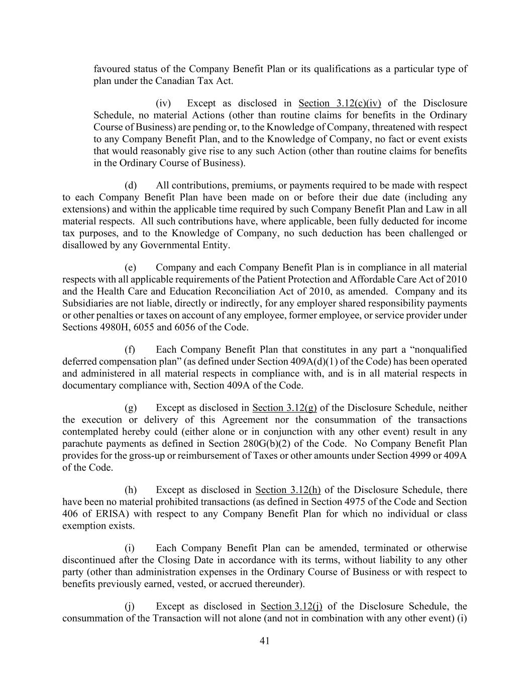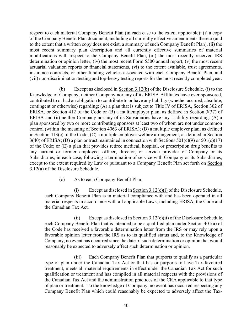 73 AmericasActive:19586302.10 Code, and other federal and state laws. Each Benefit Plan but excluding any Multiemployer Plan, sponsored, maintained, or contributed to by an Obligor or any of its ERISA Affiliates that is intended to qualify under Section 401(a) of the Code has received a favorable determination letter from the IRS or is entitled to rely on a favorable determination letter issued to a preapproved plan sponsor and, to the knowledge of Obligors, nothing has occurred which would prevent, or cause the loss of, such qualification. Each Obligor and ERISA Affiliate has met all applicable requirements under the Code, ERISA and the Pension Protection Act of 2006, and no application for a waiver of the minimum funding standards or an extension of any amortization period has been made with respect to any Pension Plan. (b) There are no pending or, to the knowledge of Obligors, threatened claims, actions or lawsuits, or action by any Governmental Authority, with respect to any Benefit Plan maintained, sponsored, or contributed to by an Obligor or any of its ERISA Affiliates that could reasonably be expected to have a Material Adverse Effect. There has been no prohibited transaction or violation of the fiduciary responsibility rules with respect to any Benefit Plan maintained, sponsored or contributed to by an Obligor or any of its ERISA Affiliates that has resulted in or could reasonably be expected to have a Material Adverse Effect. No Obligor or any of its ERISA Affiliates is or will be using “plan assets” (within the meaning of 29 C.F.R. §2510.3-101, as modified by ERISA Section 3(42) or otherwise) of one or more Benefit Plans with respect to its entrance into, participation in, administration of and performance of the Loans, Letters of Credit, Commitments or Loan Documents. (c) No ERISA Event has occurred or is reasonably expected. As of the most recent valuation date for any Pension Plan, the funding target attainment percentage (as defined in Section 430(d)(2) of the Code) is at least 60%, and no Obligor or ERISA Affiliate knows of any reason that such percentage could reasonably be expected to drop below 60%. No Obligor or ERISA Affiliate has incurred any liability to the PBGC except for the payment of premiums, and no premium payments are due and unpaid. No Obligor or ERISA Affiliate has engaged in a transaction that could be subject to Section 4069 or 4212(c) of ERISA. No Pension Plan has been terminated by its plan administrator or the PBGC, and no fact or circumstance exists that could reasonably be expected to cause the PBGC to institute proceedings to terminate a Pension Plan. (d) With respect to any Foreign Plan (including any Canadian Pension Plan), (i) all employer and employee contributions required by law or by the terms of the Foreign Plan have been made, or, if applicable, accrued, in accordance with normal accounting practices; (ii) the fair market value of the assets of each funded Foreign Plan, the liability of each insurer for any Foreign Plan funded through insurance, or the book reserve established for any Foreign Plan, together with any accrued contributions, is sufficient to procure or provide for the accrued benefit obligations with respect to all current and former participants in such Foreign Plan according to the actuarial assumptions and valuations most recently used to account for such obligations in accordance with applicable generally accepted accounting principles; and (iii) it has been registered as required and has been maintained in good standing with applicable regulatory authorities. No Obligor sponsors, maintains, contributes to, or has any liability under, a Canadian Defined Benefit Pension Plan. No Canadian Pension Event has occurred or is reasonably expected to occur. 9.1.19. [Reserved]. 9.1.20. [Reserved]. 9.1.21. [Reserved]. 9.1.22. Not a Regulated Entity. No Obligor is (a) an “investment company” or a “person directly or indirectly controlled by or acting on behalf of an investment company” within the meaning of
