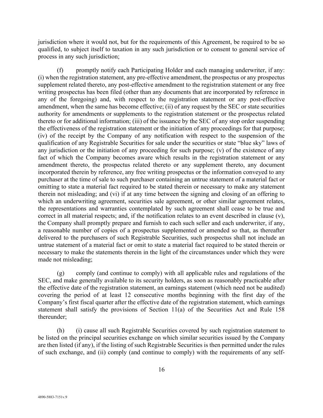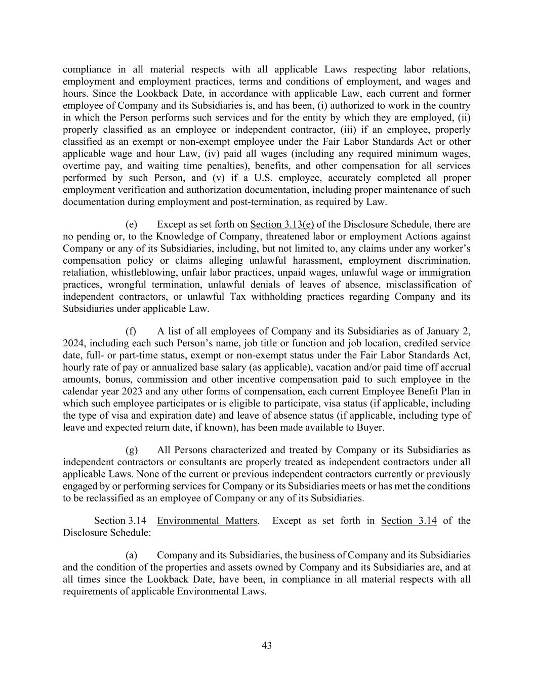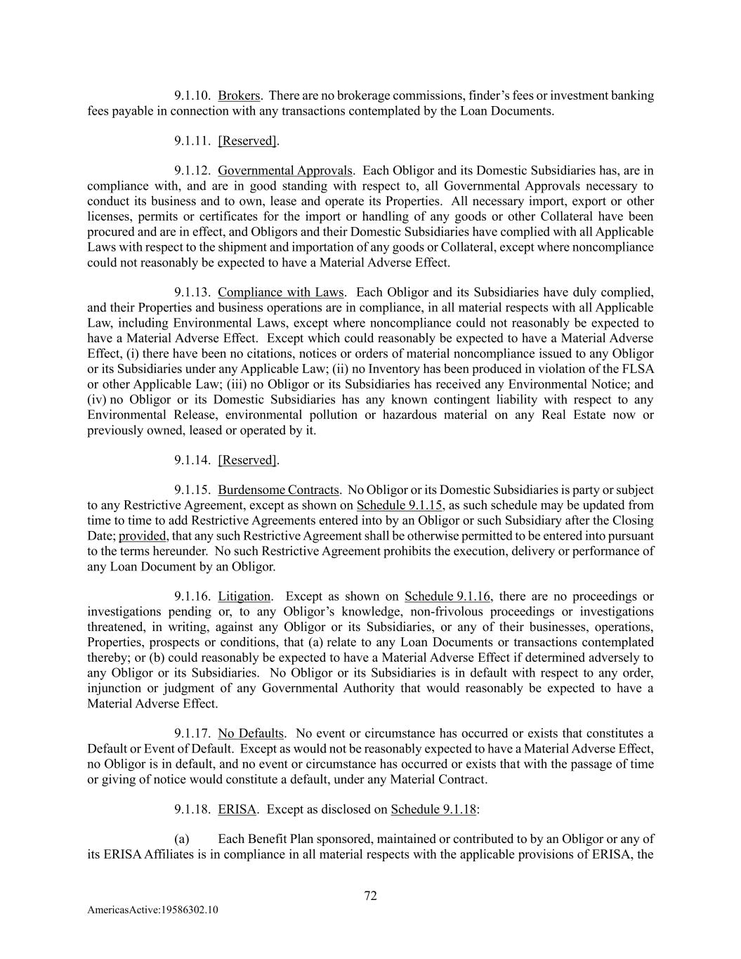 72 AmericasActive:19586302.10 9.1.10. Brokers. There are no brokerage commissions, finder’s fees or investment banking fees payable in connection with any transactions contemplated by the Loan Documents. 9.1.11. [Reserved]. 9.1.12. Governmental Approvals. Each Obligor and its Domestic Subsidiaries has, are in compliance with, and are in good standing with respect to, all Governmental Approvals necessary to conduct its business and to own, lease and operate its Properties. All necessary import, export or other licenses, permits or certificates for the import or handling of any goods or other Collateral have been procured and are in effect, and Obligors and their Domestic Subsidiaries have complied with all Applicable Laws with respect to the shipment and importation of any goods or Collateral, except where noncompliance could not reasonably be expected to have a Material Adverse Effect. 9.1.13. Compliance with Laws. Each Obligor and its Subsidiaries have duly complied, and their Properties and business operations are in compliance, in all material respects with all Applicable Law, including Environmental Laws, except where noncompliance could not reasonably be expected to have a Material Adverse Effect. Except which could reasonably be expected to have a Material Adverse Effect, (i) there have been no citations, notices or orders of material noncompliance issued to any Obligor or its Subsidiaries under any Applicable Law; (ii) no Inventory has been produced in violation of the FLSA or other Applicable Law; (iii) no Obligor or its Subsidiaries has received any Environmental Notice; and (iv) no Obligor or its Domestic Subsidiaries has any known contingent liability with respect to any Environmental Release, environmental pollution or hazardous material on any Real Estate now or previously owned, leased or operated by it. 9.1.14. [Reserved]. 9.1.15. Burdensome Contracts. No Obligor or its Domestic Subsidiaries is party or subject to any Restrictive Agreement, except as shown on Schedule 9.1.15, as such schedule may be updated from time to time to add Restrictive Agreements entered into by an Obligor or such Subsidiary after the Closing Date; provided, that any such Restrictive Agreement shall be otherwise permitted to be entered into pursuant to the terms hereunder. No such Restrictive Agreement prohibits the execution, delivery or performance of any Loan Document by an Obligor. 9.1.16. Litigation. Except as shown on Schedule 9.1.16, there are no proceedings or investigations pending or, to any Obligor’s knowledge, non-frivolous proceedings or investigations threatened, in writing, against any Obligor or its Subsidiaries, or any of their businesses, operations, Properties, prospects or conditions, that (a) relate to any Loan Documents or transactions contemplated thereby; or (b) could reasonably be expected to have a Material Adverse Effect if determined adversely to any Obligor or its Subsidiaries. No Obligor or its Subsidiaries is in default with respect to any order, injunction or judgment of any Governmental Authority that would reasonably be expected to have a Material Adverse Effect. 9.1.17. No Defaults. No event or circumstance has occurred or exists that constitutes a Default or Event of Default. Except as would not be reasonably expected to have a Material Adverse Effect, no Obligor is in default, and no event or circumstance has occurred or exists that with the passage of time or giving of notice would constitute a default, under any Material Contract. 9.1.18. ERISA. Except as disclosed on Schedule 9.1.18: (a) Each Benefit Plan sponsored, maintained or contributed to by an Obligor or any of its ERISA Affiliates is in compliance in all material respects with the applicable provisions of ERISA, the