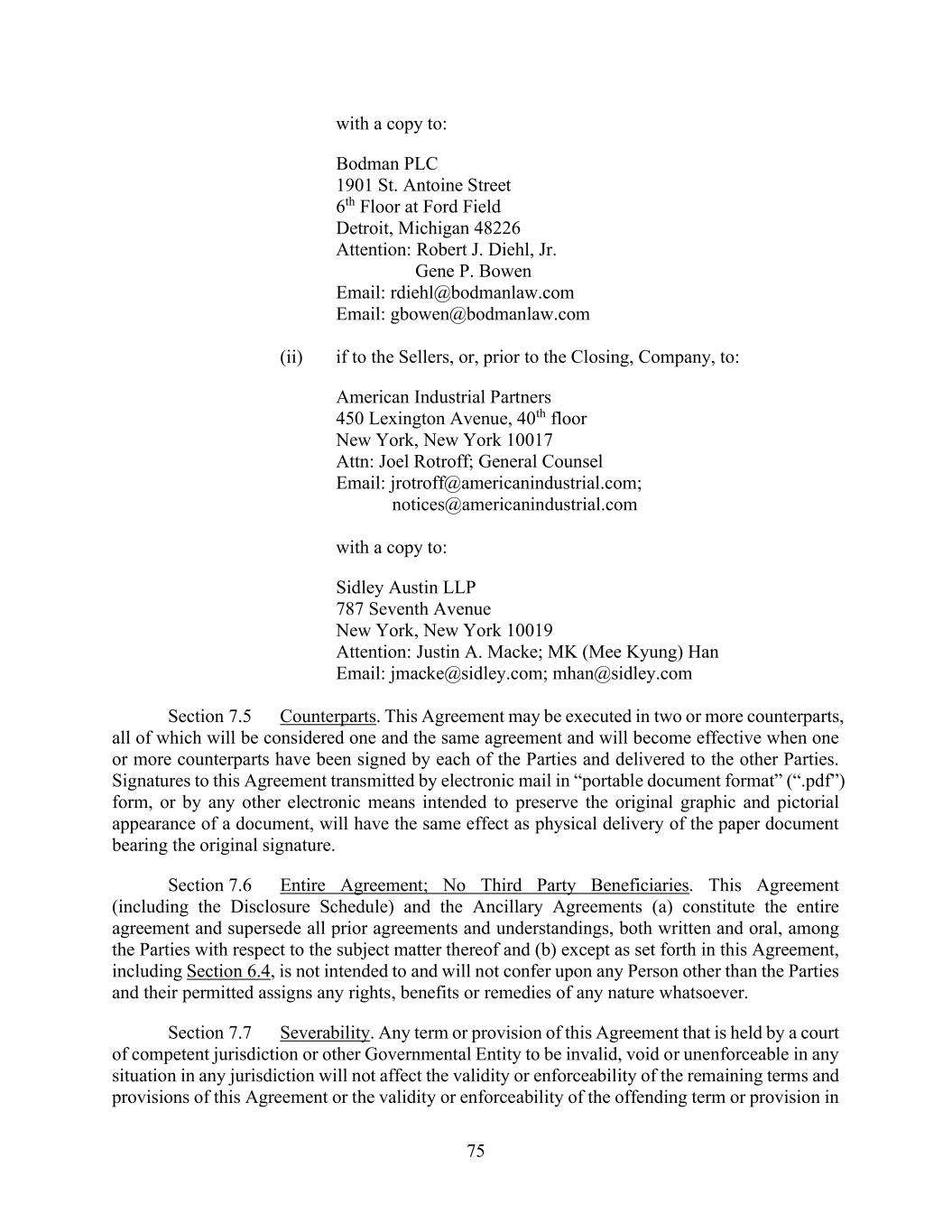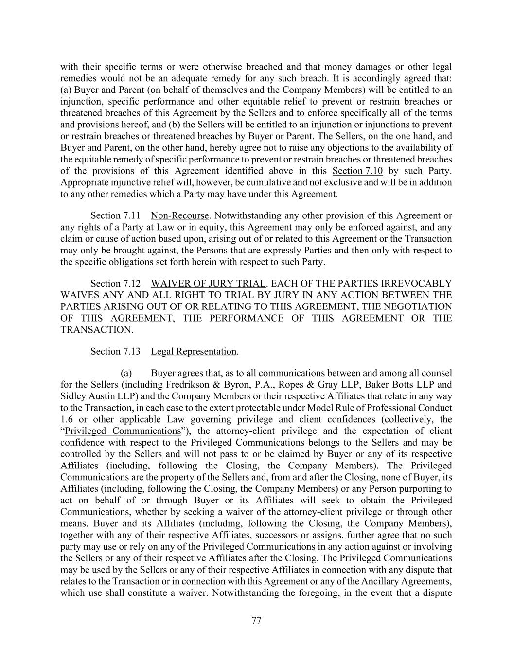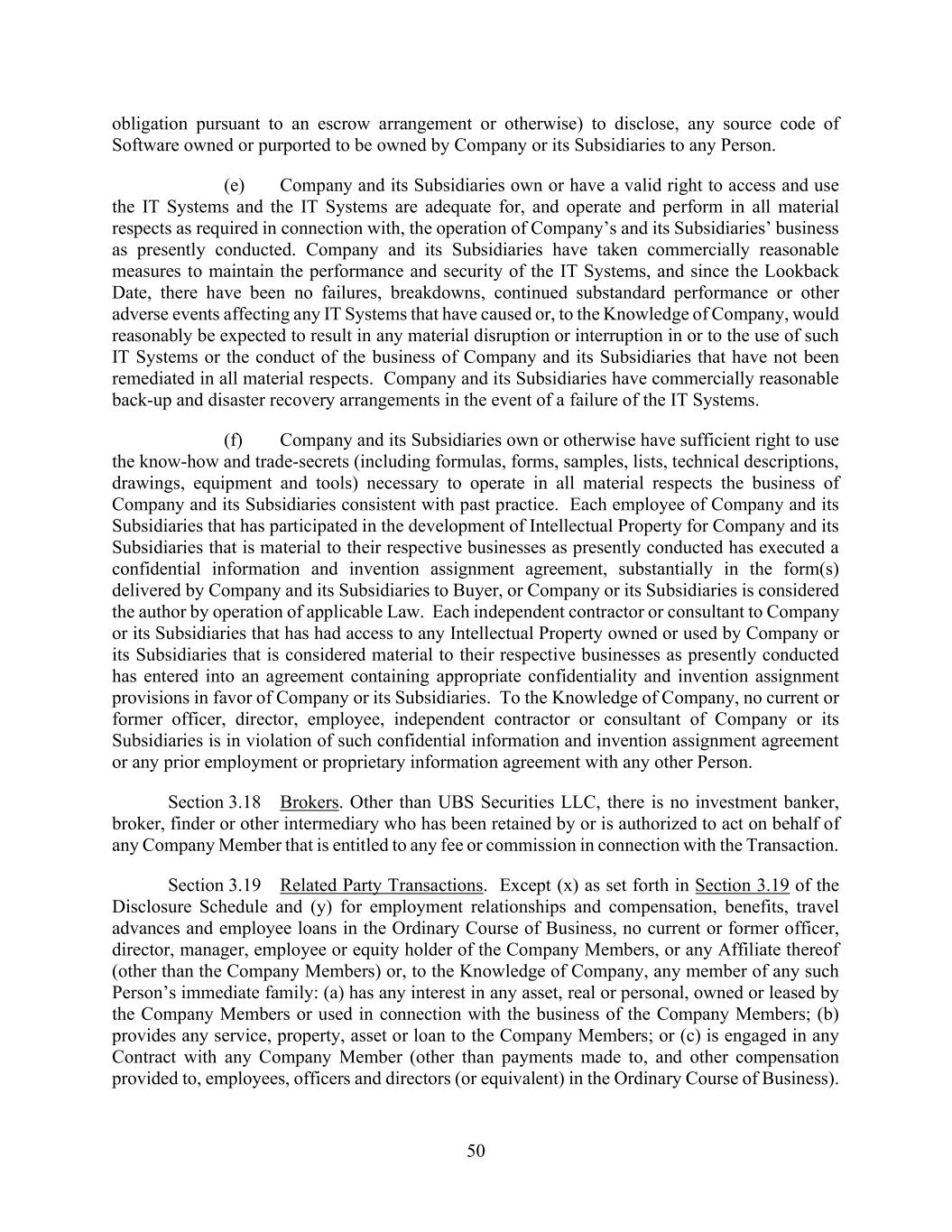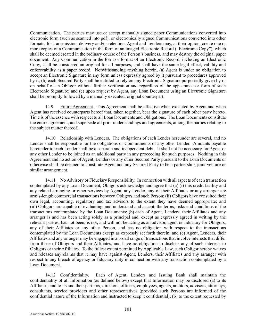 101 AmericasActive:19586302.10 Communication. The parties may use or accept manually signed paper Communications converted into electronic form (such as scanned into pdf), or electronically signed Communications converted into other formats, for transmission, delivery and/or retention. Agent and Lenders may, at their option, create one or more copies of a Communication in the form of an imaged Electronic Record (“Electronic Copy”), which shall be deemed created in the ordinary course of the Person’s business, and may destroy the original paper document. Any Communication in the form or format of an Electronic Record, including an Electronic Copy, shall be considered an original for all purposes, and shall have the same legal effect, validity and enforceability as a paper record. Notwithstanding anything herein, (a) Agent is under no obligation to accept an Electronic Signature in any form unless expressly agreed by it pursuant to procedures approved by it; (b) each Secured Party shall be entitled to rely on any Electronic Signature purportedly given by or on behalf of an Obligor without further verification and regardless of the appearance or form of such Electronic Signature; and (c) upon request by Agent, any Loan Document using an Electronic Signature shall be promptly followed by a manually executed, original counterpart. 14.9 Entire Agreement. This Agreement shall be effective when executed by Agent and when Agent has received counterparts hereof that, taken together, bear the signature of each other party hereto. Time is of the essence with respect to all Loan Documents and Obligations. The Loan Documents constitute the entire agreement, and supersede all prior understandings and agreements, among the parties relating to the subject matter thereof. 14.10 Relationship with Lenders. The obligations of each Lender hereunder are several, and no Lender shall be responsible for the obligations or Commitments of any other Lender. Amounts payable hereunder to each Lender shall be a separate and independent debt. It shall not be necessary for Agent or any other Lender to be joined as an additional party in any proceeding for such purposes. Nothing in this Agreement and no action of Agent, Lenders or any other Secured Party pursuant to the Loan Documents or otherwise shall be deemed to constitute Agent and any Secured Party to be a partnership, joint venture or similar arrangement. 14.11 No Advisory or Fiduciary Responsibility. In connection with all aspects of each transaction contemplated by any Loan Document, Obligors acknowledge and agree that (a) (i) this credit facility and any related arranging or other services by Agent, any Lender, any of their Affiliates or any arranger are arm’s-length commercial transactions between Obligors and such Person; (ii) Obligors have consulted their own legal, accounting, regulatory and tax advisors to the extent they have deemed appropriate; and (iii) Obligors are capable of evaluating, and understand and accept, the terms, risks and conditions of the transactions contemplated by the Loan Documents; (b) each of Agent, Lenders, their Affiliates and any arranger is and has been acting solely as a principal and, except as expressly agreed in writing by the relevant parties, has not been, is not, and will not be acting as an advisor, agent or fiduciary for Obligors, any of their Affiliates or any other Person, and has no obligation with respect to the transactions contemplated by the Loan Documents except as expressly set forth therein; and (c) Agent, Lenders, their Affiliates and any arranger may be engaged in a broad range of transactions that involve interests that differ from those of Obligors and their Affiliates, and have no obligation to disclose any of such interests to Obligors or their Affiliates. To the fullest extent permitted by Applicable Law, each Obligor hereby waives and releases any claims that it may have against Agent, Lenders, their Affiliates and any arranger with respect to any breach of agency or fiduciary duty in connection with any transaction contemplated by a Loan Document. 14.12 Confidentiality. Each of Agent, Lenders and Issuing Bank shall maintain the confidentiality of all Information (as defined below) except that Information may be disclosed (a) to its Affiliates, and to its and their partners, directors, officers, employees, agents, auditors, advisors, attorneys, consultants, service providers and other representatives (provided such Persons are informed of the confidential nature of the Information and instructed to keep it confidential); (b) to the extent requested by