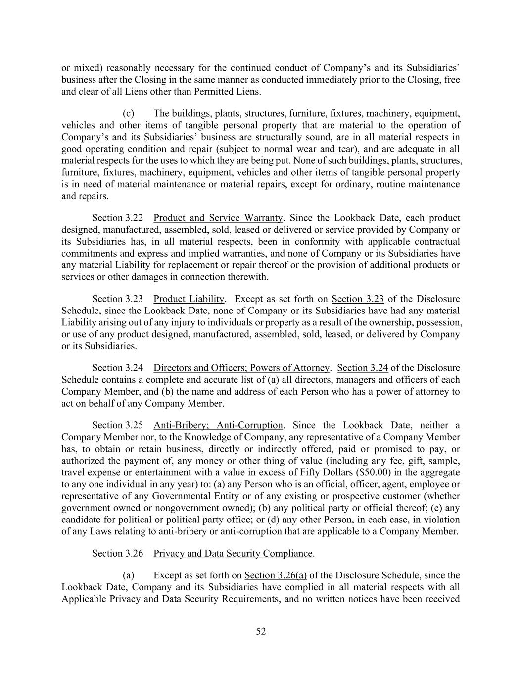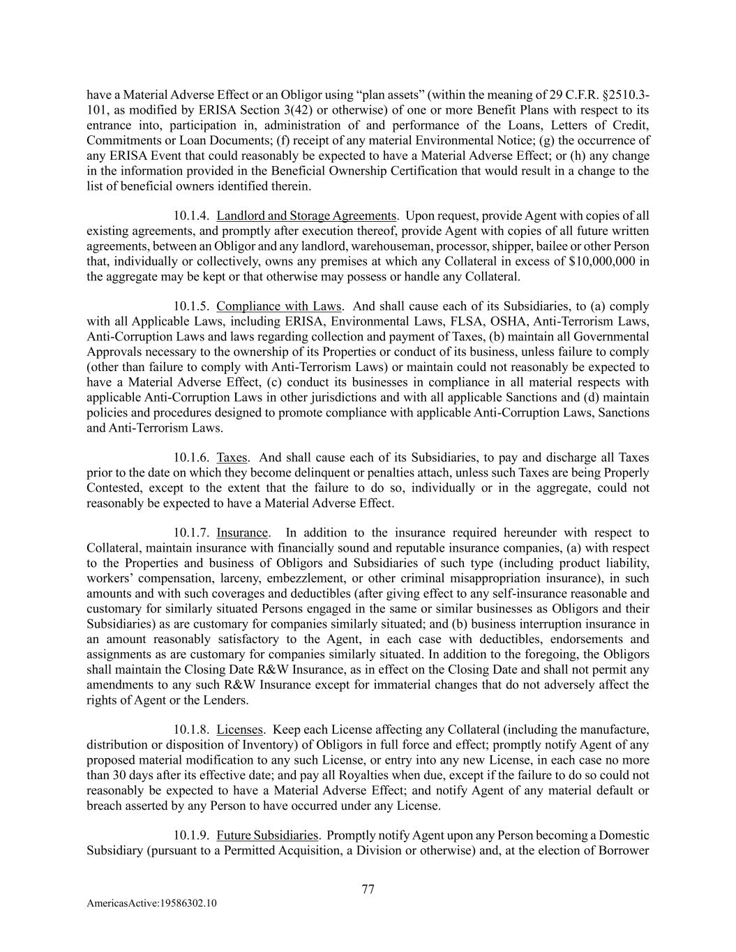77 AmericasActive:19586302.10 have a Material Adverse Effect or an Obligor using “plan assets” (within the meaning of 29 C.F.R. §2510.3- 101, as modified by ERISA Section 3(42) or otherwise) of one or more Benefit Plans with respect to its entrance into, participation in, administration of and performance of the Loans, Letters of Credit, Commitments or Loan Documents; (f) receipt of any material Environmental Notice; (g) the occurrence of any ERISA Event that could reasonably be expected to have a Material Adverse Effect; or (h) any change in the information provided in the Beneficial Ownership Certification that would result in a change to the list of beneficial owners identified therein. 10.1.4. Landlord and Storage Agreements. Upon request, provide Agent with copies of all existing agreements, and promptly after execution thereof, provide Agent with copies of all future written agreements, between an Obligor and any landlord, warehouseman, processor, shipper, bailee or other Person that, individually or collectively, owns any premises at which any Collateral in excess of $10,000,000 in the aggregate may be kept or that otherwise may possess or handle any Collateral. 10.1.5. Compliance with Laws. And shall cause each of its Subsidiaries, to (a) comply with all Applicable Laws, including ERISA, Environmental Laws, FLSA, OSHA, Anti-Terrorism Laws, Anti-Corruption Laws and laws regarding collection and payment of Taxes, (b) maintain all Governmental Approvals necessary to the ownership of its Properties or conduct of its business, unless failure to comply (other than failure to comply with Anti-Terrorism Laws) or maintain could not reasonably be expected to have a Material Adverse Effect, (c) conduct its businesses in compliance in all material respects with applicable Anti-Corruption Laws in other jurisdictions and with all applicable Sanctions and (d) maintain policies and procedures designed to promote compliance with applicable Anti-Corruption Laws, Sanctions and Anti-Terrorism Laws. 10.1.6. Taxes. And shall cause each of its Subsidiaries, to pay and discharge all Taxes prior to the date on which they become delinquent or penalties attach, unless such Taxes are being Properly Contested, except to the extent that the failure to do so, individually or in the aggregate, could not reasonably be expected to have a Material Adverse Effect. 10.1.7. Insurance. In addition to the insurance required hereunder with respect to Collateral, maintain insurance with financially sound and reputable insurance companies, (a) with respect to the Properties and business of Obligors and Subsidiaries of such type (including product liability, workers’ compensation, larceny, embezzlement, or other criminal misappropriation insurance), in such amounts and with such coverages and deductibles (after giving effect to any self-insurance reasonable and customary for similarly situated Persons engaged in the same or similar businesses as Obligors and their Subsidiaries) as are customary for companies similarly situated; and (b) business interruption insurance in an amount reasonably satisfactory to the Agent, in each case with deductibles, endorsements and assignments as are customary for companies similarly situated. In addition to the foregoing, the Obligors shall maintain the Closing Date R&W Insurance, as in effect on the Closing Date and shall not permit any amendments to any such R&W Insurance except for immaterial changes that do not adversely affect the rights of Agent or the Lenders. 10.1.8. Licenses. Keep each License affecting any Collateral (including the manufacture, distribution or disposition of Inventory) of Obligors in full force and effect; promptly notify Agent of any proposed material modification to any such License, or entry into any new License, in each case no more than 30 days after its effective date; and pay all Royalties when due, except if the failure to do so could not reasonably be expected to have a Material Adverse Effect; and notify Agent of any material default or breach asserted by any Person to have occurred under any License. 10.1.9. Future Subsidiaries. Promptly notify Agent upon any Person becoming a Domestic Subsidiary (pursuant to a Permitted Acquisition, a Division or otherwise) and, at the election of Borrower