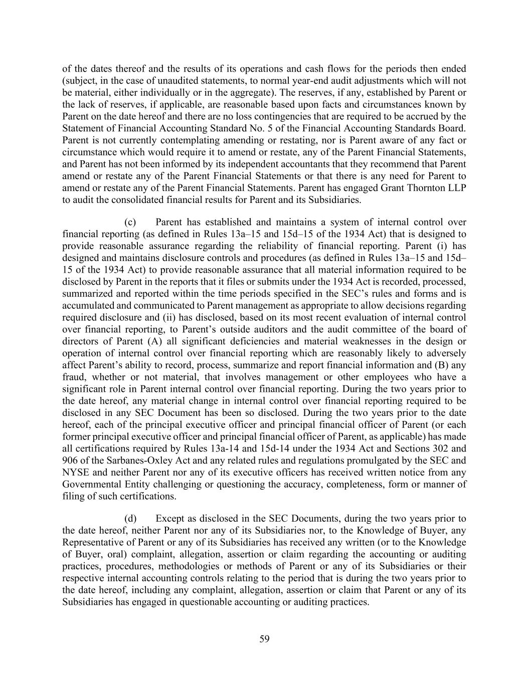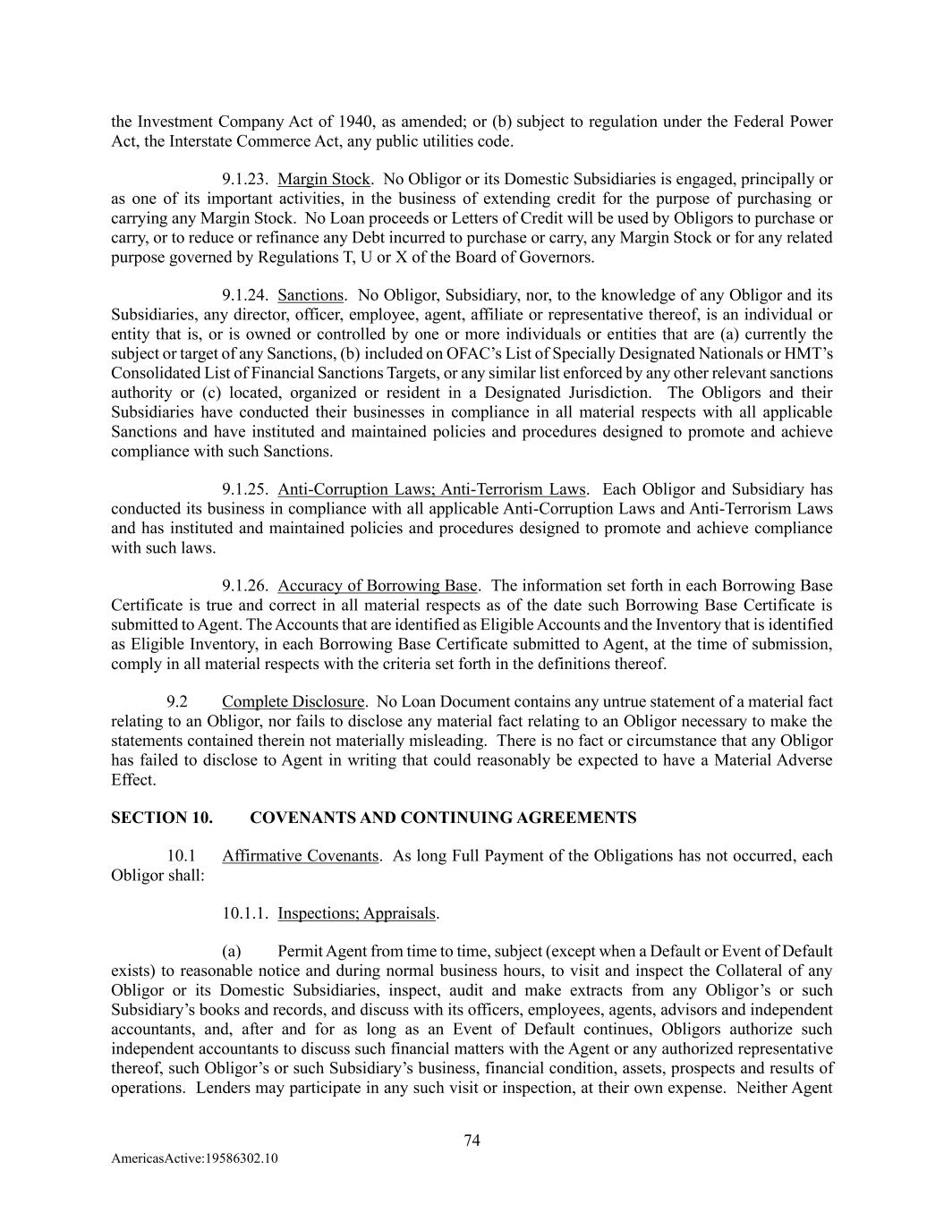 74 AmericasActive:19586302.10 the Investment Company Act of 1940, as amended; or (b) subject to regulation under the Federal Power Act, the Interstate Commerce Act, any public utilities code. 9.1.23. Margin Stock. No Obligor or its Domestic Subsidiaries is engaged, principally or as one of its important activities, in the business of extending credit for the purpose of purchasing or carrying any Margin Stock. No Loan proceeds or Letters of Credit will be used by Obligors to purchase or carry, or to reduce or refinance any Debt incurred to purchase or carry, any Margin Stock or for any related purpose governed by Regulations T, U or X of the Board of Governors. 9.1.24. Sanctions. No Obligor, Subsidiary, nor, to the knowledge of any Obligor and its Subsidiaries, any director, officer, employee, agent, affiliate or representative thereof, is an individual or entity that is, or is owned or controlled by one or more individuals or entities that are (a) currently the subject or target of any Sanctions, (b) included on OFAC’s List of Specially Designated Nationals or HMT’s Consolidated List of Financial Sanctions Targets, or any similar list enforced by any other relevant sanctions authority or (c) located, organized or resident in a Designated Jurisdiction. The Obligors and their Subsidiaries have conducted their businesses in compliance in all material respects with all applicable Sanctions and have instituted and maintained policies and procedures designed to promote and achieve compliance with such Sanctions. 9.1.25. Anti-Corruption Laws; Anti-Terrorism Laws. Each Obligor and Subsidiary has conducted its business in compliance with all applicable Anti-Corruption Laws and Anti-Terrorism Laws and has instituted and maintained policies and procedures designed to promote and achieve compliance with such laws. 9.1.26. Accuracy of Borrowing Base. The information set forth in each Borrowing Base Certificate is true and correct in all material respects as of the date such Borrowing Base Certificate is submitted to Agent. The Accounts that are identified as Eligible Accounts and the Inventory that is identified as Eligible Inventory, in each Borrowing Base Certificate submitted to Agent, at the time of submission, comply in all material respects with the criteria set forth in the definitions thereof. 9.2 Complete Disclosure. No Loan Document contains any untrue statement of a material fact relating to an Obligor, nor fails to disclose any material fact relating to an Obligor necessary to make the statements contained therein not materially misleading. There is no fact or circumstance that any Obligor has failed to disclose to Agent in writing that could reasonably be expected to have a Material Adverse Effect. SECTION 10. COVENANTS AND CONTINUING AGREEMENTS 10.1 Affirmative Covenants. As long Full Payment of the Obligations has not occurred, each Obligor shall: 10.1.1. Inspections; Appraisals. (a) Permit Agent from time to time, subject (except when a Default or Event of Default exists) to reasonable notice and during normal business hours, to visit and inspect the Collateral of any Obligor or its Domestic Subsidiaries, inspect, audit and make extracts from any Obligor’s or such Subsidiary’s books and records, and discuss with its officers, employees, agents, advisors and independent accountants, and, after and for as long as an Event of Default continues, Obligors authorize such independent accountants to discuss such financial matters with the Agent or any authorized representative thereof, such Obligor’s or such Subsidiary’s business, financial condition, assets, prospects and results of operations. Lenders may participate in any such visit or inspection, at their own expense. Neither Agent