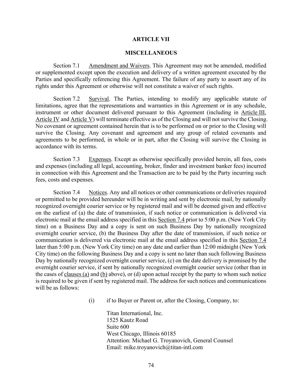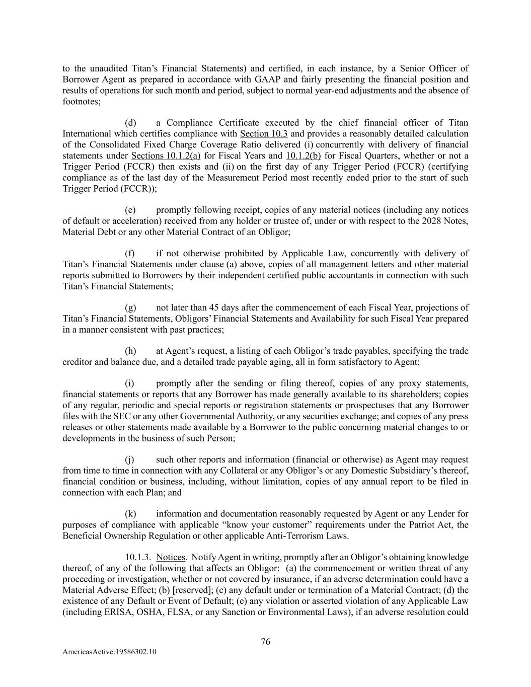 76 AmericasActive:19586302.10 to the unaudited Titan’s Financial Statements) and certified, in each instance, by a Senior Officer of Borrower Agent as prepared in accordance with GAAP and fairly presenting the financial position and results of operations for such month and period, subject to normal year-end adjustments and the absence of footnotes; (d) a Compliance Certificate executed by the chief financial officer of Titan International which certifies compliance with Section 10.3 and provides a reasonably detailed calculation of the Consolidated Fixed Charge Coverage Ratio delivered (i) concurrently with delivery of financial statements under Sections 10.1.2(a) for Fiscal Years and 10.1.2(b) for Fiscal Quarters, whether or not a Trigger Period (FCCR) then exists and (ii) on the first day of any Trigger Period (FCCR) (certifying compliance as of the last day of the Measurement Period most recently ended prior to the start of such Trigger Period (FCCR)); (e) promptly following receipt, copies of any material notices (including any notices of default or acceleration) received from any holder or trustee of, under or with respect to the 2028 Notes, Material Debt or any other Material Contract of an Obligor; (f) if not otherwise prohibited by Applicable Law, concurrently with delivery of Titan’s Financial Statements under clause (a) above, copies of all management letters and other material reports submitted to Borrowers by their independent certified public accountants in connection with such Titan’s Financial Statements; (g) not later than 45 days after the commencement of each Fiscal Year, projections of Titan’s Financial Statements, Obligors’ Financial Statements and Availability for such Fiscal Year prepared in a manner consistent with past practices; (h) at Agent’s request, a listing of each Obligor’s trade payables, specifying the trade creditor and balance due, and a detailed trade payable aging, all in form satisfactory to Agent; (i) promptly after the sending or filing thereof, copies of any proxy statements, financial statements or reports that any Borrower has made generally available to its shareholders; copies of any regular, periodic and special reports or registration statements or prospectuses that any Borrower files with the SEC or any other Governmental Authority, or any securities exchange; and copies of any press releases or other statements made available by a Borrower to the public concerning material changes to or developments in the business of such Person; (j) such other reports and information (financial or otherwise) as Agent may request from time to time in connection with any Collateral or any Obligor’s or any Domestic Subsidiary’s thereof, financial condition or business, including, without limitation, copies of any annual report to be filed in connection with each Plan; and (k) information and documentation reasonably requested by Agent or any Lender for purposes of compliance with applicable “know your customer” requirements under the Patriot Act, the Beneficial Ownership Regulation or other applicable Anti-Terrorism Laws. 10.1.3. Notices. Notify Agent in writing, promptly after an Obligor’s obtaining knowledge thereof, of any of the following that affects an Obligor: (a) the commencement or written threat of any proceeding or investigation, whether or not covered by insurance, if an adverse determination could have a Material Adverse Effect; (b) [reserved]; (c) any default under or termination of a Material Contract; (d) the existence of any Default or Event of Default; (e) any violation or asserted violation of any Applicable Law (including ERISA, OSHA, FLSA, or any Sanction or Environmental Laws), if an adverse resolution could