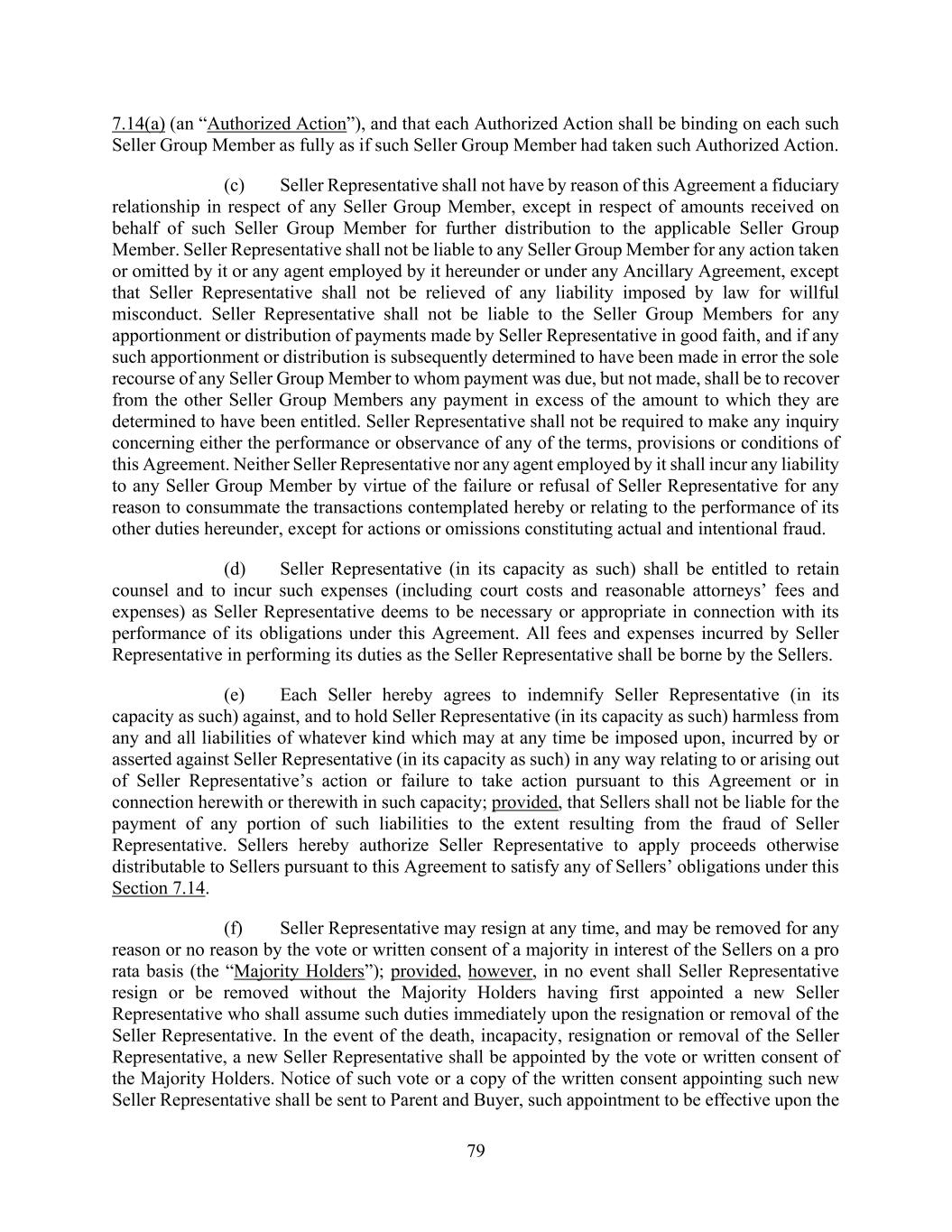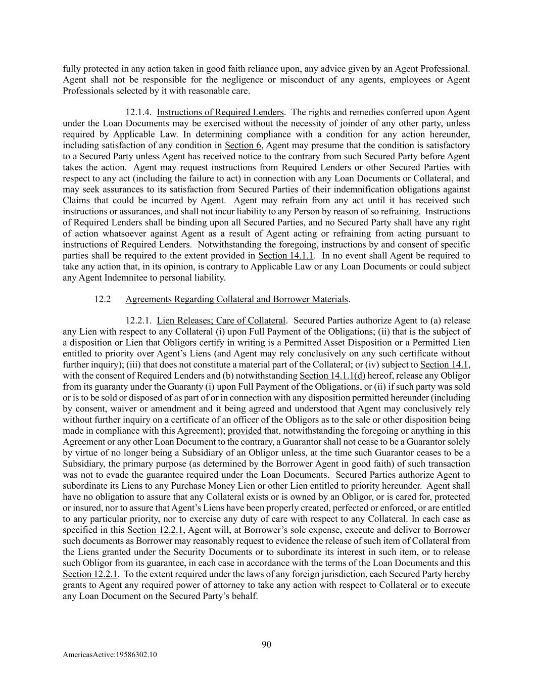 90 AmericasActive:19586302.10 fully protected in any action taken in good faith reliance upon, any advice given by an Agent Professional. Agent shall not be responsible for the negligence or misconduct of any agents, employees or Agent Professionals selected by it with reasonable care. 12.1.4. Instructions of Required Lenders. The rights and remedies conferred upon Agent under the Loan Documents may be exercised without the necessity of joinder of any other party, unless required by Applicable Law. In determining compliance with a condition for any action hereunder, including satisfaction of any condition in Section 6, Agent may presume that the condition is satisfactory to a Secured Party unless Agent has received notice to the contrary from such Secured Party before Agent takes the action. Agent may request instructions from Required Lenders or other Secured Parties with respect to any act (including the failure to act) in connection with any Loan Documents or Collateral, and may seek assurances to its satisfaction from Secured Parties of their indemnification obligations against Claims that could be incurred by Agent. Agent may refrain from any act until it has received such instructions or assurances, and shall not incur liability to any Person by reason of so refraining. Instructions of Required Lenders shall be binding upon all Secured Parties, and no Secured Party shall have any right of action whatsoever against Agent as a result of Agent acting or refraining from acting pursuant to instructions of Required Lenders. Notwithstanding the foregoing, instructions by and consent of specific parties shall be required to the extent provided in Section 14.1.1. In no event shall Agent be required to take any action that, in its opinion, is contrary to Applicable Law or any Loan Documents or could subject any Agent Indemnitee to personal liability. 12.2 Agreements Regarding Collateral and Borrower Materials. 12.2.1. Lien Releases; Care of Collateral. Secured Parties authorize Agent to (a) release any Lien with respect to any Collateral (i) upon Full Payment of the Obligations; (ii) that is the subject of a disposition or Lien that Obligors certify in writing is a Permitted Asset Disposition or a Permitted Lien entitled to priority over Agent’s Liens (and Agent may rely conclusively on any such certificate without further inquiry); (iii) that does not constitute a material part of the Collateral; or (iv) subject to Section 14.1, with the consent of Required Lenders and (b) notwithstanding Section 14.1.1(d) hereof, release any Obligor from its guaranty under the Guaranty (i) upon Full Payment of the Obligations, or (ii) if such party was sold or is to be sold or disposed of as part of or in connection with any disposition permitted hereunder (including by consent, waiver or amendment and it being agreed and understood that Agent may conclusively rely without further inquiry on a certificate of an officer of the Obligors as to the sale or other disposition being made in compliance with this Agreement); provided that, notwithstanding the foregoing or anything in this Agreement or any other Loan Document to the contrary, a Guarantor shall not cease to be a Guarantor solely by virtue of no longer being a Subsidiary of an Obligor unless, at the time such Guarantor ceases to be a Subsidiary, the primary purpose (as determined by the Borrower Agent in good faith) of such transaction was not to evade the guarantee required under the Loan Documents. Secured Parties authorize Agent to subordinate its Liens to any Purchase Money Lien or other Lien entitled to priority hereunder. Agent shall have no obligation to assure that any Collateral exists or is owned by an Obligor, or is cared for, protected or insured, nor to assure that Agent’s Liens have been properly created, perfected or enforced, or are entitled to any particular priority, nor to exercise any duty of care with respect to any Collateral. In each case as specified in this Section 12.2.1, Agent will, at Borrower’s sole expense, execute and deliver to Borrower such documents as Borrower may reasonably request to evidence the release of such item of Collateral from the Liens granted under the Security Documents or to subordinate its interest in such item, or to release such Obligor from its guarantee, in each case in accordance with the terms of the Loan Documents and this Section 12.2.1. To the extent required under the laws of any foreign jurisdiction, each Secured Party hereby grants to Agent any required power of attorney to take any action with respect to Collateral or to execute any Loan Document on the Secured Party’s behalf.