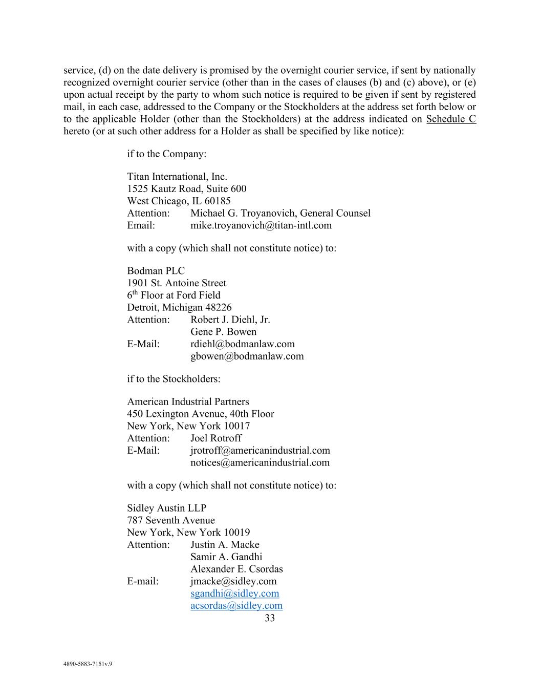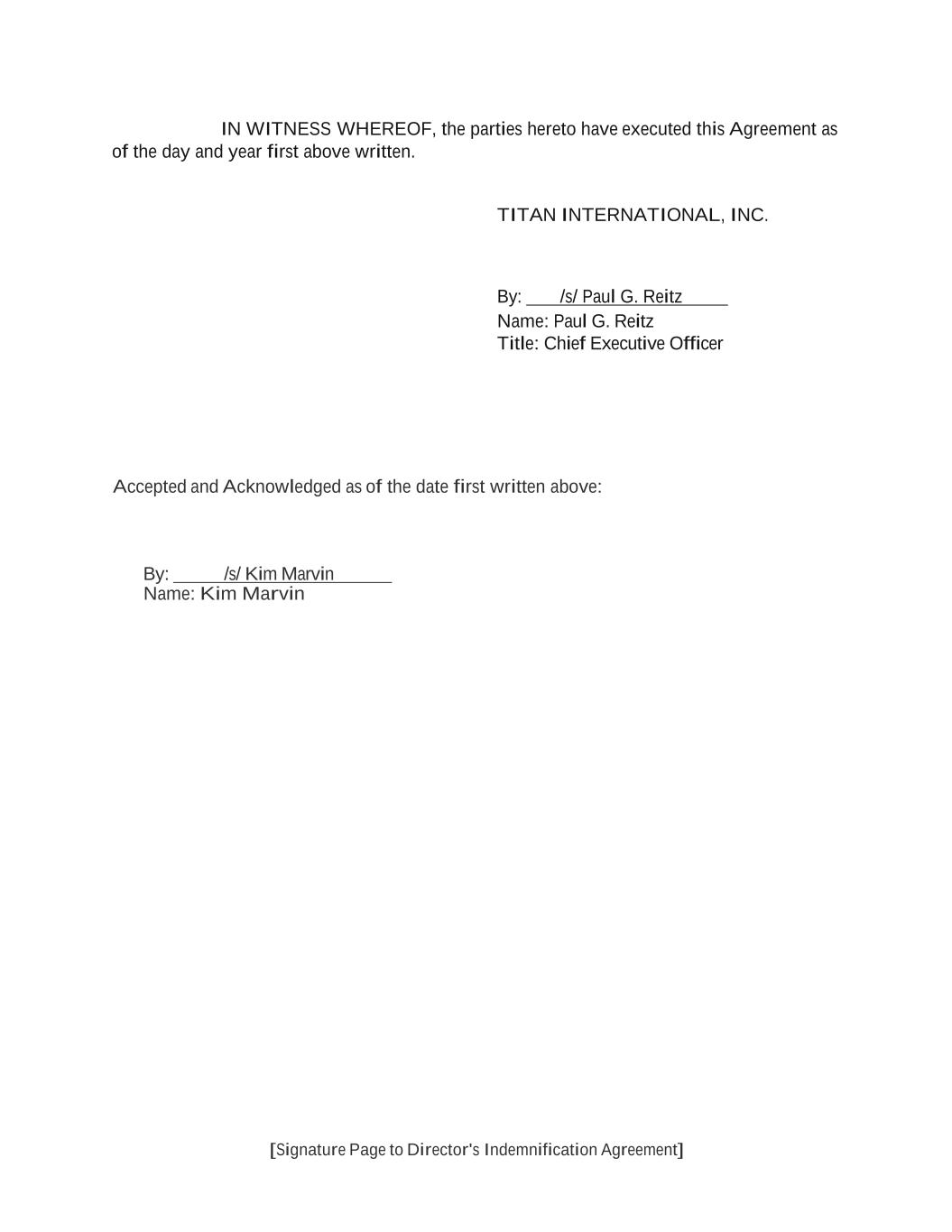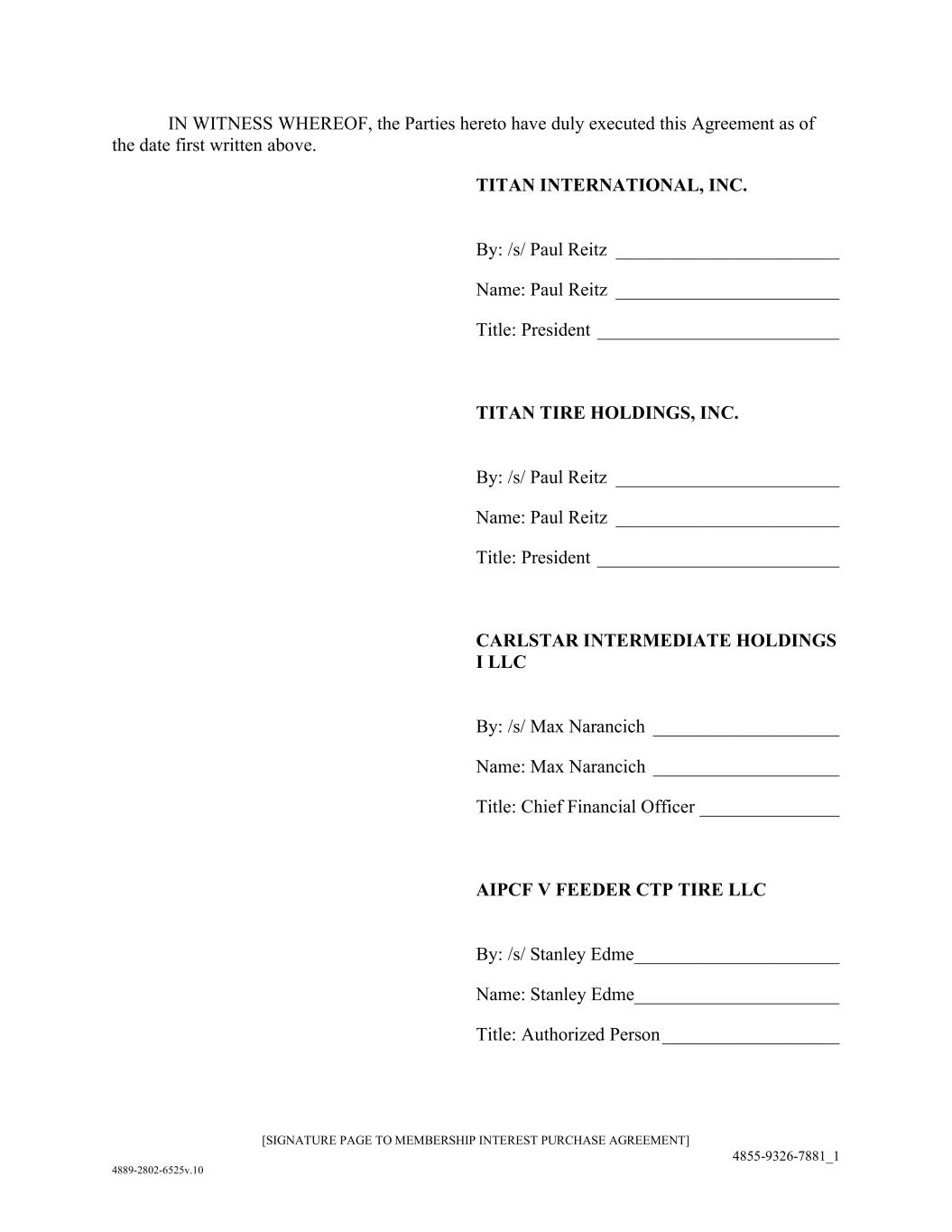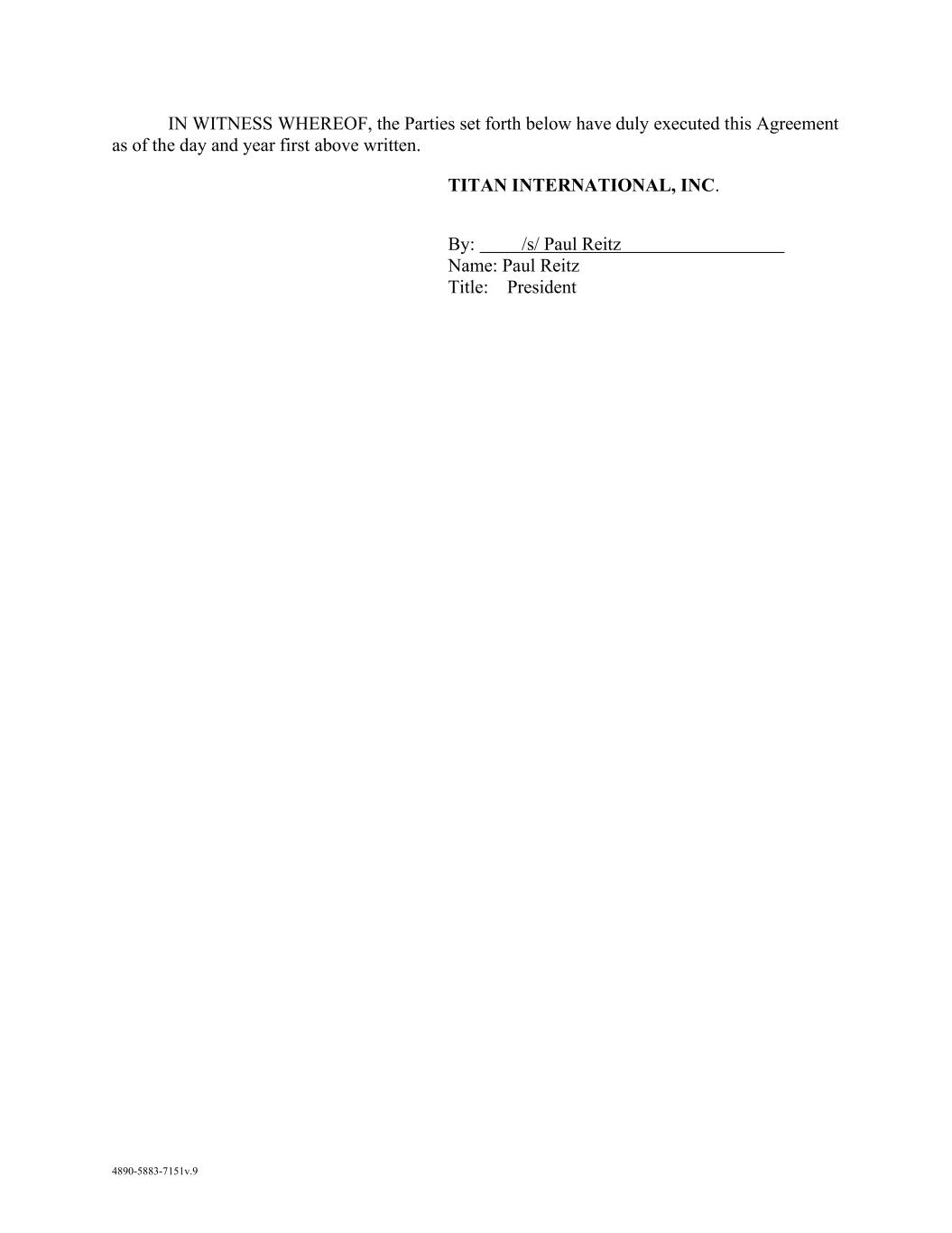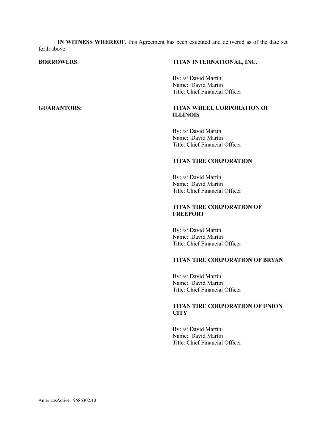 AmericasActive:19586302.10 IN WITNESS WHEREOF, this Agreement has been executed and delivered as of the date set forth above. BORROWERS: TITAN INTERNATIONAL, INC. By: /s/ David Martin Name: David Martin Title: Chief Financial Officer GUARANTORS: TITAN WHEEL CORPORATION OF ILLINOIS By: /s/ David Martin Name: David Martin Title: Chief Financial Officer TITAN TIRE CORPORATION By: /s/ David Martin Name: David Martin Title: Chief Financial Officer TITAN TIRE CORPORATION OF FREEPORT By: /s/ David Martin Name: David Martin Title: Chief Financial Officer TITAN TIRE CORPORATION OF BRYAN By: /s/ David Martin Name: David Martin Title: Chief Financial Officer TITAN TIRE CORPORATION OF UNION CITY By: /s/ David Martin Name: David Martin Title: Chief Financial Officer