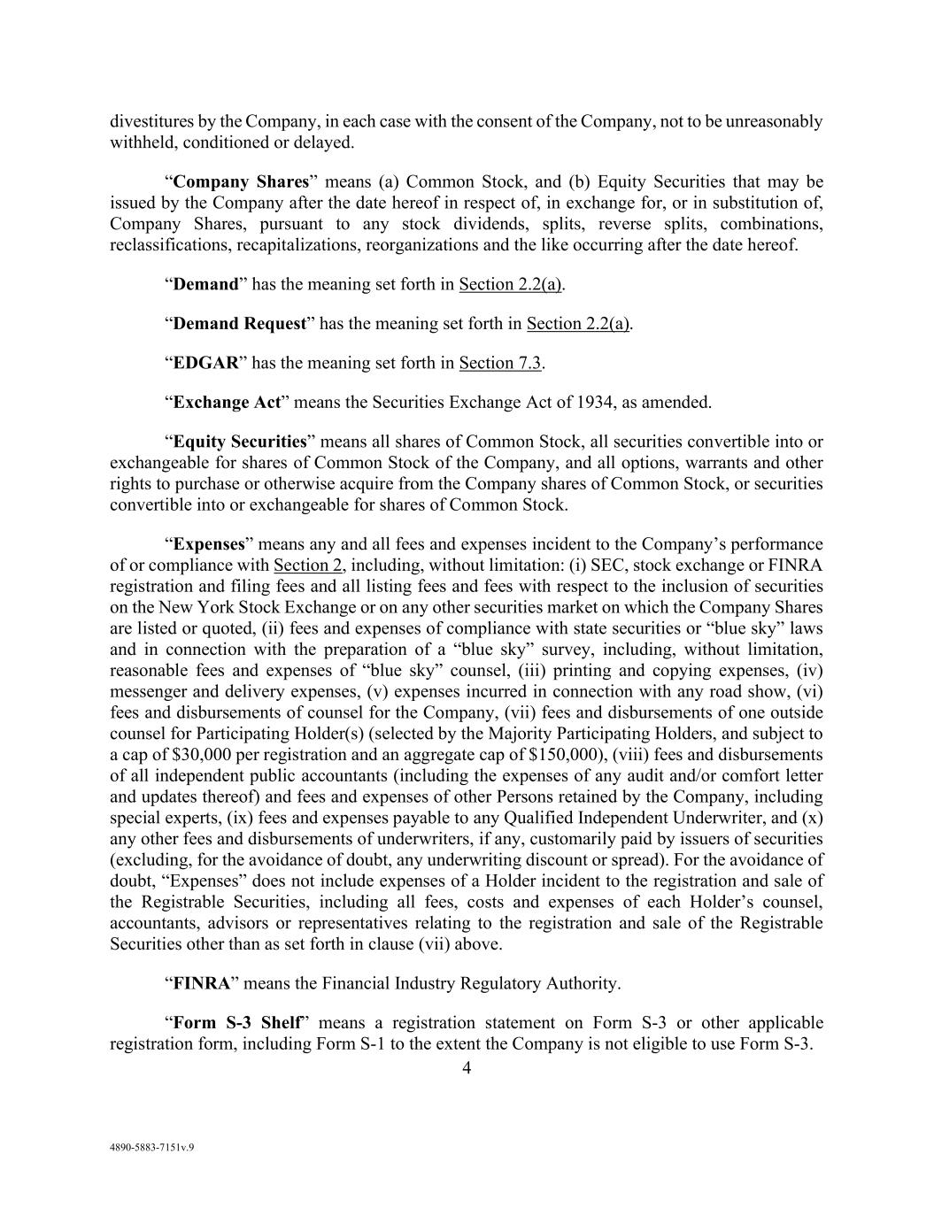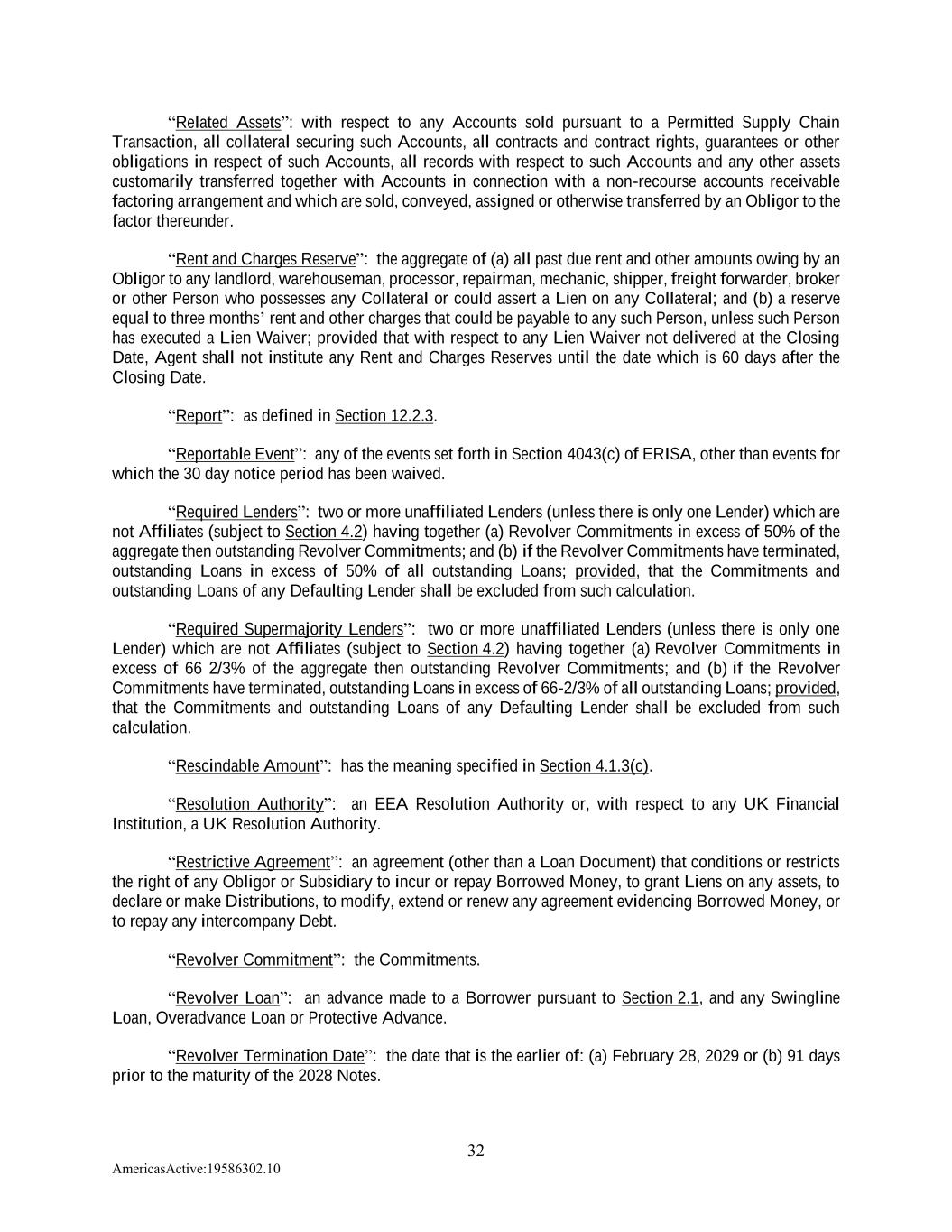 32 AmericasActive:19586302.10 “Related Assets”: with respect to any Accounts sold pursuant to a Permitted Supply Chain Transaction, all collateral securing such Accounts, all contracts and contract rights, guarantees or other obligations in respect of such Accounts, all records with respect to such Accounts and any other assets customarily transferred together with Accounts in connection with a non-recourse accounts receivable factoring arrangement and which are sold, conveyed, assigned or otherwise transferred by an Obligor to the factor thereunder. “Rent and Charges Reserve”: the aggregate of (a) all past due rent and other amounts owing by an Obligor to any landlord, warehouseman, processor, repairman, mechanic, shipper, freight forwarder, broker or other Person who possesses any Collateral or could assert a Lien on any Collateral; and (b) a reserve equal to three months’ rent and other charges that could be payable to any such Person, unless such Person has executed a Lien Waiver; provided that with respect to any Lien Waiver not delivered at the Closing Date, Agent shall not institute any Rent and Charges Reserves until the date which is 60 days after the Closing Date. “Report”: as defined in Section 12.2.3. “Reportable Event”: any of the events set forth in Section 4043(c) of ERISA, other than events for which the 30 day notice period has been waived. “Required Lenders”: two or more unaffiliated Lenders (unless there is only one Lender) which are not Affiliates (subject to Section 4.2) having together (a) Revolver Commitments in excess of 50% of the aggregate then outstanding Revolver Commitments; and (b) if the Revolver Commitments have terminated, outstanding Loans in excess of 50% of all outstanding Loans; provided, that the Commitments and outstanding Loans of any Defaulting Lender shall be excluded from such calculation. “Required Supermajority Lenders”: two or more unaffiliated Lenders (unless there is only one Lender) which are not Affiliates (subject to Section 4.2) having together (a) Revolver Commitments in excess of 66 2/3% of the aggregate then outstanding Revolver Commitments; and (b) if the Revolver Commitments have terminated, outstanding Loans in excess of 66-2/3% of all outstanding Loans; provided, that the Commitments and outstanding Loans of any Defaulting Lender shall be excluded from such calculation. “Rescindable Amount”: has the meaning specified in Section 4.1.3(c). “Resolution Authority”: an EEA Resolution Authority or, with respect to any UK Financial Institution, a UK Resolution Authority. “Restrictive Agreement”: an agreement (other than a Loan Document) that conditions or restricts the right of any Obligor or Subsidiary to incur or repay Borrowed Money, to grant Liens on any assets, to declare or make Distributions, to modify, extend or renew any agreement evidencing Borrowed Money, or to repay any intercompany Debt. “Revolver Commitment”: the Commitments. “Revolver Loan”: an advance made to a Borrower pursuant to Section 2.1, and any Swingline Loan, Overadvance Loan or Protective Advance. “Revolver Termination Date”: the date that is the earlier of: (a) February 28, 2029 or (b) 91 days prior to the maturity of the 2028 Notes.