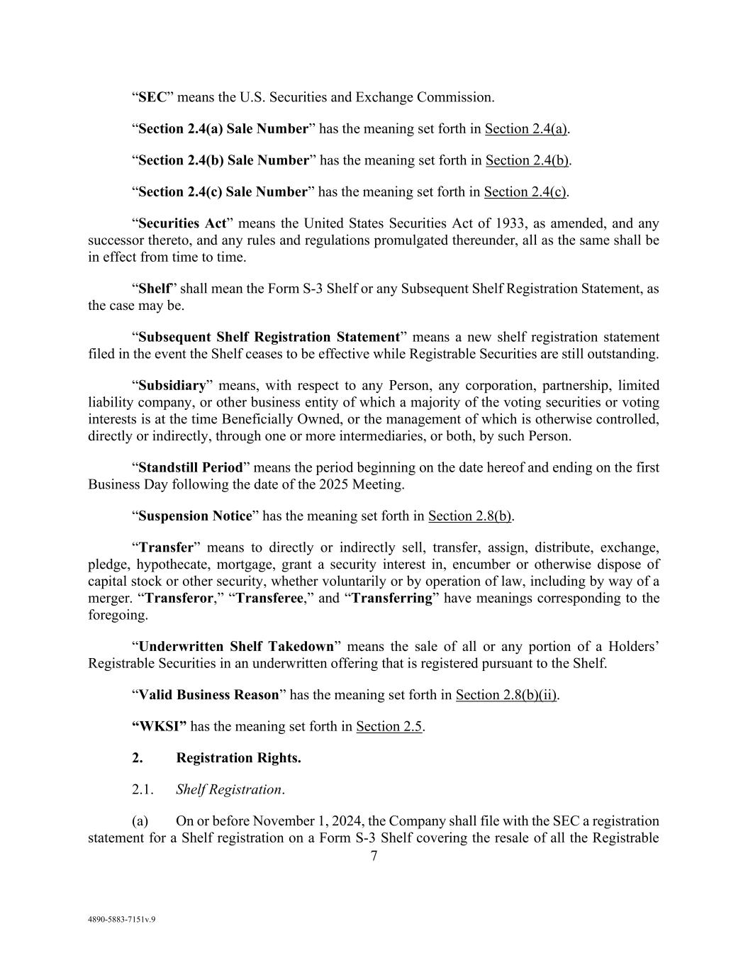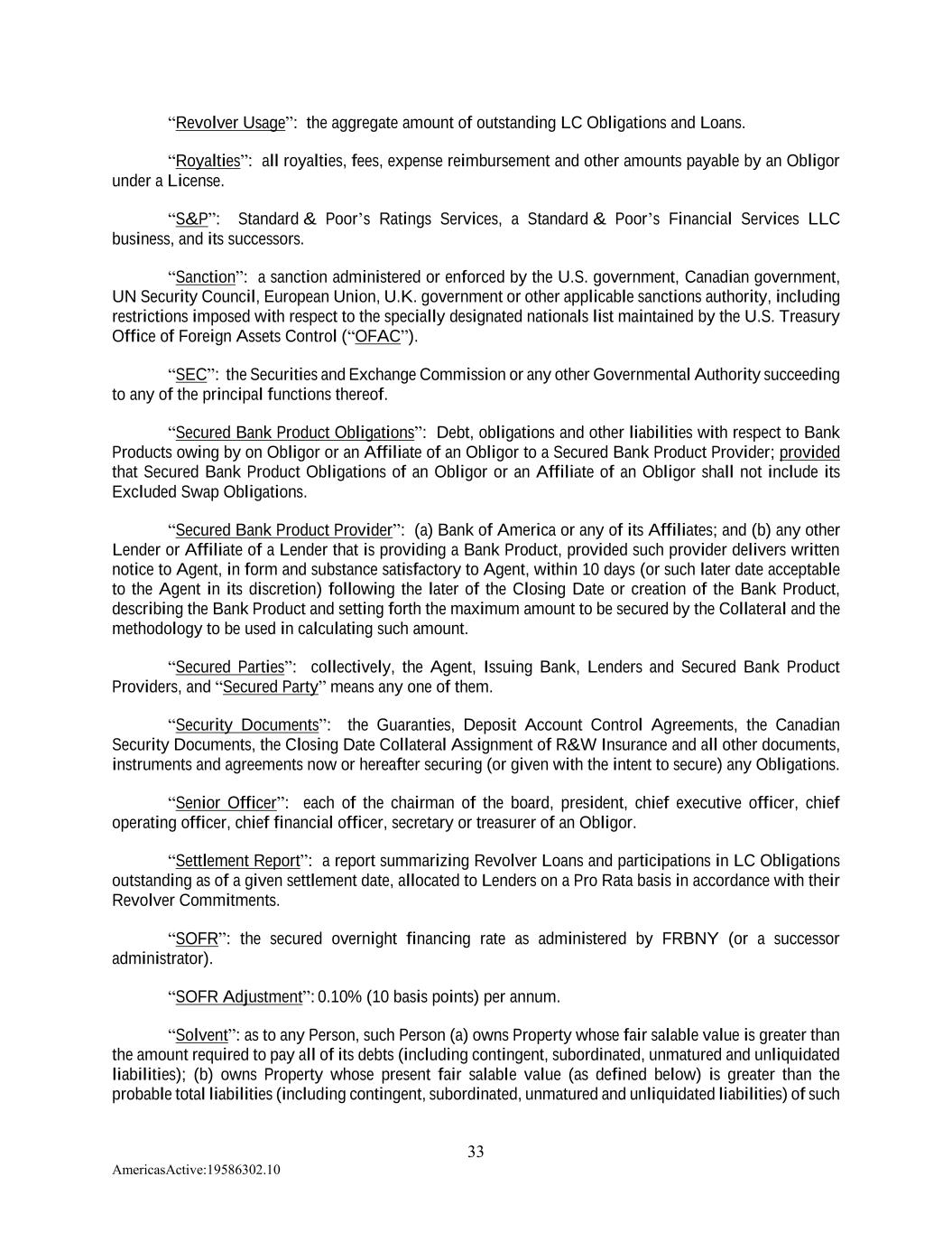 33 AmericasActive:19586302.10 “Revolver Usage”: the aggregate amount of outstanding LC Obligations and Loans. “Royalties”: all royalties, fees, expense reimbursement and other amounts payable by an Obligor under a License. “S&P”: Standard & Poor’s Ratings Services, a Standard & Poor’s Financial Services LLC business, and its successors. “Sanction”: a sanction administered or enforced by the U.S. government, Canadian government, UN Security Council, European Union, U.K. government or other applicable sanctions authority, including restrictions imposed with respect to the specially designated nationals list maintained by the U.S. Treasury Office of Foreign Assets Control (“OFAC”). “SEC”: the Securities and Exchange Commission or any other Governmental Authority succeeding to any of the principal functions thereof. “Secured Bank Product Obligations”: Debt, obligations and other liabilities with respect to Bank Products owing by on Obligor or an Affiliate of an Obligor to a Secured Bank Product Provider; provided that Secured Bank Product Obligations of an Obligor or an Affiliate of an Obligor shall not include its Excluded Swap Obligations. “Secured Bank Product Provider”: (a) Bank of America or any of its Affiliates; and (b) any other Lender or Affiliate of a Lender that is providing a Bank Product, provided such provider delivers written notice to Agent, in form and substance satisfactory to Agent, within 10 days (or such later date acceptable to the Agent in its discretion) following the later of the Closing Date or creation of the Bank Product, describing the Bank Product and setting forth the maximum amount to be secured by the Collateral and the methodology to be used in calculating such amount. “Secured Parties”: collectively, the Agent, Issuing Bank, Lenders and Secured Bank Product Providers, and “Secured Party” means any one of them. “Security Documents”: the Guaranties, Deposit Account Control Agreements, the Canadian Security Documents, the Closing Date Collateral Assignment of R&W Insurance and all other documents, instruments and agreements now or hereafter securing (or given with the intent to secure) any Obligations. “Senior Officer”: each of the chairman of the board, president, chief executive officer, chief operating officer, chief financial officer, secretary or treasurer of an Obligor. “Settlement Report”: a report summarizing Revolver Loans and participations in LC Obligations outstanding as of a given settlement date, allocated to Lenders on a Pro Rata basis in accordance with their Revolver Commitments. “SOFR”: the secured overnight financing rate as administered by FRBNY (or a successor administrator). “SOFR Adjustment”: 0.10% (10 basis points) per annum. “Solvent”: as to any Person, such Person (a) owns Property whose fair salable value is greater than the amount required to pay all of its debts (including contingent, subordinated, unmatured and unliquidated liabilities); (b) owns Property whose present fair salable value (as defined below) is greater than the probable total liabilities (including contingent, subordinated, unmatured and unliquidated liabilities) of such