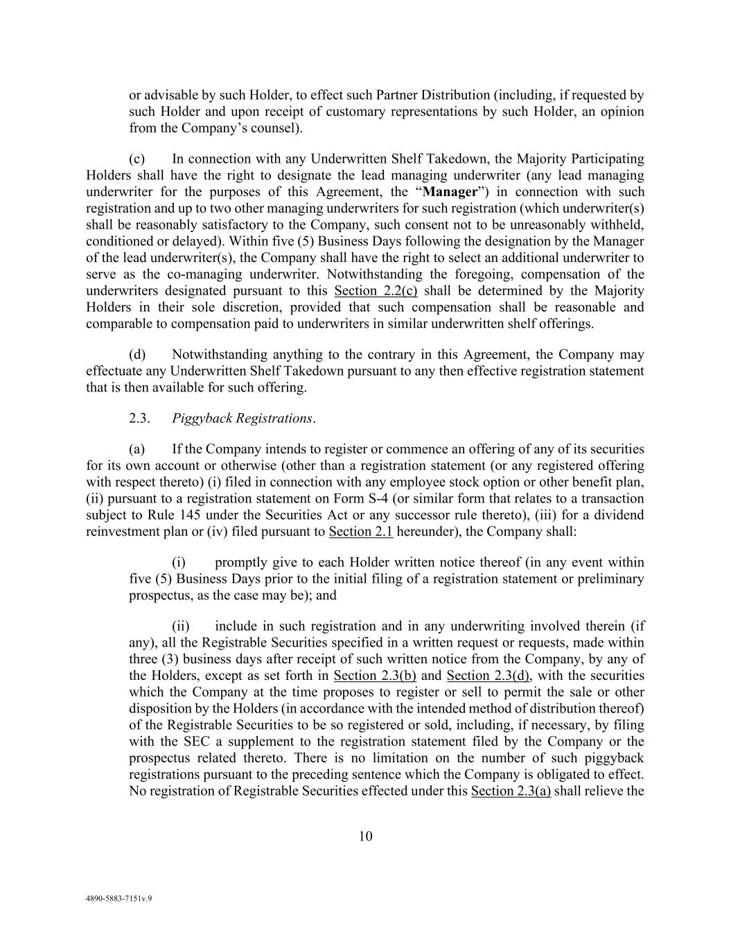 79 AmericasActive:19586302.10 (f) Debt that is in existence when a Person becomes a Subsidiary or that is secured by an asset when acquired by an Obligor, as long as such Debt was not incurred in contemplation of such Person becoming a Subsidiary or such acquisition; (g) Debt: (i) arising from endorsements of Payment Items for collection or deposit in the Ordinary Course of Business; (ii) relating to Swaps entered into in the Ordinary Course of Business and not for speculative purposes; (iii) incurred in the Ordinary Course of Business with respect to surety, appeal or performance bonds, or other similar obligations, including in respect of workers compensation claims, health, disability or other employee benefits or property, casualty or liability insurance or self-insurance or other Debt with respect to reimbursement-type obligations regarding workers compensation claims; (iv) arising from unpaid insurance premiums (not in excess of one year’s premiums) owing to insurance companies and insurance brokers incurred in connection with the financing of insurance premiums; (v) arising from guarantees of the obligations of suppliers, customers, franchisees and licensees of the Borrowers and their Subsidiaries and take-or-pay obligations contained in supply arrangements, and warranties of products or services; and (vi) arising from customary indemnification obligations in favor of purchasers in connection with dispositions of Equipment permitted hereunder; (h) intercompany Debt permitted under Section 10.2.5(a); (i) Debt arising as a direct result of judgments, orders, awards or decrees against the Borrowers or any of their Subsidiaries, in each case not constituting an Event of Default (j) Refinancing Debt as long as each Refinancing Condition is satisfied; (k) the 2028 Notes; (l) Employee benefit plan obligations and liabilities to the extent they are permitted to remain unfunded under Applicable Law and only up to the limits allowable under Applicable Law; (m) Debt in respect of Taxes, assessments, governmental charges or levies and claims for labor, materials, and supplies to the extent payment thereof shall not at the time be required by Section 10.1.5; (n) Debt in an aggregate amount not to exceed $75,000,000; provided that such Debt (i) is either (A) unsecured or (B) solely secured by a Lien on Property not constituting Collateral and (ii) has a maturity date no sooner than the date that is 91 days after the Revolver Termination Date; (o) Contingent Obligations not to exceed $50,000,000 in the aggregate at any time; and