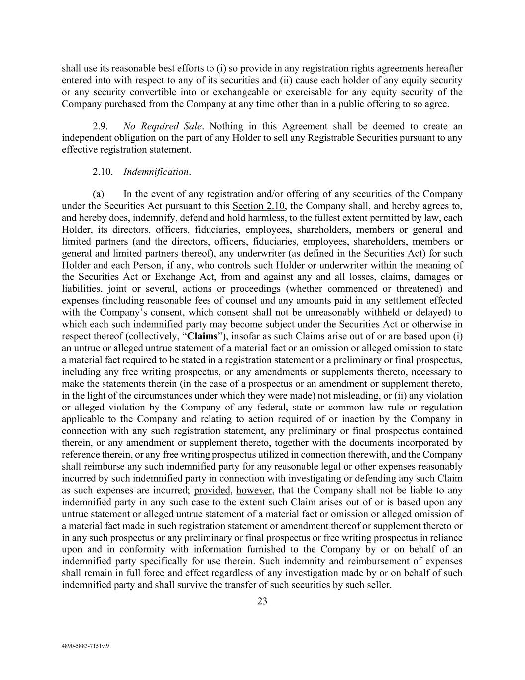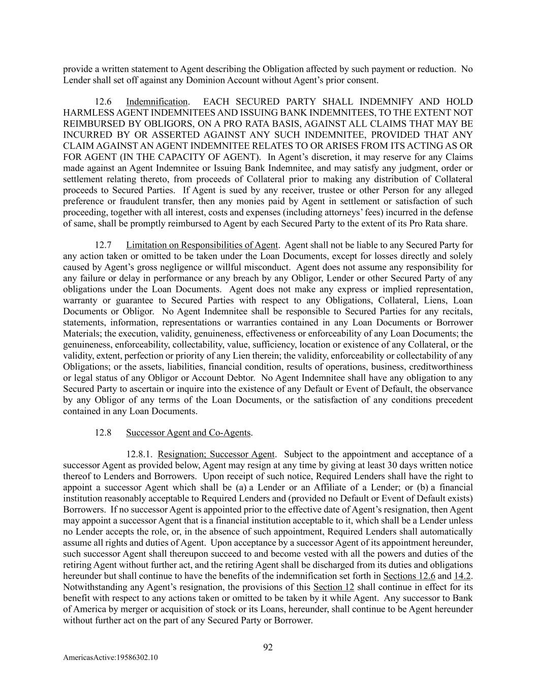 92 AmericasActive:19586302.10 provide a written statement to Agent describing the Obligation affected by such payment or reduction. No Lender shall set off against any Dominion Account without Agent’s prior consent. 12.6 Indemnification. EACH SECURED PARTY SHALL INDEMNIFY AND HOLD HARMLESS AGENT INDEMNITEES AND ISSUING BANK INDEMNITEES, TO THE EXTENT NOT REIMBURSED BY OBLIGORS, ON A PRO RATA BASIS, AGAINST ALL CLAIMS THAT MAY BE INCURRED BY OR ASSERTED AGAINST ANY SUCH INDEMNITEE, PROVIDED THAT ANY CLAIM AGAINST AN AGENT INDEMNITEE RELATES TO OR ARISES FROM ITS ACTING AS OR FOR AGENT (IN THE CAPACITY OF AGENT). In Agent’s discretion, it may reserve for any Claims made against an Agent Indemnitee or Issuing Bank Indemnitee, and may satisfy any judgment, order or settlement relating thereto, from proceeds of Collateral prior to making any distribution of Collateral proceeds to Secured Parties. If Agent is sued by any receiver, trustee or other Person for any alleged preference or fraudulent transfer, then any monies paid by Agent in settlement or satisfaction of such proceeding, together with all interest, costs and expenses (including attorneys’ fees) incurred in the defense of same, shall be promptly reimbursed to Agent by each Secured Party to the extent of its Pro Rata share. 12.7 Limitation on Responsibilities of Agent. Agent shall not be liable to any Secured Party for any action taken or omitted to be taken under the Loan Documents, except for losses directly and solely caused by Agent’s gross negligence or willful misconduct. Agent does not assume any responsibility for any failure or delay in performance or any breach by any Obligor, Lender or other Secured Party of any obligations under the Loan Documents. Agent does not make any express or implied representation, warranty or guarantee to Secured Parties with respect to any Obligations, Collateral, Liens, Loan Documents or Obligor. No Agent Indemnitee shall be responsible to Secured Parties for any recitals, statements, information, representations or warranties contained in any Loan Documents or Borrower Materials; the execution, validity, genuineness, effectiveness or enforceability of any Loan Documents; the genuineness, enforceability, collectability, value, sufficiency, location or existence of any Collateral, or the validity, extent, perfection or priority of any Lien therein; the validity, enforceability or collectability of any Obligations; or the assets, liabilities, financial condition, results of operations, business, creditworthiness or legal status of any Obligor or Account Debtor. No Agent Indemnitee shall have any obligation to any Secured Party to ascertain or inquire into the existence of any Default or Event of Default, the observance by any Obligor of any terms of the Loan Documents, or the satisfaction of any conditions precedent contained in any Loan Documents. 12.8 Successor Agent and Co-Agents. 12.8.1. Resignation; Successor Agent. Subject to the appointment and acceptance of a successor Agent as provided below, Agent may resign at any time by giving at least 30 days written notice thereof to Lenders and Borrowers. Upon receipt of such notice, Required Lenders shall have the right to appoint a successor Agent which shall be (a) a Lender or an Affiliate of a Lender; or (b) a financial institution reasonably acceptable to Required Lenders and (provided no Default or Event of Default exists) Borrowers. If no successor Agent is appointed prior to the effective date of Agent’s resignation, then Agent may appoint a successor Agent that is a financial institution acceptable to it, which shall be a Lender unless no Lender accepts the role, or, in the absence of such appointment, Required Lenders shall automatically assume all rights and duties of Agent. Upon acceptance by a successor Agent of its appointment hereunder, such successor Agent shall thereupon succeed to and become vested with all the powers and duties of the retiring Agent without further act, and the retiring Agent shall be discharged from its duties and obligations hereunder but shall continue to have the benefits of the indemnification set forth in Sections 12.6 and 14.2. Notwithstanding any Agent’s resignation, the provisions of this Section 12 shall continue in effect for its benefit with respect to any actions taken or omitted to be taken by it while Agent. Any successor to Bank of America by merger or acquisition of stock or its Loans, hereunder, shall continue to be Agent hereunder without further act on the part of any Secured Party or Borrower.