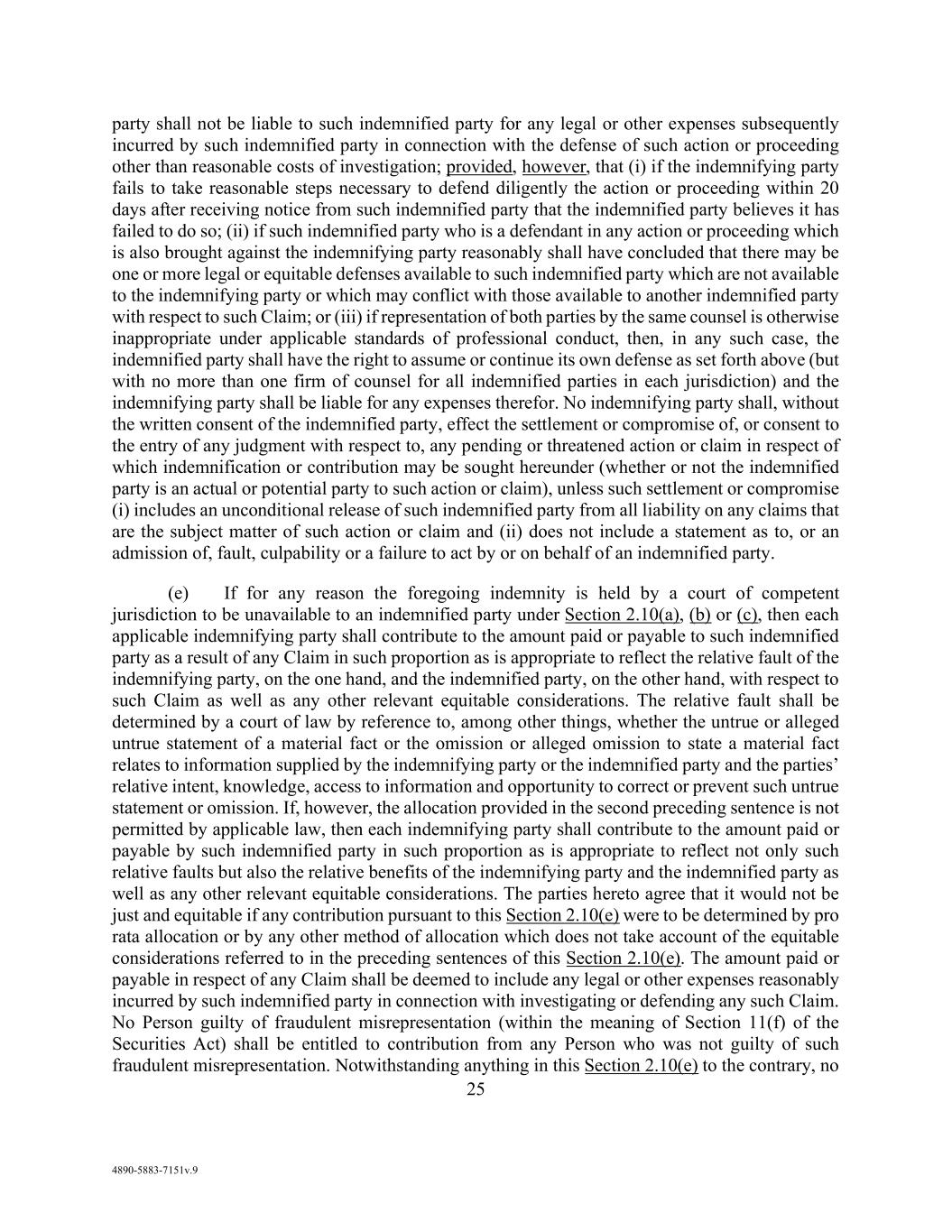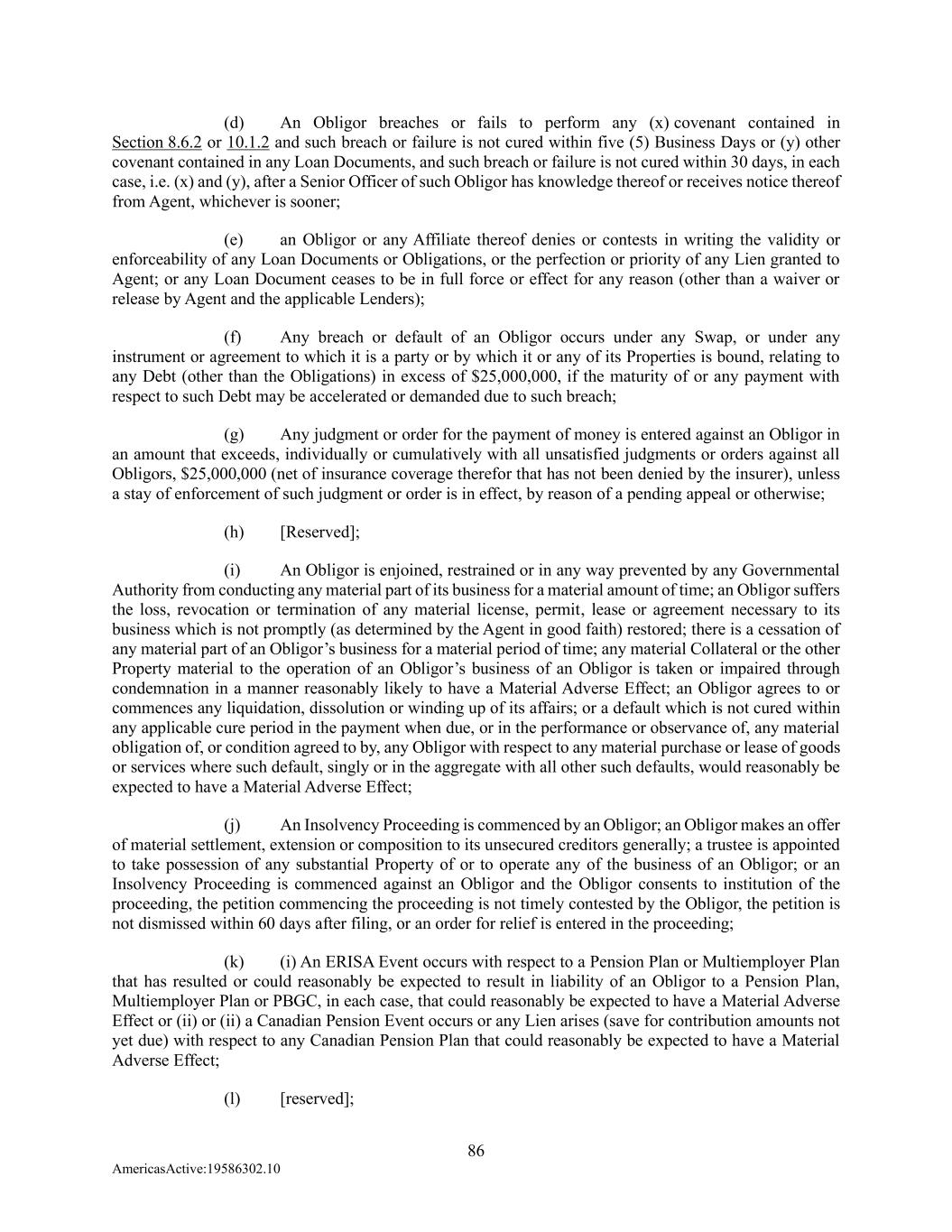 86 AmericasActive:19586302.10 (d) An Obligor breaches or fails to perform any (x) covenant contained in Section 8.6.2 or 10.1.2 and such breach or failure is not cured within five (5) Business Days or (y) other covenant contained in any Loan Documents, and such breach or failure is not cured within 30 days, in each case, i.e. (x) and (y), after a Senior Officer of such Obligor has knowledge thereof or receives notice thereof from Agent, whichever is sooner; (e) an Obligor or any Affiliate thereof denies or contests in writing the validity or enforceability of any Loan Documents or Obligations, or the perfection or priority of any Lien granted to Agent; or any Loan Document ceases to be in full force or effect for any reason (other than a waiver or release by Agent and the applicable Lenders); (f) Any breach or default of an Obligor occurs under any Swap, or under any instrument or agreement to which it is a party or by which it or any of its Properties is bound, relating to any Debt (other than the Obligations) in excess of $25,000,000, if the maturity of or any payment with respect to such Debt may be accelerated or demanded due to such breach; (g) Any judgment or order for the payment of money is entered against an Obligor in an amount that exceeds, individually or cumulatively with all unsatisfied judgments or orders against all Obligors, $25,000,000 (net of insurance coverage therefor that has not been denied by the insurer), unless a stay of enforcement of such judgment or order is in effect, by reason of a pending appeal or otherwise; (h) [Reserved]; (i) An Obligor is enjoined, restrained or in any way prevented by any Governmental Authority from conducting any material part of its business for a material amount of time; an Obligor suffers the loss, revocation or termination of any material license, permit, lease or agreement necessary to its business which is not promptly (as determined by the Agent in good faith) restored; there is a cessation of any material part of an Obligor’s business for a material period of time; any material Collateral or the other Property material to the operation of an Obligor’s business of an Obligor is taken or impaired through condemnation in a manner reasonably likely to have a Material Adverse Effect; an Obligor agrees to or commences any liquidation, dissolution or winding up of its affairs; or a default which is not cured within any applicable cure period in the payment when due, or in the performance or observance of, any material obligation of, or condition agreed to by, any Obligor with respect to any material purchase or lease of goods or services where such default, singly or in the aggregate with all other such defaults, would reasonably be expected to have a Material Adverse Effect; (j) An Insolvency Proceeding is commenced by an Obligor; an Obligor makes an offer of material settlement, extension or composition to its unsecured creditors generally; a trustee is appointed to take possession of any substantial Property of or to operate any of the business of an Obligor; or an Insolvency Proceeding is commenced against an Obligor and the Obligor consents to institution of the proceeding, the petition commencing the proceeding is not timely contested by the Obligor, the petition is not dismissed within 60 days after filing, or an order for relief is entered in the proceeding; (k) (i) An ERISA Event occurs with respect to a Pension Plan or Multiemployer Plan that has resulted or could reasonably be expected to result in liability of an Obligor to a Pension Plan, Multiemployer Plan or PBGC, in each case, that could reasonably be expected to have a Material Adverse Effect or (ii) or (ii) a Canadian Pension Event occurs or any Lien arises (save for contribution amounts not yet due) with respect to any Canadian Pension Plan that could reasonably be expected to have a Material Adverse Effect; (l) [reserved];