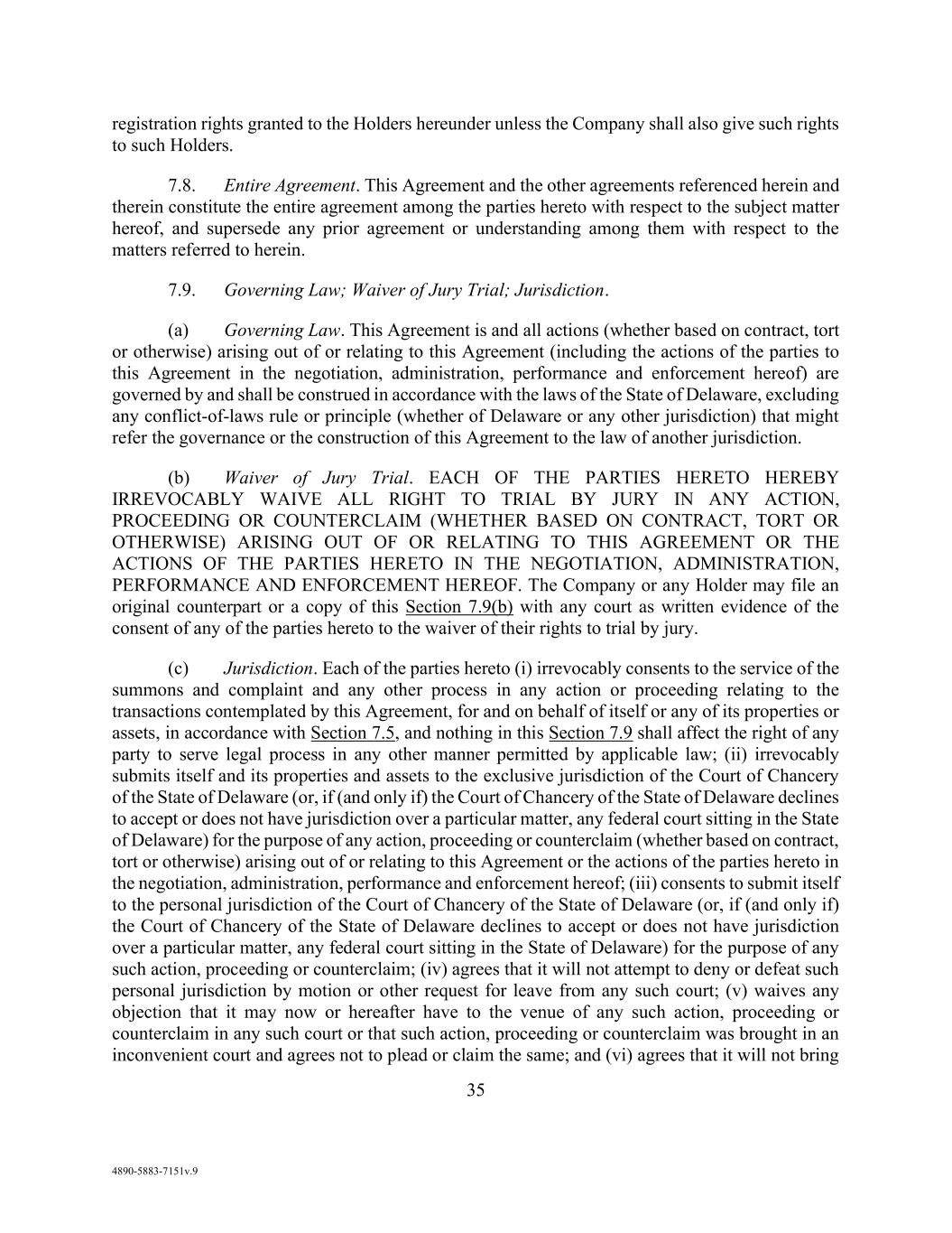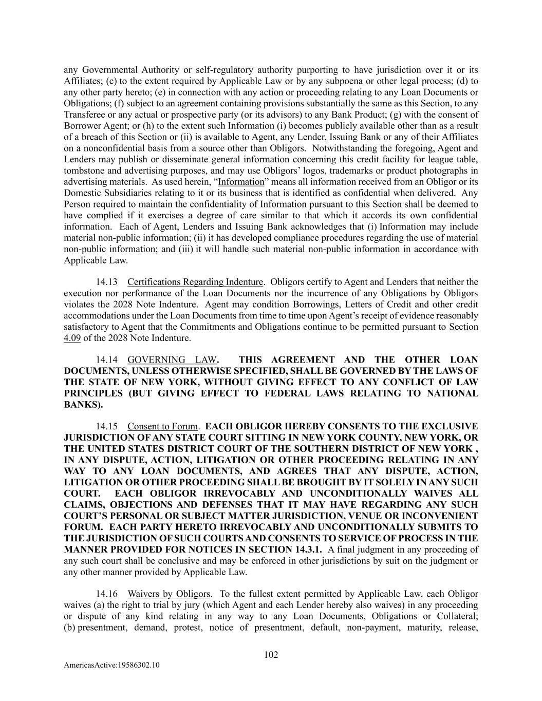 102 AmericasActive:19586302.10 any Governmental Authority or self-regulatory authority purporting to have jurisdiction over it or its Affiliates; (c) to the extent required by Applicable Law or by any subpoena or other legal process; (d) to any other party hereto; (e) in connection with any action or proceeding relating to any Loan Documents or Obligations; (f) subject to an agreement containing provisions substantially the same as this Section, to any Transferee or any actual or prospective party (or its advisors) to any Bank Product; (g) with the consent of Borrower Agent; or (h) to the extent such Information (i) becomes publicly available other than as a result of a breach of this Section or (ii) is available to Agent, any Lender, Issuing Bank or any of their Affiliates on a nonconfidential basis from a source other than Obligors. Notwithstanding the foregoing, Agent and Lenders may publish or disseminate general information concerning this credit facility for league table, tombstone and advertising purposes, and may use Obligors’ logos, trademarks or product photographs in advertising materials. As used herein, “Information” means all information received from an Obligor or its Domestic Subsidiaries relating to it or its business that is identified as confidential when delivered. Any Person required to maintain the confidentiality of Information pursuant to this Section shall be deemed to have complied if it exercises a degree of care similar to that which it accords its own confidential information. Each of Agent, Lenders and Issuing Bank acknowledges that (i) Information may include material non-public information; (ii) it has developed compliance procedures regarding the use of material non-public information; and (iii) it will handle such material non-public information in accordance with Applicable Law. 14.13 Certifications Regarding Indenture. Obligors certify to Agent and Lenders that neither the execution nor performance of the Loan Documents nor the incurrence of any Obligations by Obligors violates the 2028 Note Indenture. Agent may condition Borrowings, Letters of Credit and other credit accommodations under the Loan Documents from time to time upon Agent’s receipt of evidence reasonably satisfactory to Agent that the Commitments and Obligations continue to be permitted pursuant to Section 4.09 of the 2028 Note Indenture. 14.14 GOVERNING LAW. THIS AGREEMENT AND THE OTHER LOAN DOCUMENTS, UNLESS OTHERWISE SPECIFIED, SHALL BE GOVERNED BY THE LAWS OF THE STATE OF NEW YORK, WITHOUT GIVING EFFECT TO ANY CONFLICT OF LAW PRINCIPLES (BUT GIVING EFFECT TO FEDERAL LAWS RELATING TO NATIONAL BANKS). 14.15 Consent to Forum. EACH OBLIGOR HEREBY CONSENTS TO THE EXCLUSIVE JURISDICTION OF ANY STATE COURT SITTING IN NEW YORK COUNTY, NEW YORK, OR THE UNITED STATES DISTRICT COURT OF THE SOUTHERN DISTRICT OF NEW YORK , IN ANY DISPUTE, ACTION, LITIGATION OR OTHER PROCEEDING RELATING IN ANY WAY TO ANY LOAN DOCUMENTS, AND AGREES THAT ANY DISPUTE, ACTION, LITIGATION OR OTHER PROCEEDING SHALL BE BROUGHT BY IT SOLELY IN ANY SUCH COURT. EACH OBLIGOR IRREVOCABLY AND UNCONDITIONALLY WAIVES ALL CLAIMS, OBJECTIONS AND DEFENSES THAT IT MAY HAVE REGARDING ANY SUCH COURT’S PERSONAL OR SUBJECT MATTER JURISDICTION, VENUE OR INCONVENIENT FORUM. EACH PARTY HERETO IRREVOCABLY AND UNCONDITIONALLY SUBMITS TO THE JURISDICTION OF SUCH COURTS AND CONSENTS TO SERVICE OF PROCESS IN THE MANNER PROVIDED FOR NOTICES IN SECTION 14.3.1. A final judgment in any proceeding of any such court shall be conclusive and may be enforced in other jurisdictions by suit on the judgment or any other manner provided by Applicable Law. 14.16 Waivers by Obligors. To the fullest extent permitted by Applicable Law, each Obligor waives (a) the right to trial by jury (which Agent and each Lender hereby also waives) in any proceeding or dispute of any kind relating in any way to any Loan Documents, Obligations or Collateral; (b) presentment, demand, protest, notice of presentment, default, non-payment, maturity, release,