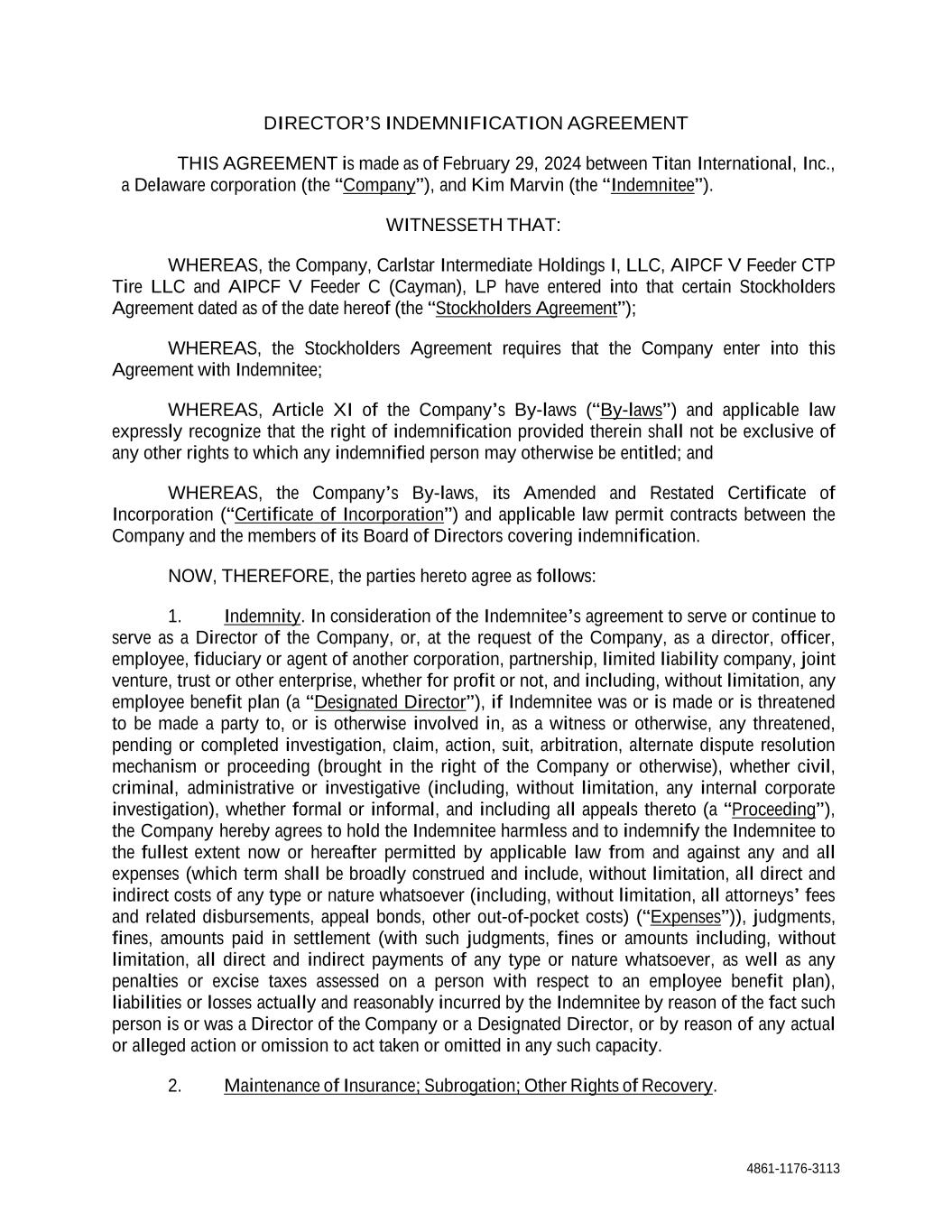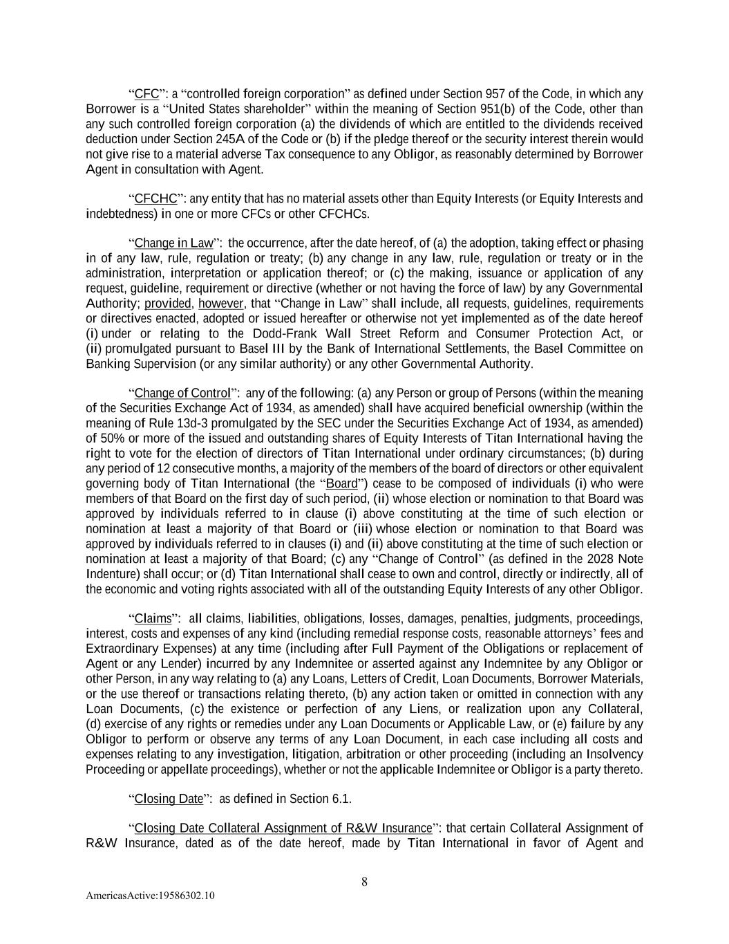 8 AmericasActive:19586302.10 “CFC”: a “controlled foreign corporation” as defined under Section 957 of the Code, in which any Borrower is a “United States shareholder” within the meaning of Section 951(b) of the Code, other than any such controlled foreign corporation (a) the dividends of which are entitled to the dividends received deduction under Section 245A of the Code or (b) if the pledge thereof or the security interest therein would not give rise to a material adverse Tax consequence to any Obligor, as reasonably determined by Borrower Agent in consultation with Agent. “CFCHC”: any entity that has no material assets other than Equity Interests (or Equity Interests and indebtedness) in one or more CFCs or other CFCHCs. “Change in Law”: the occurrence, after the date hereof, of (a) the adoption, taking effect or phasing in of any law, rule, regulation or treaty; (b) any change in any law, rule, regulation or treaty or in the administration, interpretation or application thereof; or (c) the making, issuance or application of any request, guideline, requirement or directive (whether or not having the force of law) by any Governmental Authority; provided, however, that “Change in Law” shall include, all requests, guidelines, requirements or directives enacted, adopted or issued hereafter or otherwise not yet implemented as of the date hereof (i) under or relating to the Dodd-Frank Wall Street Reform and Consumer Protection Act, or (ii) promulgated pursuant to Basel III by the Bank of International Settlements, the Basel Committee on Banking Supervision (or any similar authority) or any other Governmental Authority. “Change of Control”: any of the following: (a) any Person or group of Persons (within the meaning of the Securities Exchange Act of 1934, as amended) shall have acquired beneficial ownership (within the meaning of Rule 13d-3 promulgated by the SEC under the Securities Exchange Act of 1934, as amended) of 50% or more of the issued and outstanding shares of Equity Interests of Titan International having the right to vote for the election of directors of Titan International under ordinary circumstances; (b) during any period of 12 consecutive months, a majority of the members of the board of directors or other equivalent governing body of Titan International (the “Board”) cease to be composed of individuals (i) who were members of that Board on the first day of such period, (ii) whose election or nomination to that Board was approved by individuals referred to in clause (i) above constituting at the time of such election or nomination at least a majority of that Board or (iii) whose election or nomination to that Board was approved by individuals referred to in clauses (i) and (ii) above constituting at the time of such election or nomination at least a majority of that Board; (c) any “Change of Control” (as defined in the 2028 Note Indenture) shall occur; or (d) Titan International shall cease to own and control, directly or indirectly, all of the economic and voting rights associated with all of the outstanding Equity Interests of any other Obligor. “Claims”: all claims, liabilities, obligations, losses, damages, penalties, judgments, proceedings, interest, costs and expenses of any kind (including remedial response costs, reasonable attorneys’ fees and Extraordinary Expenses) at any time (including after Full Payment of the Obligations or replacement of Agent or any Lender) incurred by any Indemnitee or asserted against any Indemnitee by any Obligor or other Person, in any way relating to (a) any Loans, Letters of Credit, Loan Documents, Borrower Materials, or the use thereof or transactions relating thereto, (b) any action taken or omitted in connection with any Loan Documents, (c) the existence or perfection of any Liens, or realization upon any Collateral, (d) exercise of any rights or remedies under any Loan Documents or Applicable Law, or (e) failure by any Obligor to perform or observe any terms of any Loan Document, in each case including all costs and expenses relating to any investigation, litigation, arbitration or other proceeding (including an Insolvency Proceeding or appellate proceedings), whether or not the applicable Indemnitee or Obligor is a party thereto. “Closing Date”: as defined in Section 6.1. “Closing Date Collateral Assignment of R&W Insurance”: that certain Collateral Assignment of R&W Insurance, dated as of the date hereof, made by Titan International in favor of Agent and