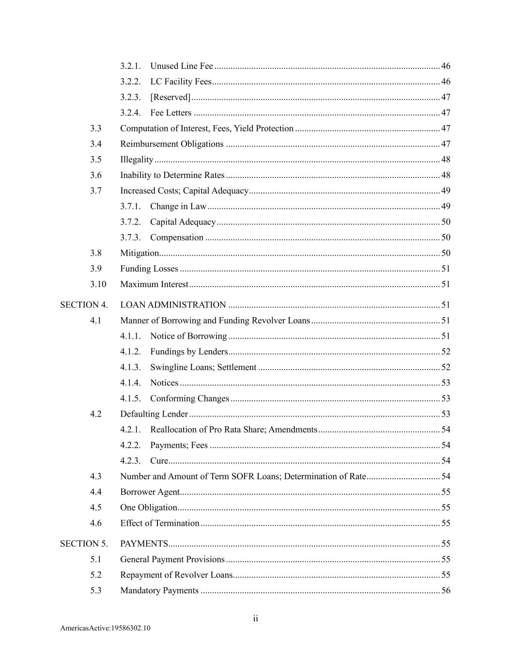 ii AmericasActive:19586302.10 3.2.1. Unused Line Fee .................................................................................................. 46 3.2.2. LC Facility Fees ................................................................................................... 46 3.2.3. [Reserved] ............................................................................................................ 47 3.2.4. Fee Letters ........................................................................................................... 47 3.3 Computation of Interest, Fees, Yield Protection ............................................................... 47 3.4 Reimbursement Obligations ............................................................................................. 47 3.5 Illegality ............................................................................................................................ 48 3.6 Inability to Determine Rates ............................................................................................. 48 3.7 Increased Costs; Capital Adequacy ................................................................................... 49 3.7.1. Change in Law ..................................................................................................... 49 3.7.2. Capital Adequacy ................................................................................................. 50 3.7.3. Compensation ...................................................................................................... 50 3.8 Mitigation.......................................................................................................................... 50 3.9 Funding Losses ................................................................................................................. 51 3.10 Maximum Interest ............................................................................................................. 51 SECTION 4. LOAN ADMINISTRATION ............................................................................................ 51 4.1 Manner of Borrowing and Funding Revolver Loans ........................................................ 51 4.1.1. Notice of Borrowing ............................................................................................ 51 4.1.2. Fundings by Lenders ............................................................................................ 52 4.1.3. Swingline Loans; Settlement ............................................................................... 52 4.1.4. Notices ................................................................................................................. 53 4.1.5. Conforming Changes ........................................................................................... 53 4.2 Defaulting Lender ............................................................................................................. 53 4.2.1. Reallocation of Pro Rata Share; Amendments ..................................................... 54 4.2.2. Payments; Fees .................................................................................................... 54 4.2.3. Cure ...................................................................................................................... 54 4.3 Number and Amount of Term SOFR Loans; Determination of Rate ................................ 54 4.4 Borrower Agent ................................................................................................................. 55 4.5 One Obligation .................................................................................................................. 55 4.6 Effect of Termination ........................................................................................................ 55 SECTION 5. PAYMENTS ...................................................................................................................... 55 5.1 General Payment Provisions ............................................................................................. 55 5.2 Repayment of Revolver Loans .......................................................................................... 55 5.3 Mandatory Payments ........................................................................................................ 56