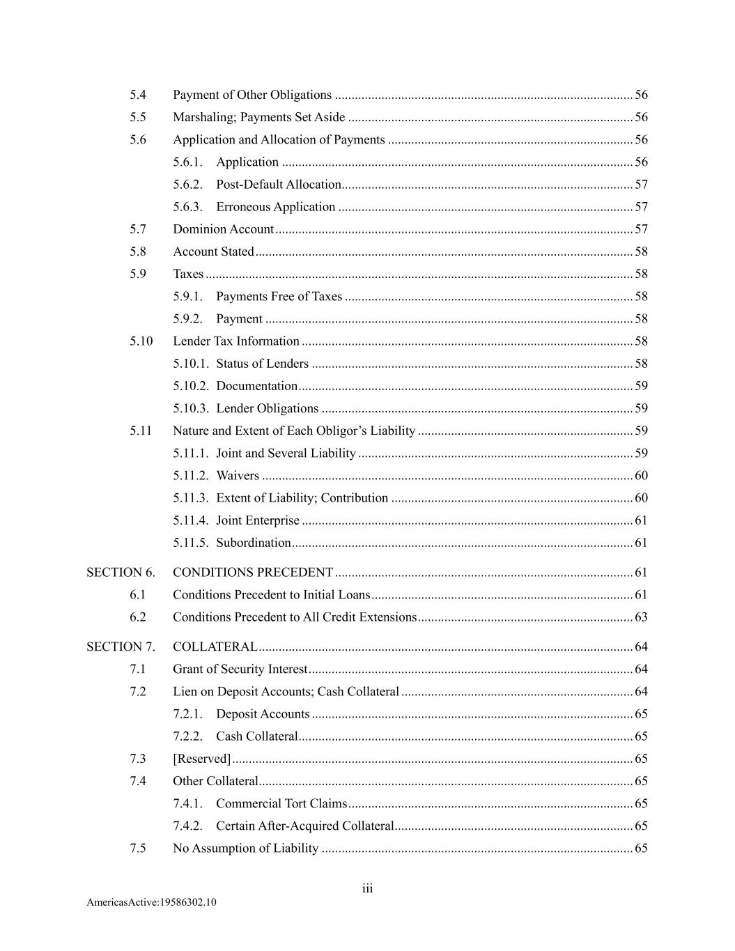 iii AmericasActive:19586302.10 5.4 Payment of Other Obligations .......................................................................................... 56 5.5 Marshaling; Payments Set Aside ...................................................................................... 56 5.6 Application and Allocation of Payments .......................................................................... 56 5.6.1. Application .......................................................................................................... 56 5.6.2. Post-Default Allocation ........................................................................................ 57 5.6.3. Erroneous Application ......................................................................................... 57 5.7 Dominion Account ............................................................................................................ 57 5.8 Account Stated .................................................................................................................. 58 5.9 Taxes ................................................................................................................................. 58 5.9.1. Payments Free of Taxes ....................................................................................... 58 5.9.2. Payment ............................................................................................................... 58 5.10 Lender Tax Information .................................................................................................... 58 5.10.1. Status of Lenders ................................................................................................. 58 5.10.2. Documentation ..................................................................................................... 59 5.10.3. Lender Obligations .............................................................................................. 59 5.11 Nature and Extent of Each Obligor’s Liability ................................................................. 59 5.11.1. Joint and Several Liability ................................................................................... 59 5.11.2. Waivers ................................................................................................................ 60 5.11.3. Extent of Liability; Contribution ......................................................................... 60 5.11.4. Joint Enterprise .................................................................................................... 61 5.11.5. Subordination ....................................................................................................... 61 SECTION 6. CONDITIONS PRECEDENT .......................................................................................... 61 6.1 Conditions Precedent to Initial Loans ............................................................................... 61 6.2 Conditions Precedent to All Credit Extensions ................................................................. 63 SECTION 7. COLLATERAL ................................................................................................................. 64 7.1 Grant of Security Interest .................................................................................................. 64 7.2 Lien on Deposit Accounts; Cash Collateral ...................................................................... 64 7.2.1. Deposit Accounts ................................................................................................. 65 7.2.2. Cash Collateral ..................................................................................................... 65 7.3 [Reserved] ......................................................................................................................... 65 7.4 Other Collateral ................................................................................................................. 65 7.4.1. Commercial Tort Claims ...................................................................................... 65 7.4.2. Certain After-Acquired Collateral ........................................................................ 65 7.5 No Assumption of Liability .............................................................................................. 65