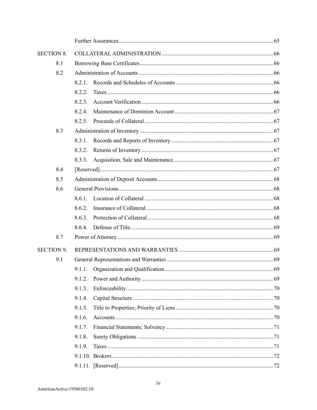 iv AmericasActive:19586302.10 Further Assurances ............................................................................................................ 65 SECTION 8. COLLATERAL ADMINISTRATION .............................................................................. 66 8.1 Borrowing Base Certificates ............................................................................................. 66 8.2 Administration of Accounts .............................................................................................. 66 8.2.1. Records and Schedules of Accounts .................................................................... 66 8.2.2. Taxes .................................................................................................................... 66 8.2.3. Account Verification ............................................................................................ 66 8.2.4. Maintenance of Dominion Account ..................................................................... 67 8.2.5. Proceeds of Collateral .......................................................................................... 67 8.3 Administration of Inventory ............................................................................................. 67 8.3.1. Records and Reports of Inventory ....................................................................... 67 8.3.2. Returns of Inventory ............................................................................................ 67 8.3.3. Acquisition, Sale and Maintenance...................................................................... 67 8.4 [Reserved] ......................................................................................................................... 67 8.5 Administration of Deposit Accounts ................................................................................. 68 8.6 General Provisions ............................................................................................................ 68 8.6.1. Location of Collateral .......................................................................................... 68 8.6.2. Insurance of Collateral ......................................................................................... 68 8.6.3. Protection of Collateral ........................................................................................ 68 8.6.4. Defense of Title .................................................................................................... 69 8.7 Power of Attorney ............................................................................................................. 69 SECTION 9. REPRESENTATIONS AND WARRANTIES .................................................................. 69 9.1 General Representations and Warranties .......................................................................... 69 9.1.1. Organization and Qualification ............................................................................ 69 9.1.2. Power and Authority ............................................................................................ 69 9.1.3. Enforceability....................................................................................................... 70 9.1.4. Capital Structure .................................................................................................. 70 9.1.5. Title to Properties; Priority of Liens .................................................................... 70 9.1.6. Accounts .............................................................................................................. 70 9.1.7. Financial Statements; Solvency ........................................................................... 71 9.1.8. Surety Obligations ............................................................................................... 71 9.1.9. Taxes .................................................................................................................... 71 9.1.10. Brokers ................................................................................................................. 72 9.1.11. [Reserved] ............................................................................................................ 72