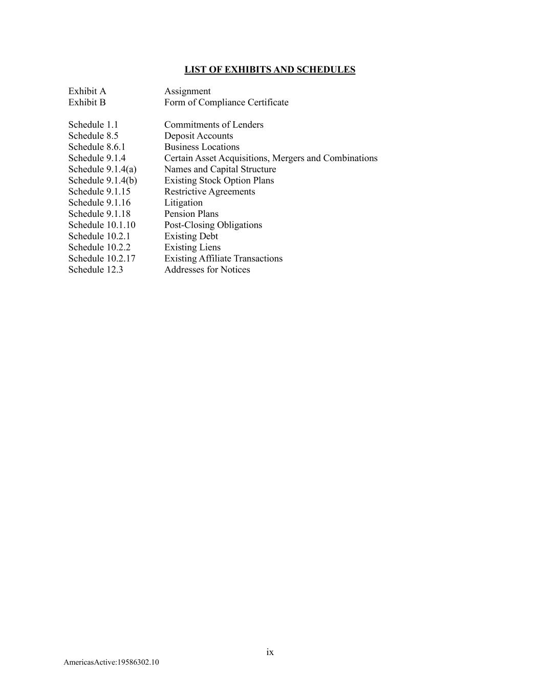 ix AmericasActive:19586302.10 LIST OF EXHIBITS AND SCHEDULES Exhibit A Assignment Exhibit B Form of Compliance Certificate Schedule 1.1 Commitments of Lenders Schedule 8.5 Deposit Accounts Schedule 8.6.1 Business Locations Schedule 9.1.4 Certain Asset Acquisitions, Mergers and Combinations Schedule 9.1.4(a) Names and Capital Structure Schedule 9.1.4(b) Existing Stock Option Plans Schedule 9.1.15 Restrictive Agreements Schedule 9.1.16 Litigation Schedule 9.1.18 Pension Plans Schedule 10.1.10 Post-Closing Obligations Schedule 10.2.1 Existing Debt Schedule 10.2.2 Existing Liens Schedule 10.2.17 Existing Affiliate Transactions Schedule 12.3 Addresses for Notices