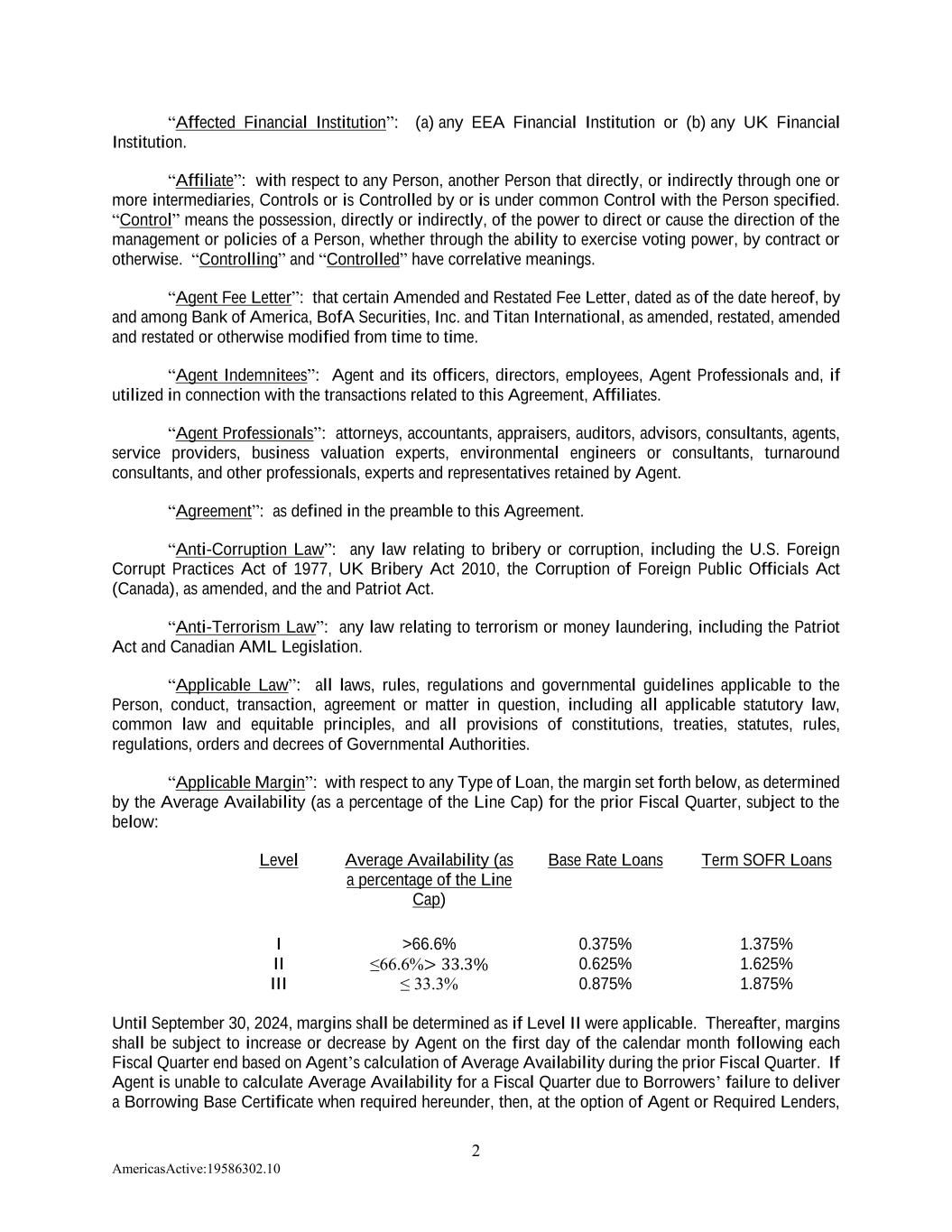 2 AmericasActive:19586302.10 “Affected Financial Institution”: (a) any EEA Financial Institution or (b) any UK Financial Institution. “Affiliate”: with respect to any Person, another Person that directly, or indirectly through one or more intermediaries, Controls or is Controlled by or is under common Control with the Person specified. “Control” means the possession, directly or indirectly, of the power to direct or cause the direction of the management or policies of a Person, whether through the ability to exercise voting power, by contract or otherwise. “Controlling” and “Controlled” have correlative meanings. “Agent Fee Letter”: that certain Amended and Restated Fee Letter, dated as of the date hereof, by and among Bank of America, BofA Securities, Inc. and Titan International, as amended, restated, amended and restated or otherwise modified from time to time. “Agent Indemnitees”: Agent and its officers, directors, employees, Agent Professionals and, if utilized in connection with the transactions related to this Agreement, Affiliates. “Agent Professionals”: attorneys, accountants, appraisers, auditors, advisors, consultants, agents, service providers, business valuation experts, environmental engineers or consultants, turnaround consultants, and other professionals, experts and representatives retained by Agent. “Agreement”: as defined in the preamble to this Agreement. “Anti-Corruption Law”: any law relating to bribery or corruption, including the U.S. Foreign Corrupt Practices Act of 1977, UK Bribery Act 2010, the Corruption of Foreign Public Officials Act (Canada), as amended, and the and Patriot Act. “Anti-Terrorism Law”: any law relating to terrorism or money laundering, including the Patriot Act and Canadian AML Legislation. “Applicable Law”: all laws, rules, regulations and governmental guidelines applicable to the Person, conduct, transaction, agreement or matter in question, including all applicable statutory law, common law and equitable principles, and all provisions of constitutions, treaties, statutes, rules, regulations, orders and decrees of Governmental Authorities. “Applicable Margin”: with respect to any Type of Loan, the margin set forth below, as determined by the Average Availability (as a percentage of the Line Cap) for the prior Fiscal Quarter, subject to the below: Level Average Availability (as a percentage of the Line Cap) Base Rate Loans Term SOFR Loans I >66.6% 0.375% 1.375% II ≤66.6%> 33.3% 0.625% 1.625% III ≤ 33.3% 0.875% 1.875% Until September 30, 2024, margins shall be determined as if Level II were applicable. Thereafter, margins shall be subject to increase or decrease by Agent on the first day of the calendar month following each Fiscal Quarter end based on Agent’s calculation of Average Availability during the prior Fiscal Quarter. If Agent is unable to calculate Average Availability for a Fiscal Quarter due to Borrowers’ failure to deliver a Borrowing Base Certificate when required hereunder, then, at the option of Agent or Required Lenders,