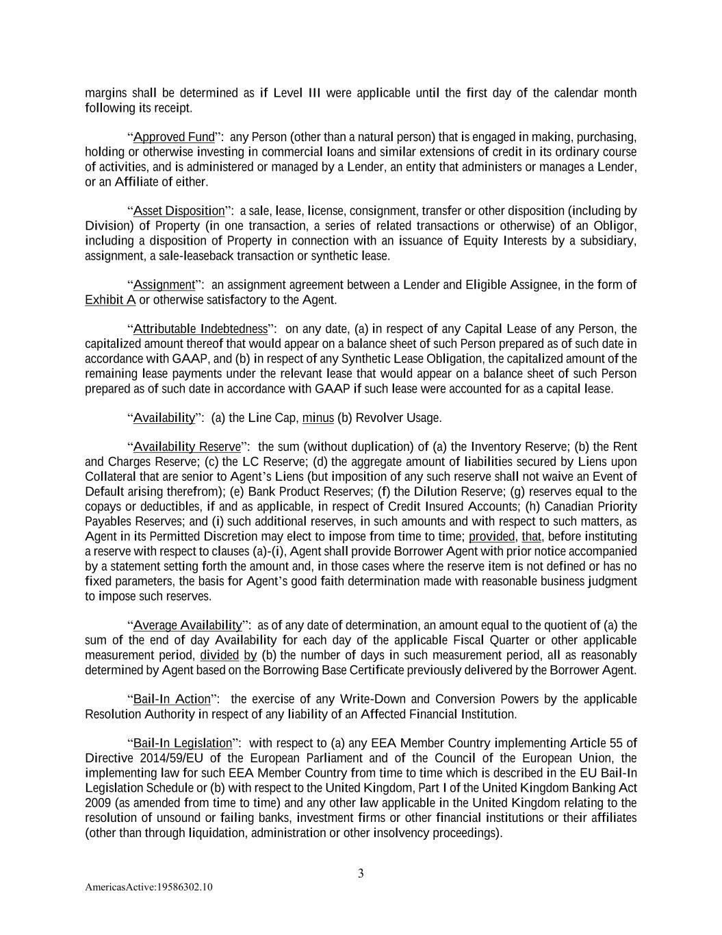 3 AmericasActive:19586302.10 margins shall be determined as if Level III were applicable until the first day of the calendar month following its receipt. “Approved Fund”: any Person (other than a natural person) that is engaged in making, purchasing, holding or otherwise investing in commercial loans and similar extensions of credit in its ordinary course of activities, and is administered or managed by a Lender, an entity that administers or manages a Lender, or an Affiliate of either. “Asset Disposition”: a sale, lease, license, consignment, transfer or other disposition (including by Division) of Property (in one transaction, a series of related transactions or otherwise) of an Obligor, including a disposition of Property in connection with an issuance of Equity Interests by a subsidiary, assignment, a sale-leaseback transaction or synthetic lease. “Assignment”: an assignment agreement between a Lender and Eligible Assignee, in the form of Exhibit A or otherwise satisfactory to the Agent. “Attributable Indebtedness”: on any date, (a) in respect of any Capital Lease of any Person, the capitalized amount thereof that would appear on a balance sheet of such Person prepared as of such date in accordance with GAAP, and (b) in respect of any Synthetic Lease Obligation, the capitalized amount of the remaining lease payments under the relevant lease that would appear on a balance sheet of such Person prepared as of such date in accordance with GAAP if such lease were accounted for as a capital lease. “Availability”: (a) the Line Cap, minus (b) Revolver Usage. “Availability Reserve”: the sum (without duplication) of (a) the Inventory Reserve; (b) the Rent and Charges Reserve; (c) the LC Reserve; (d) the aggregate amount of liabilities secured by Liens upon Collateral that are senior to Agent’s Liens (but imposition of any such reserve shall not waive an Event of Default arising therefrom); (e) Bank Product Reserves; (f) the Dilution Reserve; (g) reserves equal to the copays or deductibles, if and as applicable, in respect of Credit Insured Accounts; (h) Canadian Priority Payables Reserves; and (i) such additional reserves, in such amounts and with respect to such matters, as Agent in its Permitted Discretion may elect to impose from time to time; provided, that, before instituting a reserve with respect to clauses (a)-(i), Agent shall provide Borrower Agent with prior notice accompanied by a statement setting forth the amount and, in those cases where the reserve item is not defined or has no fixed parameters, the basis for Agent’s good faith determination made with reasonable business judgment to impose such reserves. “Average Availability”: as of any date of determination, an amount equal to the quotient of (a) the sum of the end of day Availability for each day of the applicable Fiscal Quarter or other applicable measurement period, divided by (b) the number of days in such measurement period, all as reasonably determined by Agent based on the Borrowing Base Certificate previously delivered by the Borrower Agent. “Bail-In Action”: the exercise of any Write-Down and Conversion Powers by the applicable Resolution Authority in respect of any liability of an Affected Financial Institution. “Bail-In Legislation”: with respect to (a) any EEA Member Country implementing Article 55 of Directive 2014/59/EU of the European Parliament and of the Council of the European Union, the implementing law for such EEA Member Country from time to time which is described in the EU Bail-In Legislation Schedule or (b) with respect to the United Kingdom, Part I of the United Kingdom Banking Act 2009 (as amended from time to time) and any other law applicable in the United Kingdom relating to the resolution of unsound or failing banks, investment firms or other financial institutions or their affiliates (other than through liquidation, administration or other insolvency proceedings).