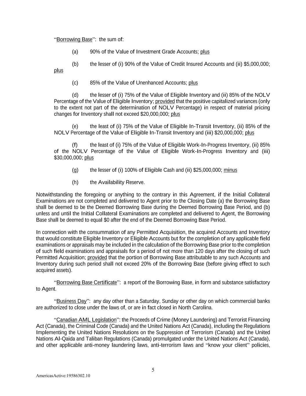 5 AmericasActive:19586302.10 “Borrowing Base”: the sum of: (a) 90% of the Value of Investment Grade Accounts; plus (b) the lesser of (i) 90% of the Value of Credit Insured Accounts and (ii) $5,000,000; plus (c) 85% of the Value of Unenhanced Accounts; plus (d) the lesser of (i) 75% of the Value of Eligible Inventory and (ii) 85% of the NOLV Percentage of the Value of Eligible Inventory; provided that the positive capitalized variances (only to the extent not part of the determination of NOLV Percentage) in respect of material pricing changes for Inventory shall not exceed $20,000,000; plus (e) the least of (i) 75% of the Value of Eligible In-Transit Inventory, (ii) 85% of the NOLV Percentage of the Value of Eligible In-Transit Inventory and (iii) $20,000,000; plus (f) the least of (i) 75% of the Value of Eligible Work-In-Progress Inventory, (ii) 85% of the NOLV Percentage of the Value of Eligible Work-In-Progress Inventory and (iii) $30,000,000; plus (g) the lesser of (i) 100% of Eligible Cash and (ii) $25,000,000; minus (h) the Availability Reserve. Notwithstanding the foregoing or anything to the contrary in this Agreement, if the Initial Collateral Examinations are not completed and delivered to Agent prior to the Closing Date (a) the Borrowing Base shall be deemed to be the Deemed Borrowing Base during the Deemed Borrowing Base Period, and (b) unless and until the Initial Collateral Examinations are completed and delivered to Agent, the Borrowing Base shall be deemed to equal $0 after the end of the Deemed Borrowing Base Period. In connection with the consummation of any Permitted Acquisition, the acquired Accounts and Inventory that would constitute Eligible Inventory or Eligible Accounts but for the completion of any applicable field examinations or appraisals may be included in the calculation of the Borrowing Base prior to the completion of such field examinations and appraisals for a period of not more than 120 days after the closing of such Permitted Acquisition; provided that the portion of Borrowing Base attributable to any such Accounts and Inventory during such period shall not exceed 20% of the Borrowing Base (before giving effect to such acquired assets). “Borrowing Base Certificate”: a report of the Borrowing Base, in form and substance satisfactory to Agent. “Business Day”: any day other than a Saturday, Sunday or other day on which commercial banks are authorized to close under the laws of, or are in fact closed in North Carolina. “Canadian AML Legislation”: the Proceeds of Crime (Money Laundering) and Terrorist Financing Act (Canada), the Criminal Code (Canada) and the United Nations Act (Canada), including the Regulations Implementing the United Nations Resolutions on the Suppression of Terrorism (Canada) and the United Nations Al-Qaida and Taliban Regulations (Canada) promulgated under the United Nations Act (Canada), and other applicable anti-money laundering laws, anti-terrorism laws and “know your client” policies,