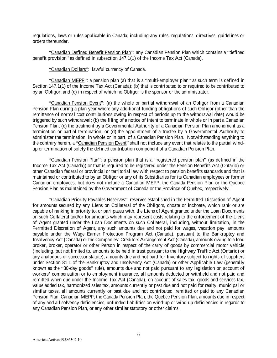6 AmericasActive:19586302.10 regulations, laws or rules applicable in Canada, including any rules, regulations, directives, guidelines or orders thereunder. “Canadian Defined Benefit Pension Plan”: any Canadian Pension Plan which contains a “defined benefit provision” as defined in subsection 147.1(1) of the Income Tax Act (Canada). “Canadian Dollars”: lawful currency of Canada. “Canadian MEPP”: a pension plan (a) that is a “multi-employer plan” as such term is defined in Section 147.1(1) of the Income Tax Act (Canada); (b) that is contributed to or required to be contributed to by an Obligor; and (c) in respect of which no Obligor is the sponsor or the administrator. “Canadian Pension Event”: (a) the whole or partial withdrawal of an Obligor from a Canadian Pension Plan during a plan year where any additional funding obligations of such Obligor (other than the remittance of normal cost contributions owing in respect of periods up to the withdrawal date) would be triggered by such withdrawal; (b) the filing of a notice of intent to terminate in whole or in part a Canadian Pension Plan; (c) the treatment by a Governmental Authority of a Canadian Pension Plan amendment as a termination or partial termination; or (d) the appointment of a trustee by a Governmental Authority to administer the termination, in whole or in part, of a Canadian Pension Plan. Notwithstanding anything to the contrary herein, a “Canadian Pension Event” shall not include any event that relates to the partial wind- up or termination of solely the defined contribution component of a Canadian Pension Plan. “Canadian Pension Plan”: a pension plan that is a “registered pension plan” (as defined in the Income Tax Act (Canada)) or that is required to be registered under the Pension Benefits Act (Ontario) or other Canadian federal or provincial or territorial law with respect to pension benefits standards and that is maintained or contributed to by an Obligor or any of its Subsidiaries for its Canadian employees or former Canadian employees, but does not include a Canadian MEPP, the Canada Pension Plan or the Quebec Pension Plan as maintained by the Government of Canada or the Province of Quebec, respectively. “Canadian Priority Payables Reserves”: reserves established in the Permitted Discretion of Agent for amounts secured by any Liens on Collateral of the Obligors, choate or inchoate, which rank or are capable of ranking in priority to, or pari passu with, the Liens of Agent granted under the Loan Documents on such Collateral and/or for amounts which may represent costs relating to the enforcement of the Liens of Agent granted under the Loan Documents on such Collateral, including, without limitation, in the Permitted Discretion of Agent, any such amounts due and not paid for wages, vacation pay, amounts payable under the Wage Earner Protection Program Act (Canada), pursuant to the Bankruptcy and Insolvency Act (Canada) or the Companies’ Creditors Arrangement Act (Canada), amounts owing to a load broker, broker, operator or other Person in respect of the carry of goods by commercial motor vehicle (including, but not limited to, amounts to be held in trust pursuant to the Highway Traffic Act (Ontario) or any analogous or successor statute), amounts due and not paid for Inventory subject to rights of suppliers under Section 81.1 of the Bankruptcy and Insolvency Act (Canada) or other Applicable Law (generally known as the “30-day goods” rule), amounts due and not paid pursuant to any legislation on account of workers’ compensation or to employment insurance, all amounts deducted or withheld and not paid and remitted when due under the Income Tax Act (Canada), on account of sales tax, goods and services tax, value added tax, harmonized sales tax, amounts currently or past due and not paid for realty, municipal or similar taxes, all amounts currently or past due and not contributed, remitted or paid to any Canadian Pension Plan, Canadian MEPP, the Canada Pension Plan, the Quebec Pension Plan, amounts due in respect of any and all solvency deficiencies, unfunded liabilities on wind-up or wind-up deficiencies in regards to any Canadian Pension Plan, or any other similar statutory or other claims.